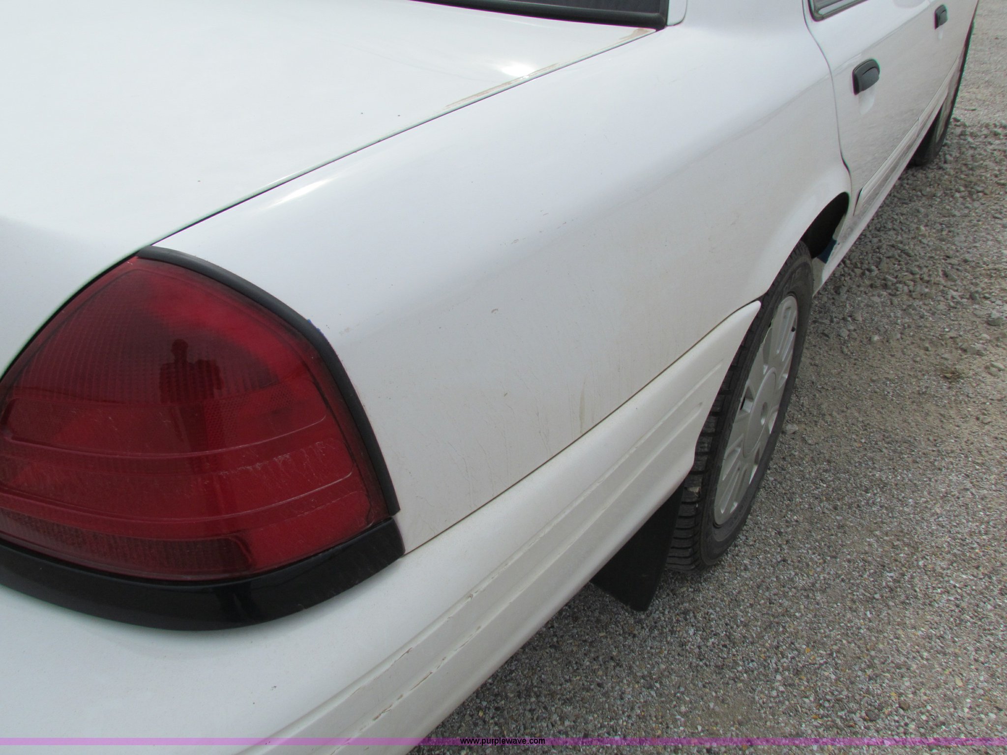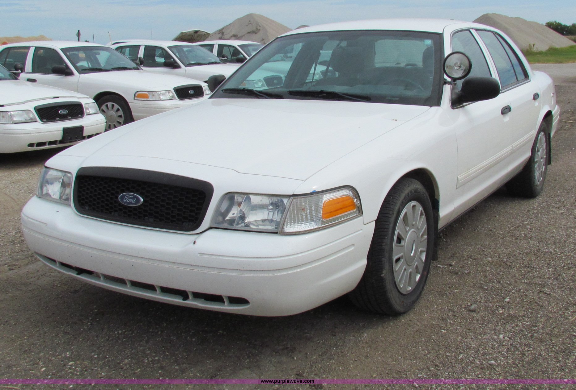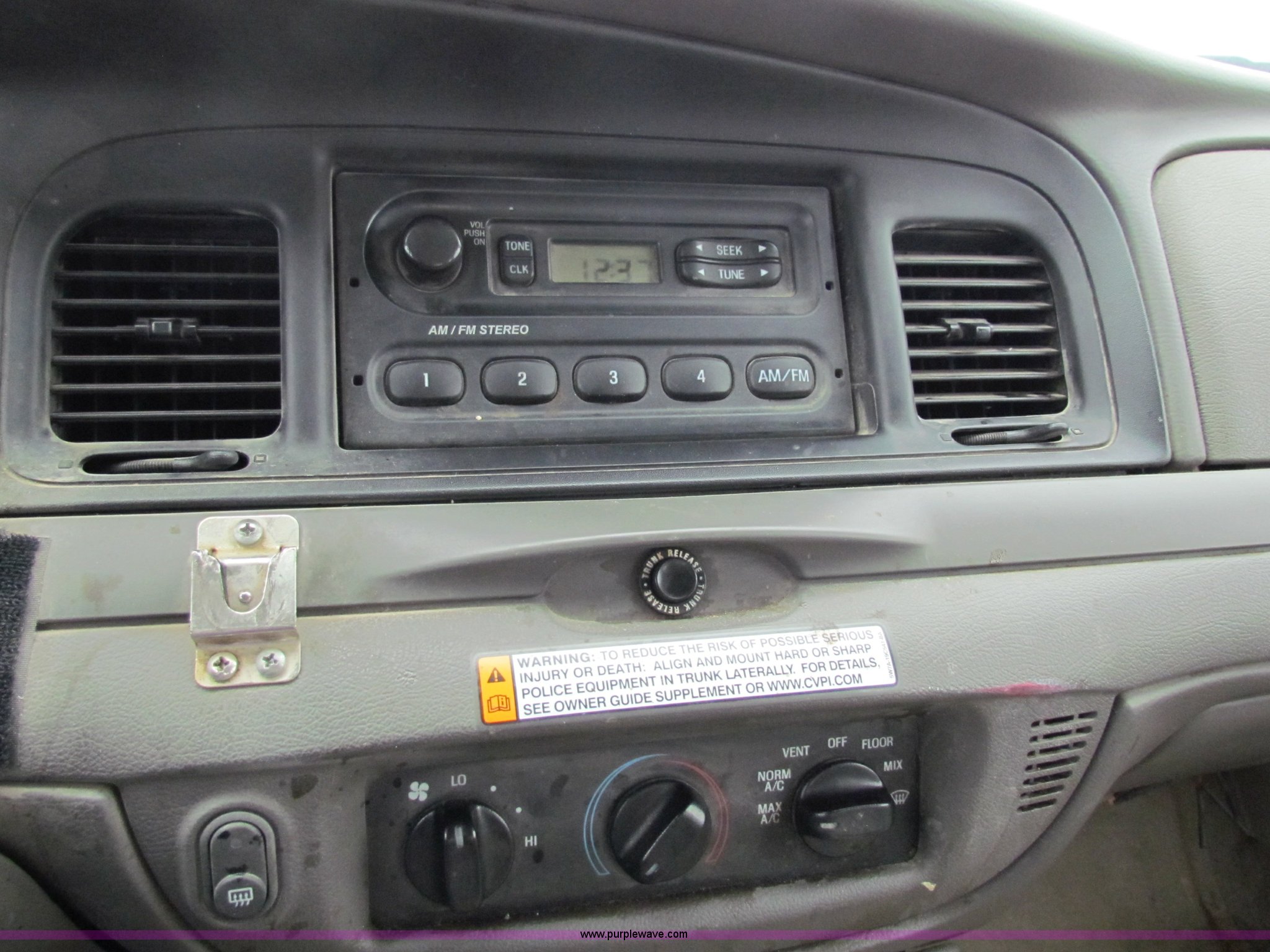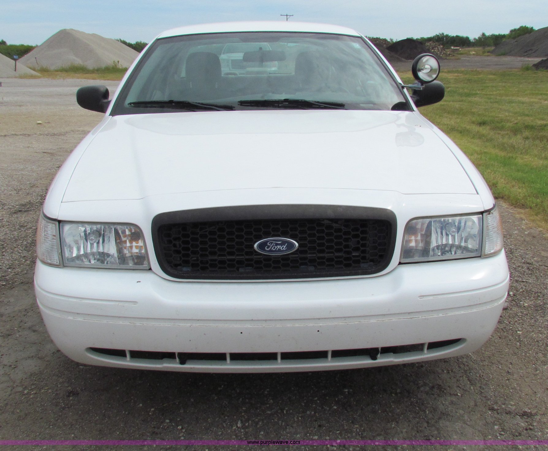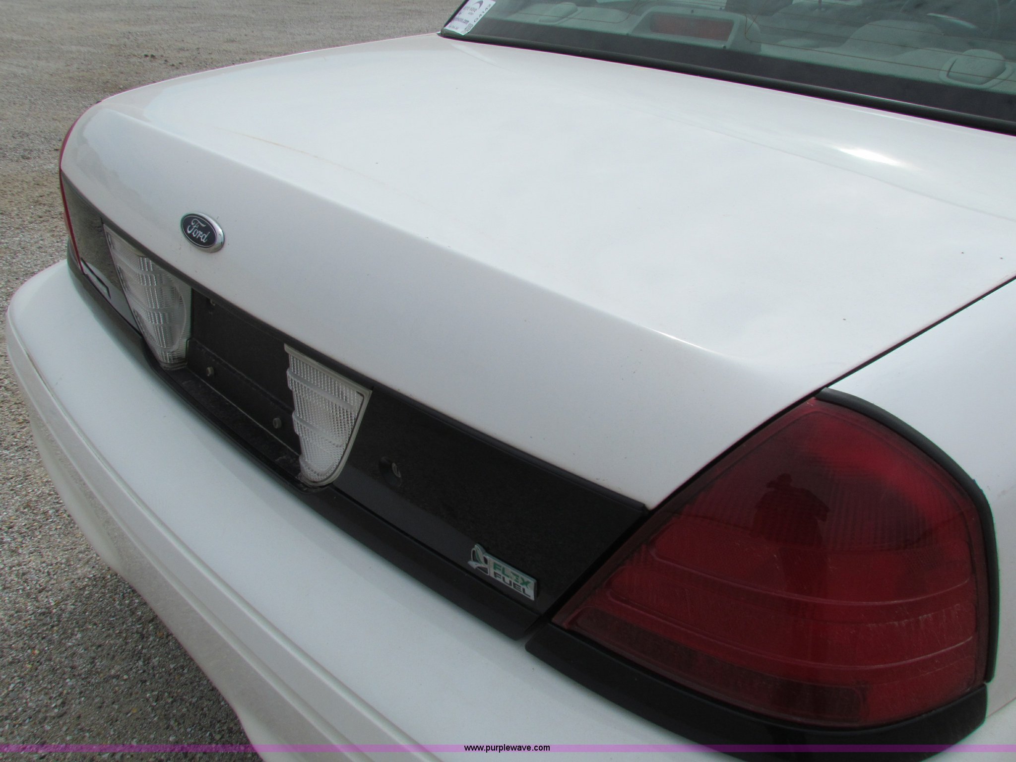 Purple Wave is selling a used Passenger Vehicle in Kansas. This item is a 2009 Ford Crown Victoria Police Interceptor with the following: 79,990 miles on odometer, 4.6L V8 SOHC 16V FFV gas engine, Automatic transmission, AC and heat, Tilt, AM/FM, Power windows, locks, mirrors, and seats, Cloth front interior, Vinyl rear interior, Spotlight, Roof top port holes, 235/55R17 tires, Interior/exterior cosmetic damage, Warning light on in dash