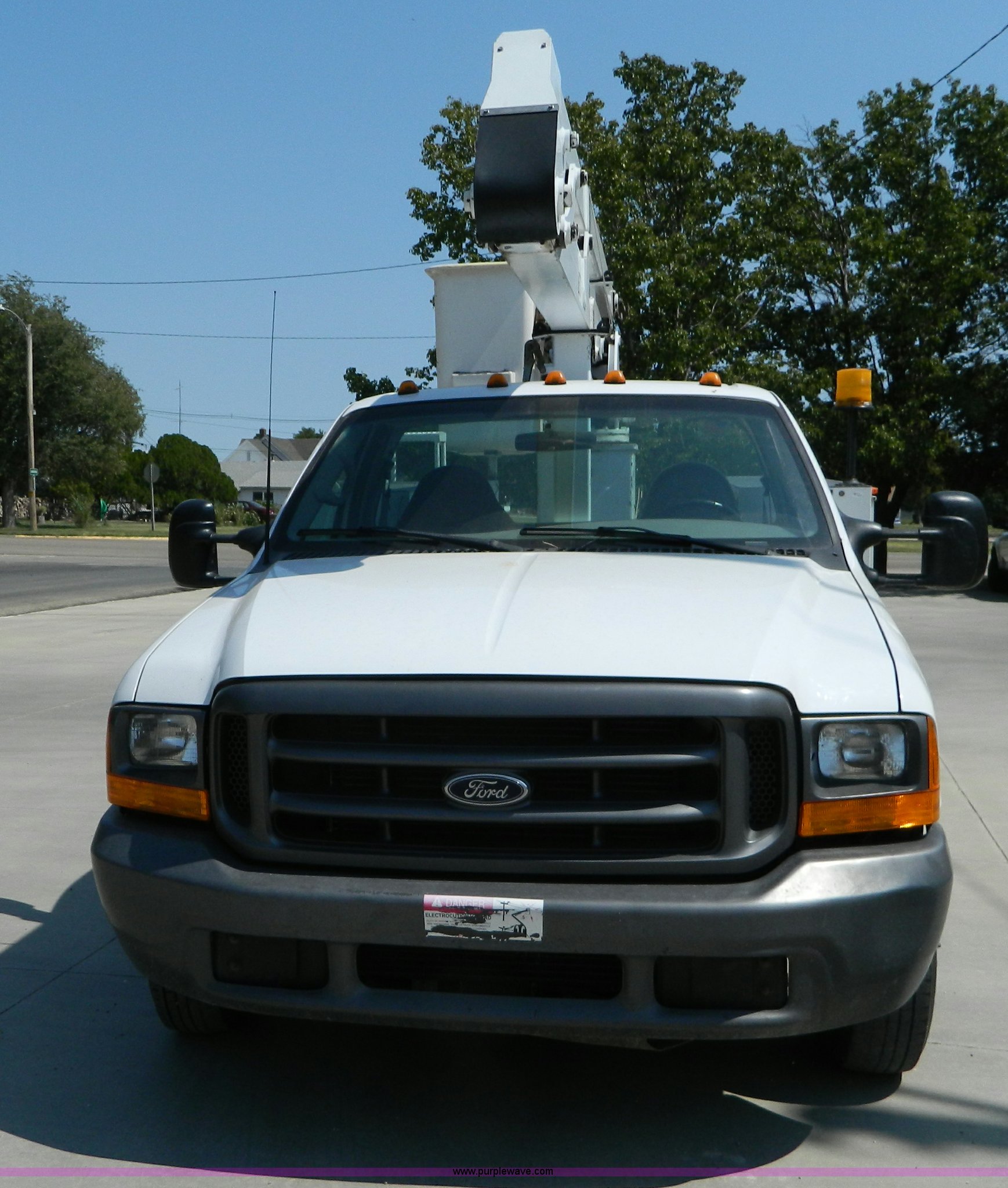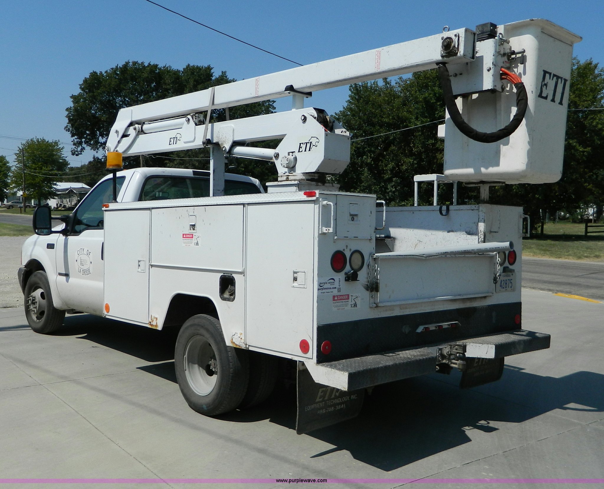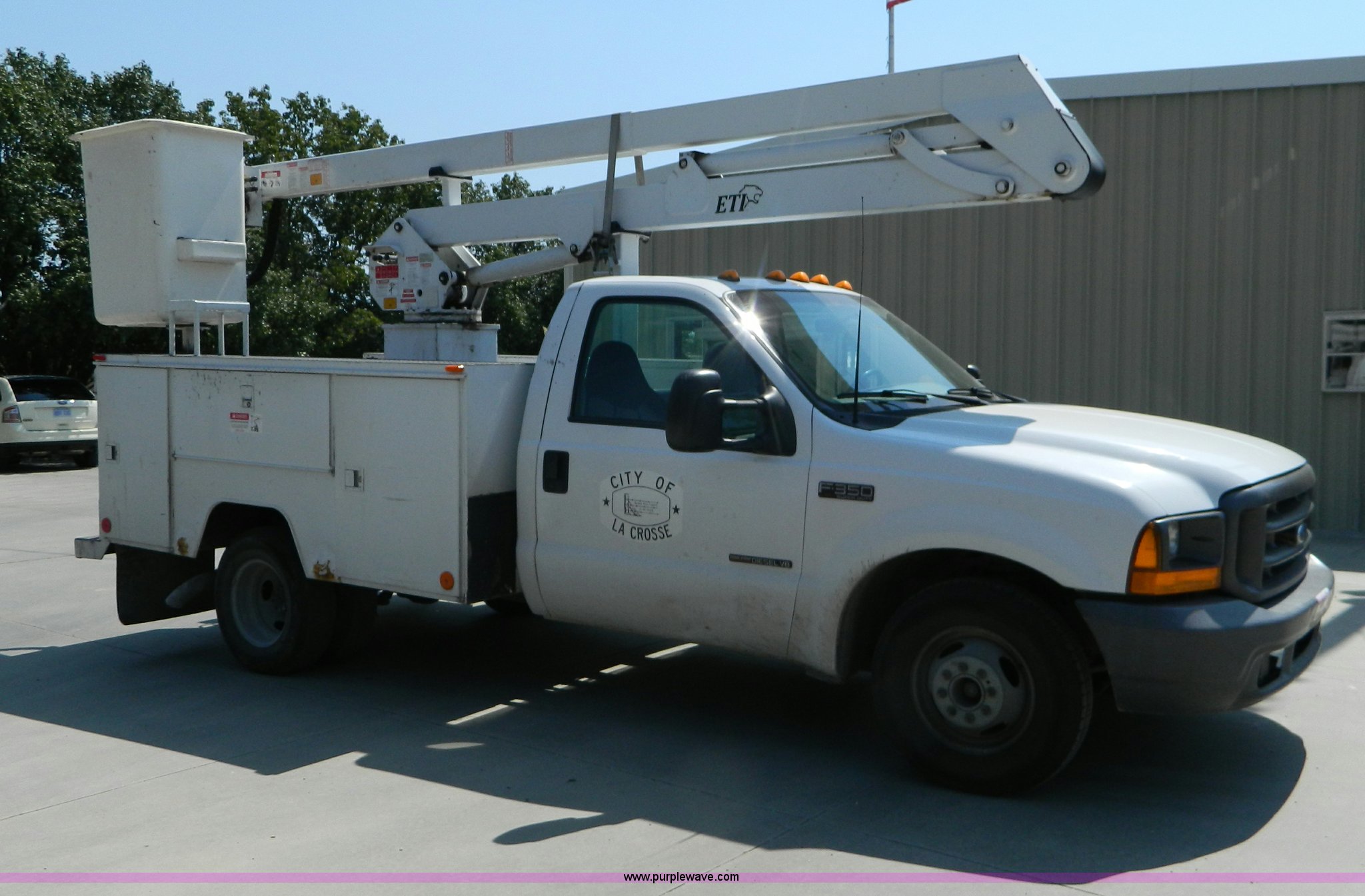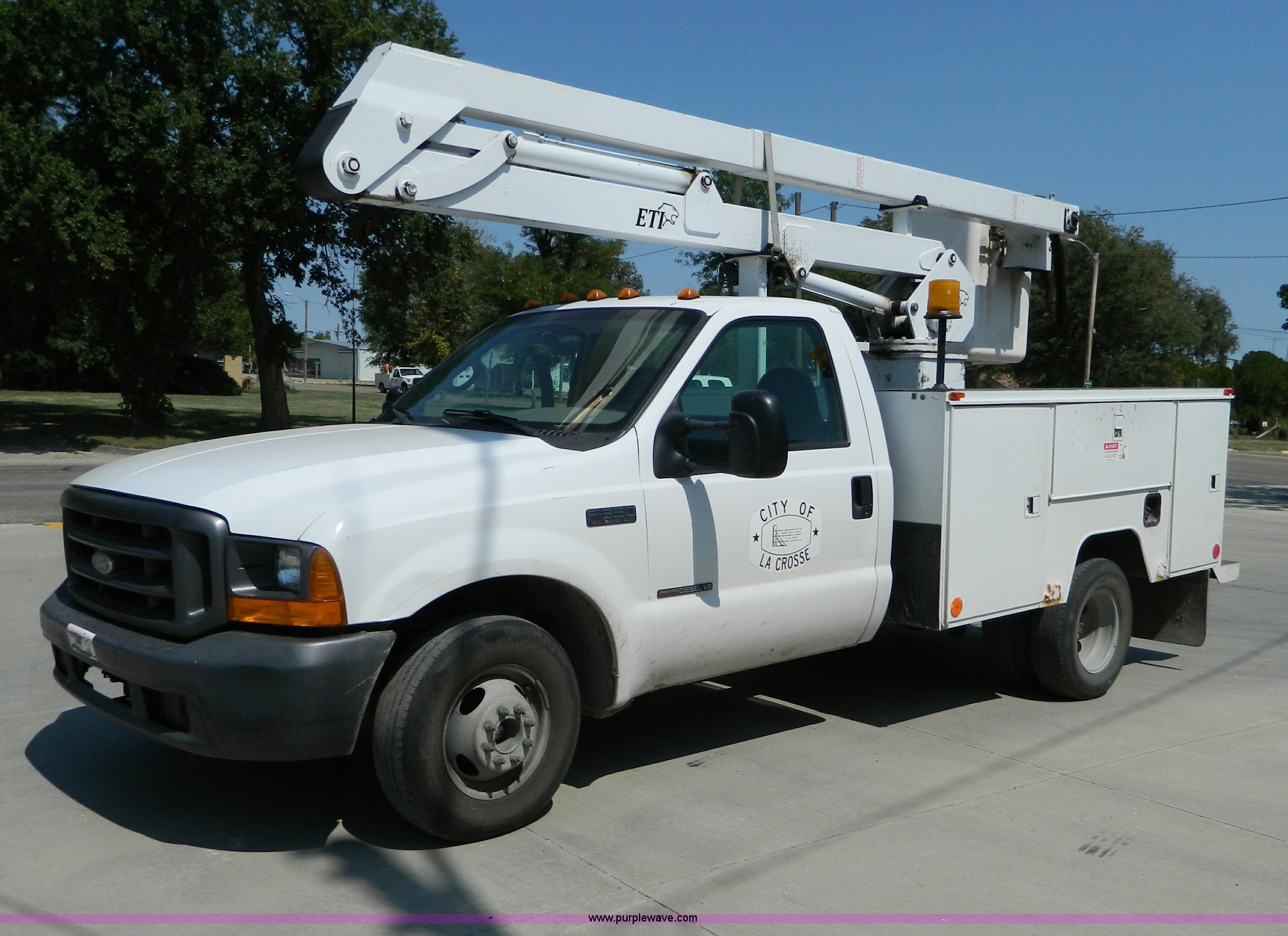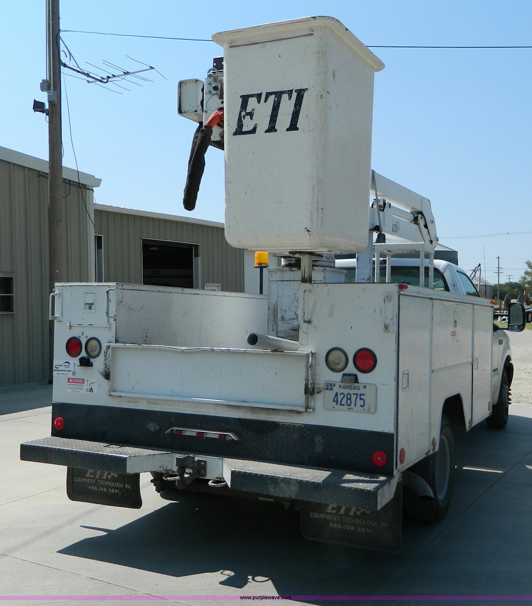 Purple Wave is selling a used Bucket Truck in Kansas. This item is a 1999 Ford F350 bucket truck with the following: 56,442 miles on odometer, 7.3L V8 turbo diesel engine, Automatic transmission, AC and heat, AM/FM, ETI boom and service body, 33' platform, 300 lbs capacity, Joystick basket control, Hydraulic connections at basket, Pintle hitch, Trailer wiring, LT215/85R16 tires, GVWR 12,500 lbs, Hail damage, Rust, Decals will be removed prior to auction