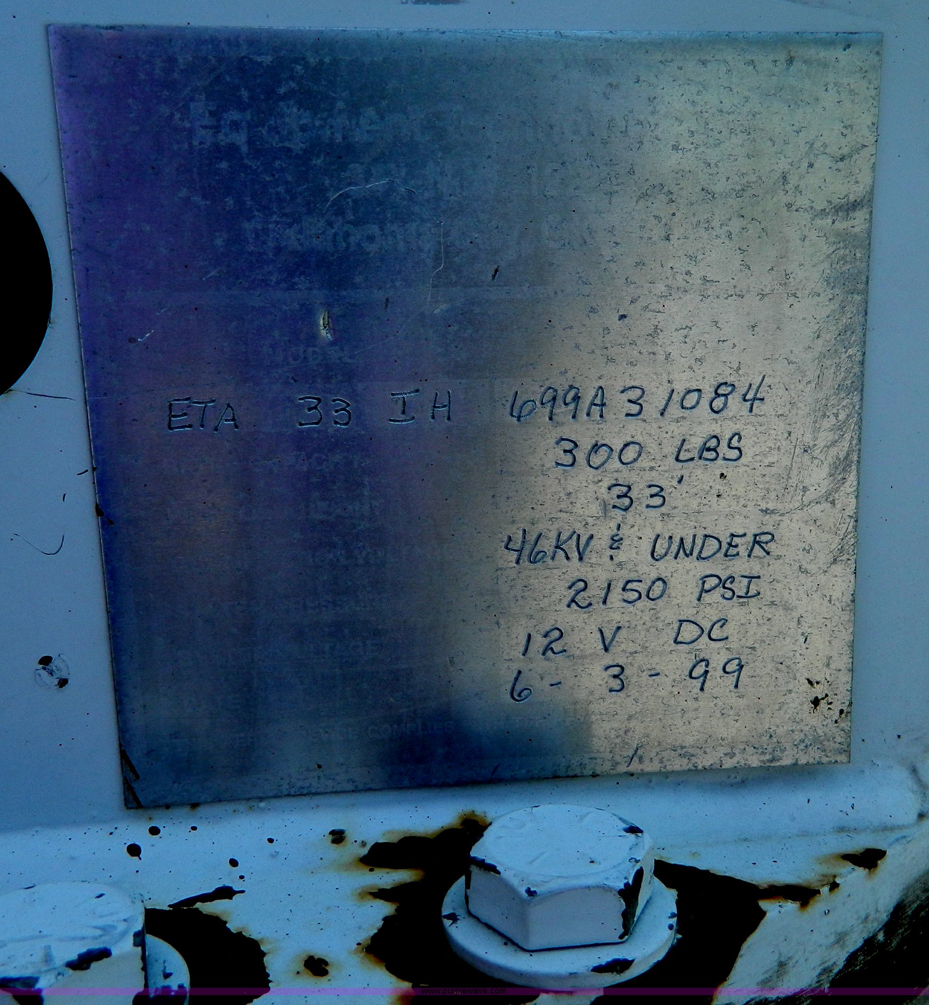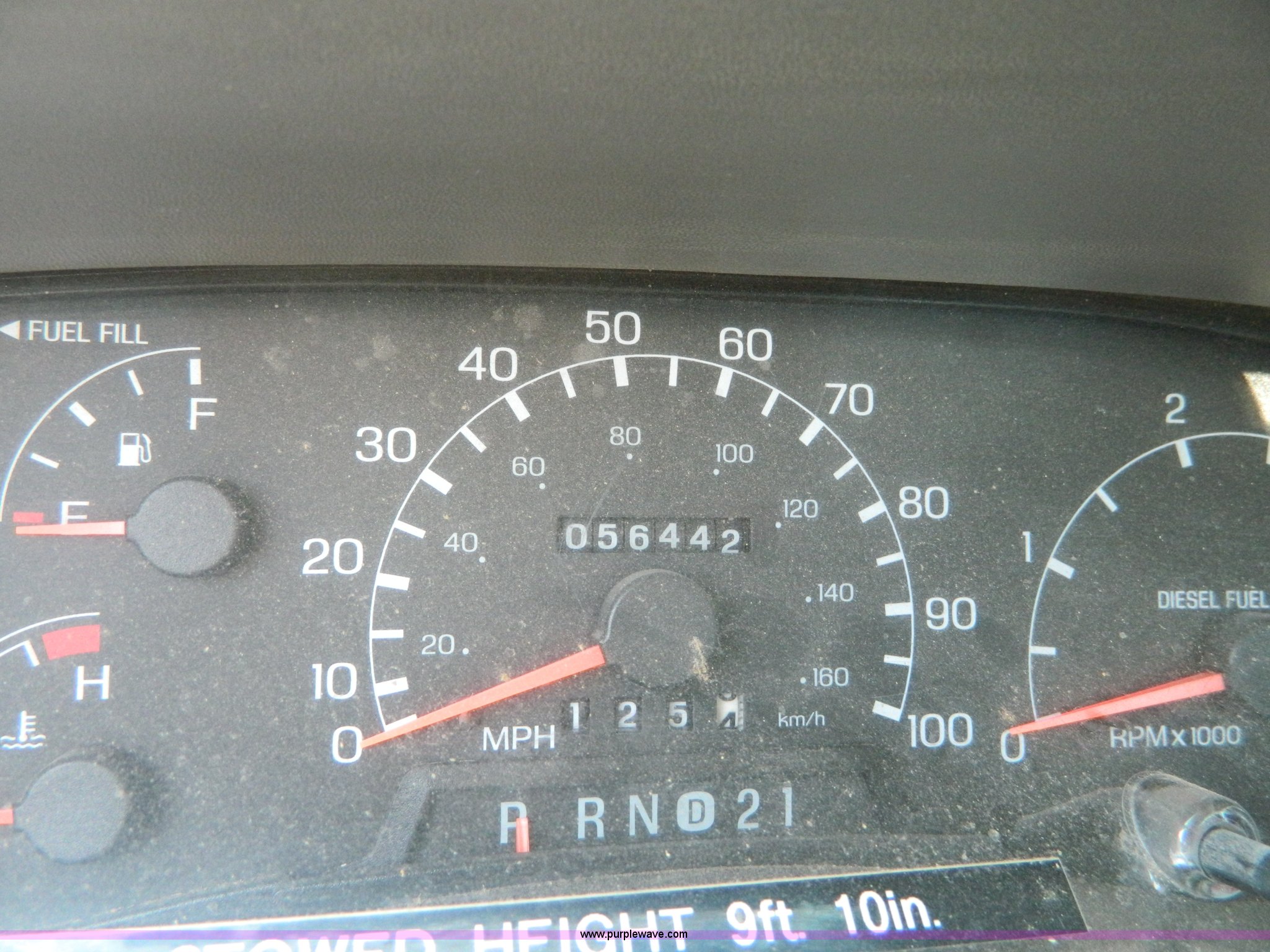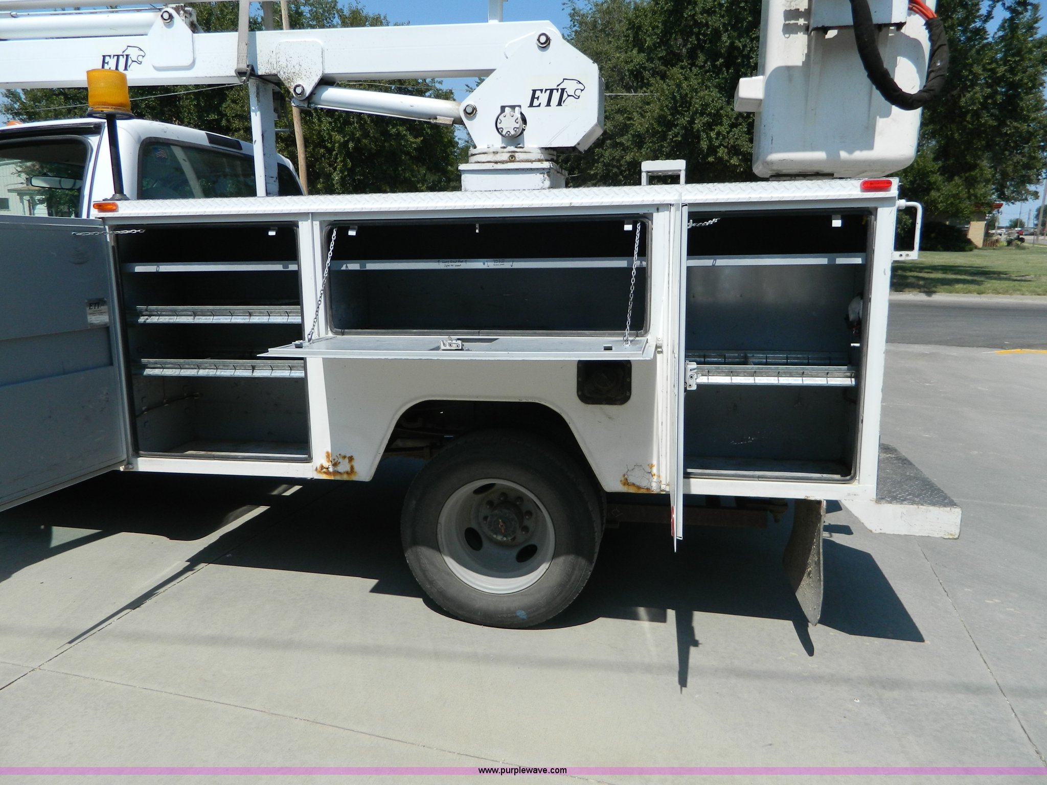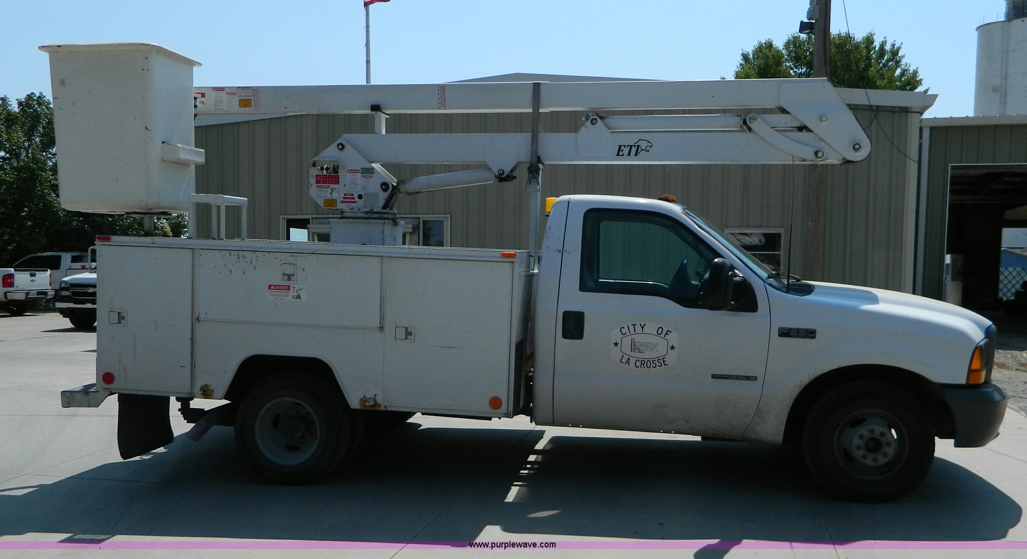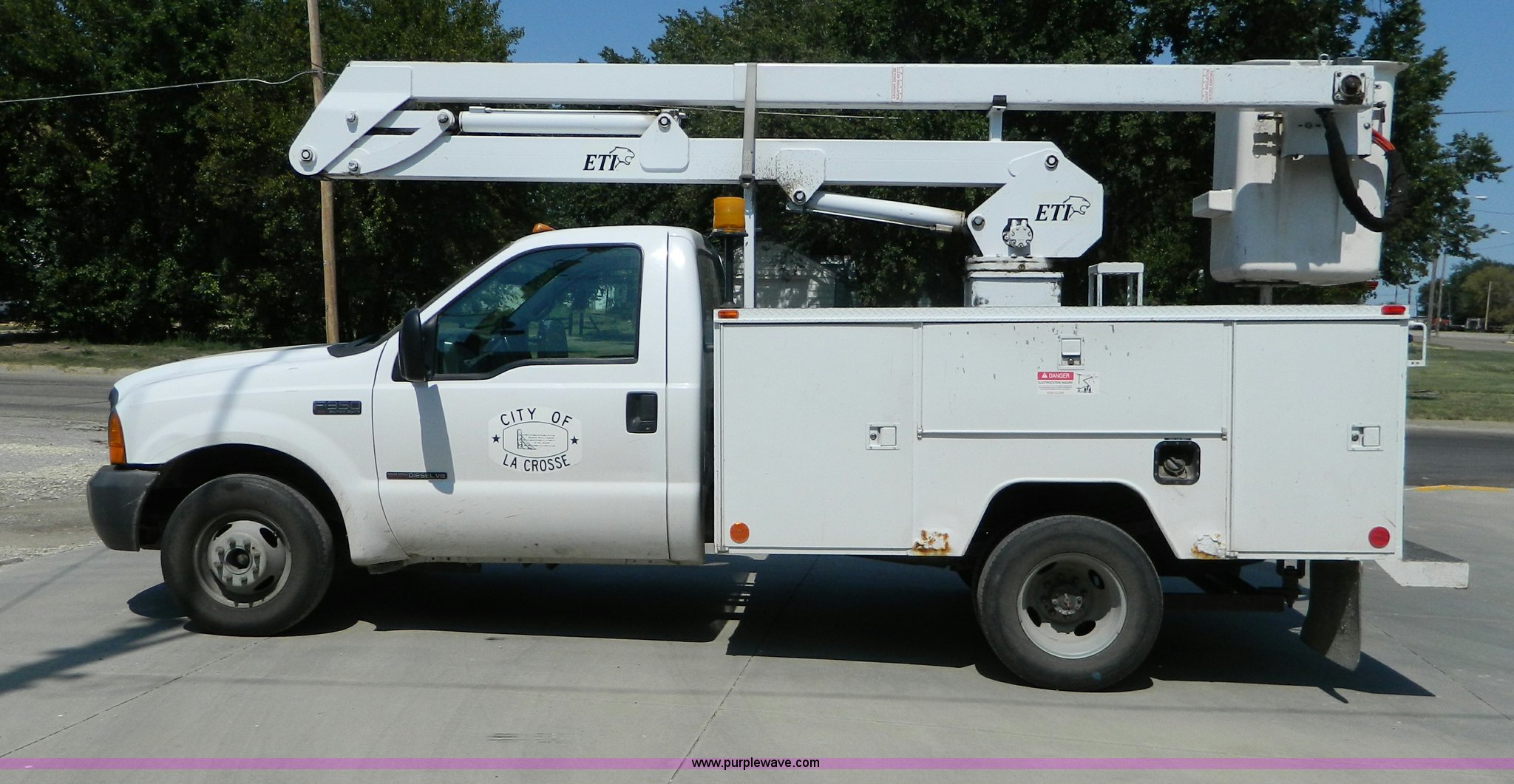 Purple Wave is selling a used Bucket Truck in Kansas. This item is a 1999 Ford F350 bucket truck with the following: 56,442 miles on odometer, 7.3L V8 turbo diesel engine, Automatic transmission, AC and heat, AM/FM, ETI boom and service body, 33' platform, 300 lbs capacity, Joystick basket control, Hydraulic connections at basket, Pintle hitch, Trailer wiring, LT215/85R16 tires, GVWR 12,500 lbs, Hail damage, Rust, Decals will be removed prior to auction
