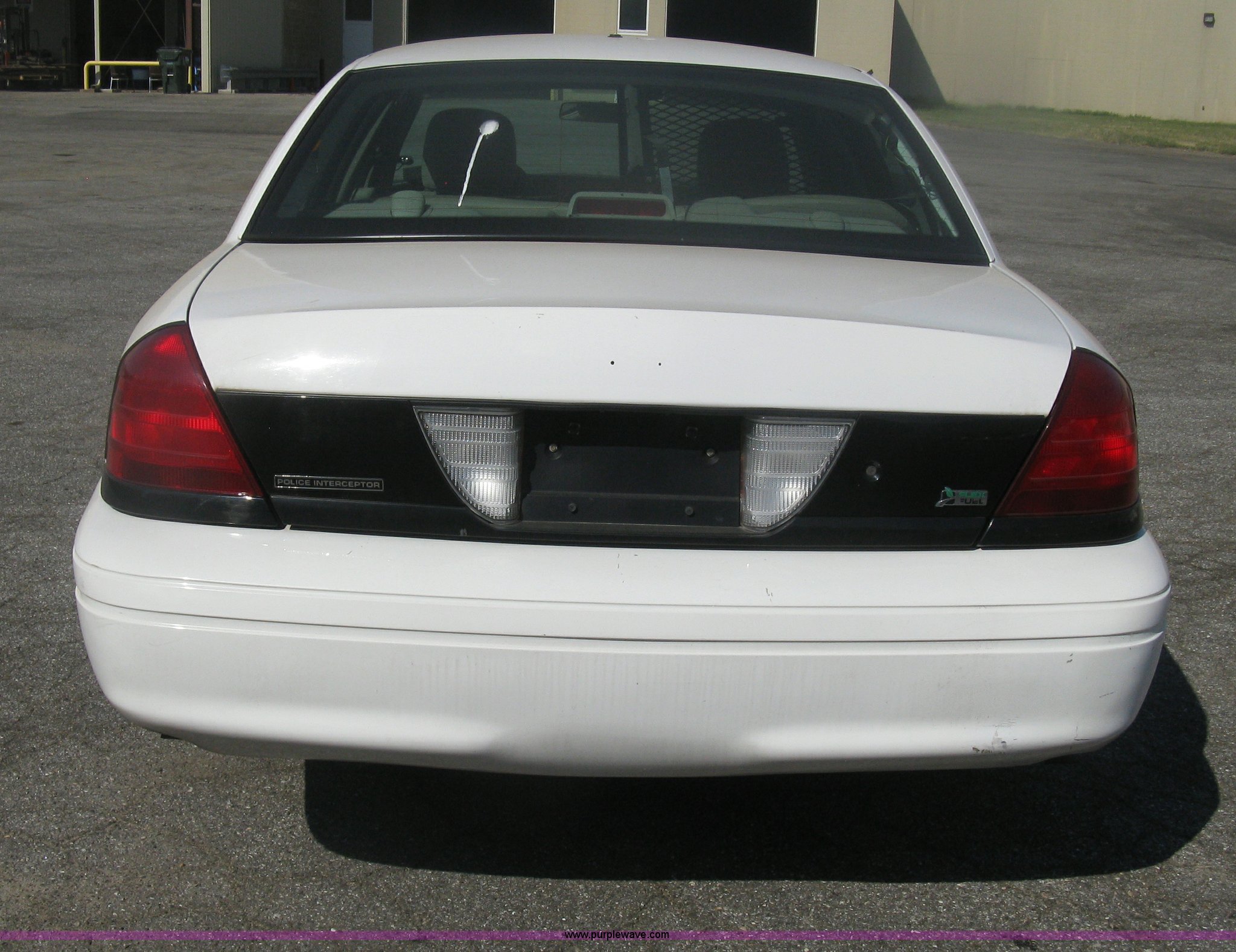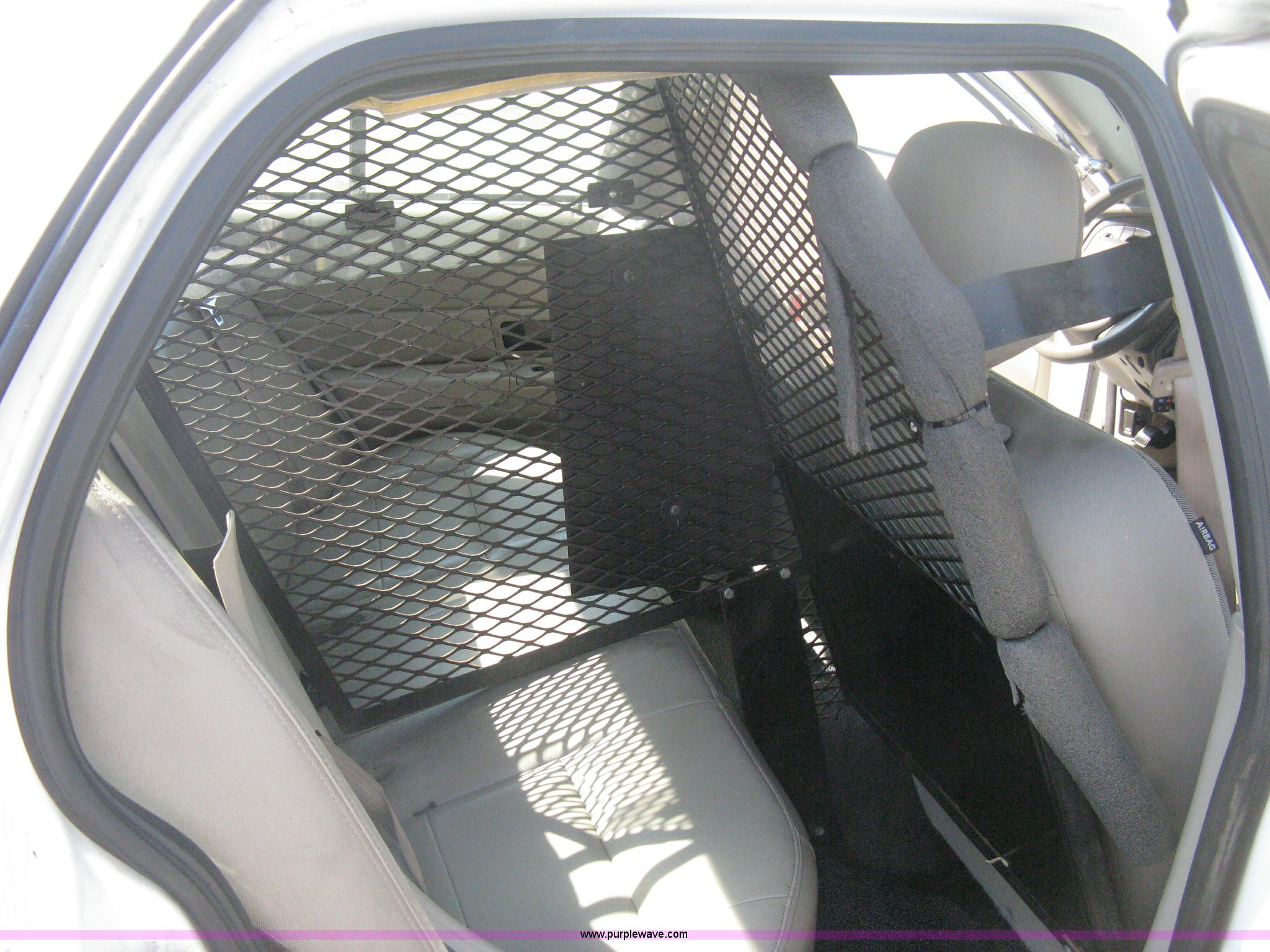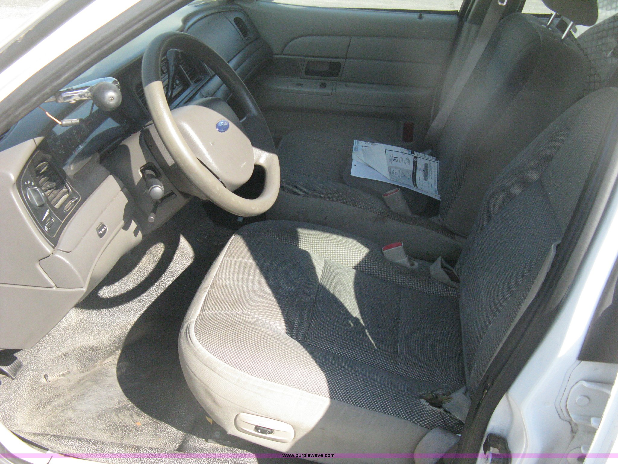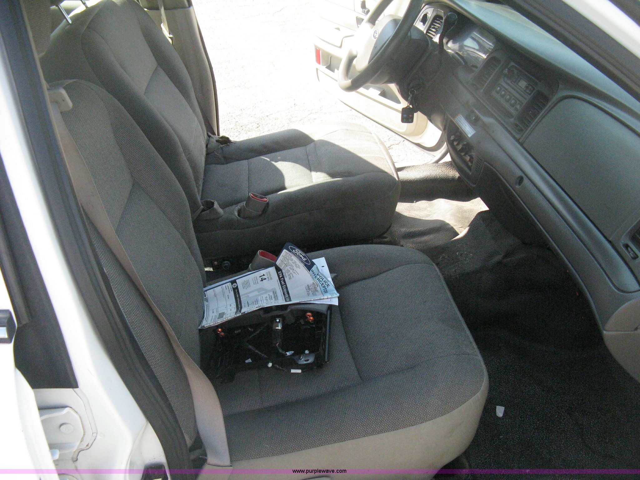 Purple Wave is selling a used Passenger Vehicle in Kansas. This item is a 2009 Ford Crown Victoria Police Interceptor with the following: 105,159 miles on odometer, 4.6L V8 SOHC 16V FFV gas engine, Automatic transmission, AC and heat, AC inoperable, Tilt, AM/FM, Power windows, locks, mirrors, and seats, Cloth front interior, Vinyl rear interior, Rear single passenger cage surround, Roof top port holes, Exterior spotlight, P235/55R17 tires, Interior cosmetic damage, Front bumper cracked, Battery dead, Unit# 221