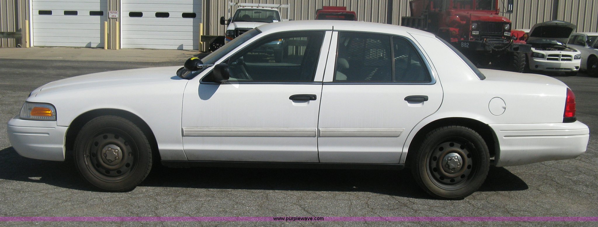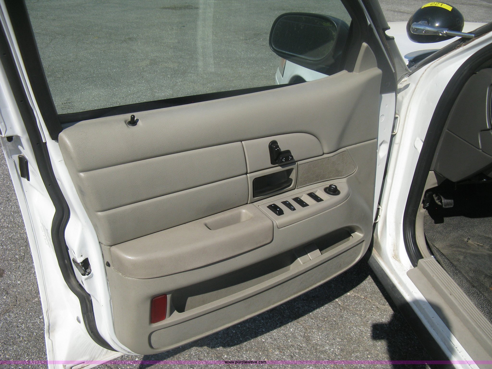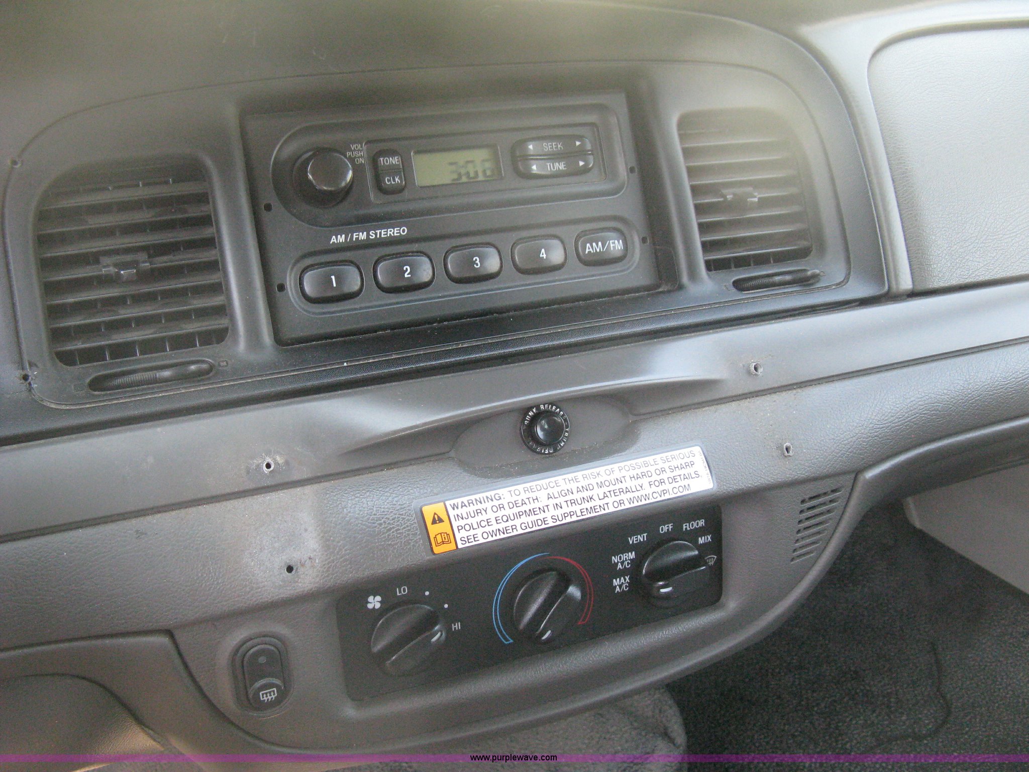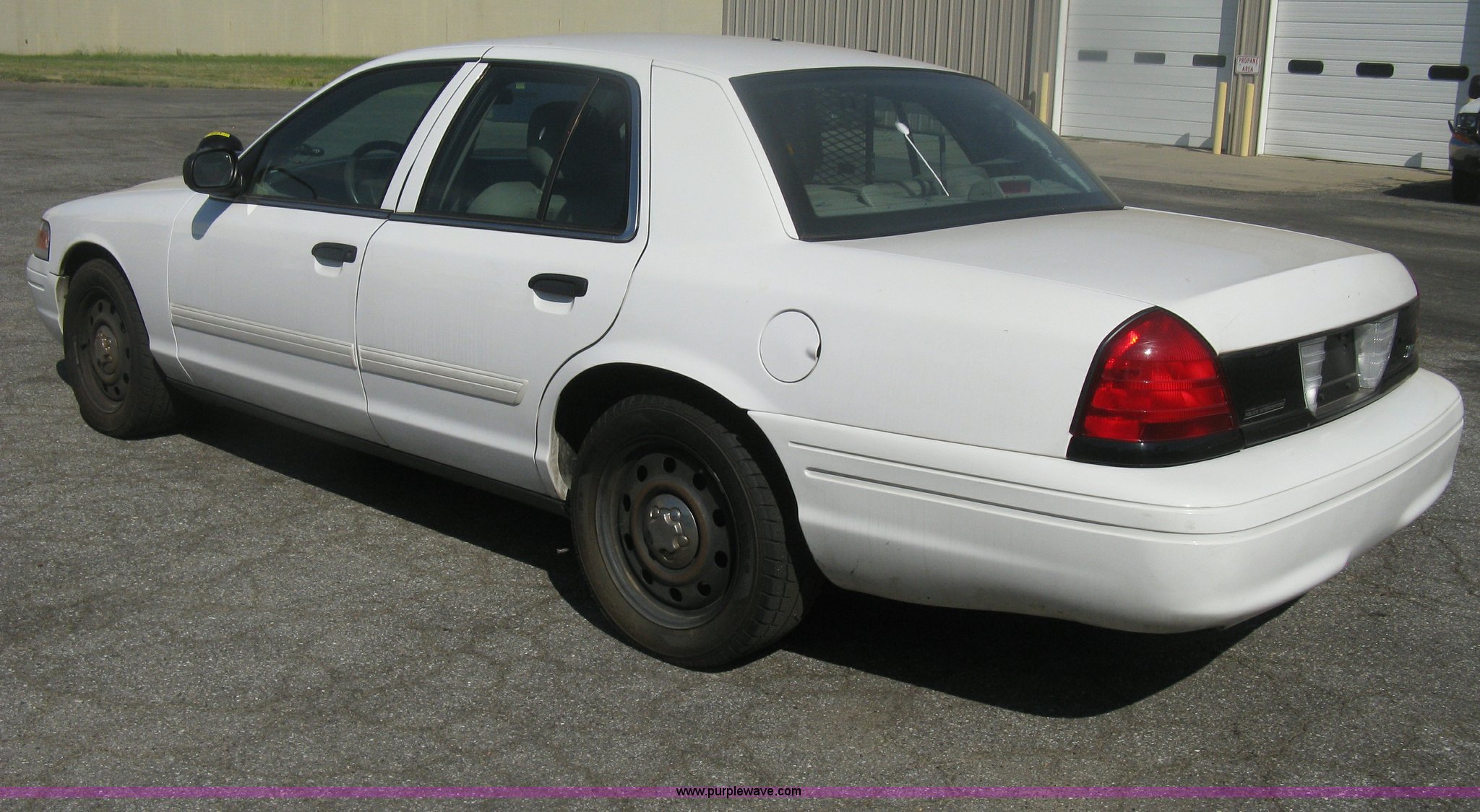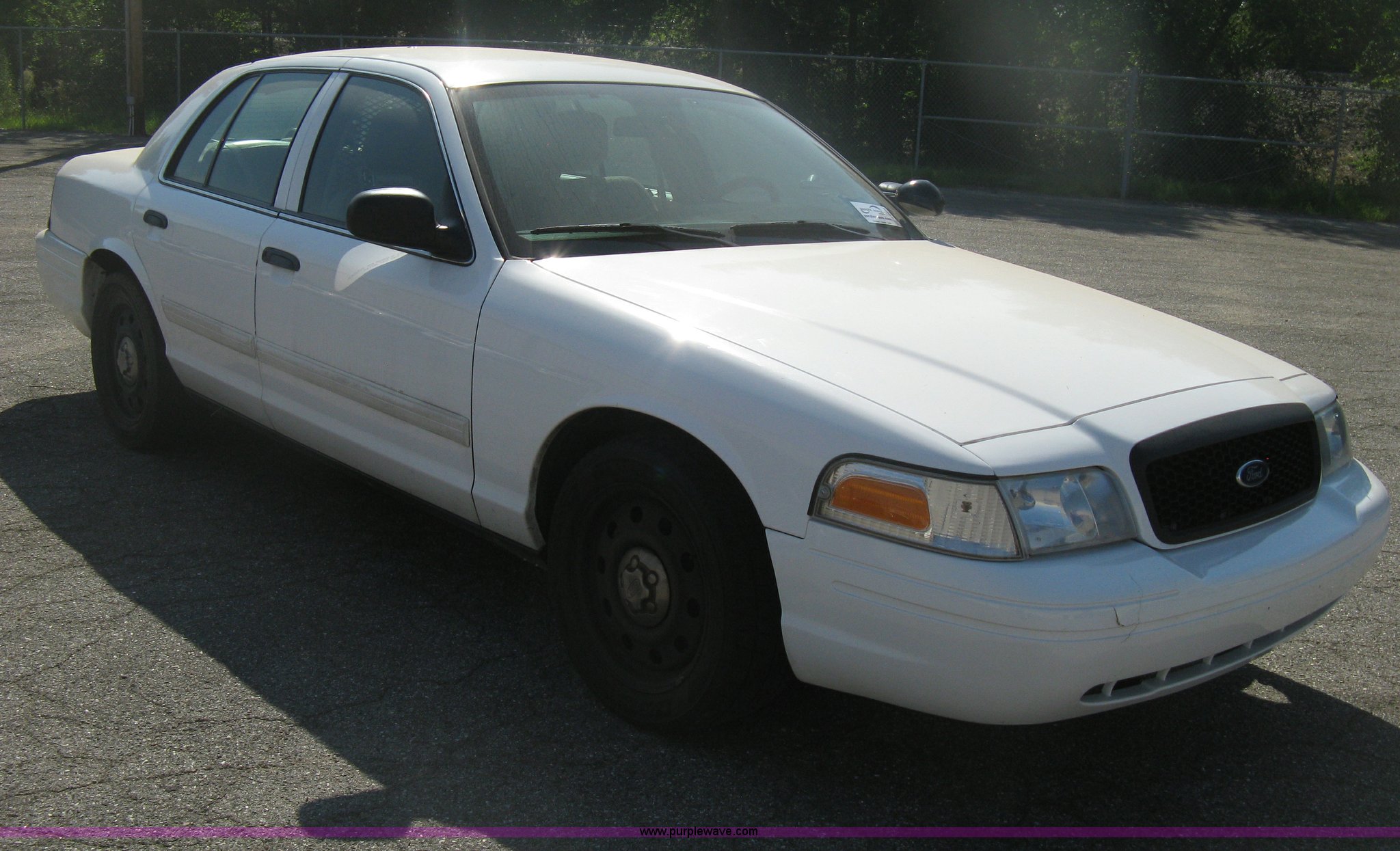 Purple Wave is selling a used Passenger Vehicle in Kansas. This item is a 2009 Ford Crown Victoria Police Interceptor with the following: 105,159 miles on odometer, 4.6L V8 SOHC 16V FFV gas engine, Automatic transmission, AC and heat, AC inoperable, Tilt, AM/FM, Power windows, locks, mirrors, and seats, Cloth front interior, Vinyl rear interior, Rear single passenger cage surround, Roof top port holes, Exterior spotlight, P235/55R17 tires, Interior cosmetic damage, Front bumper cracked, Battery dead, Unit# 221
