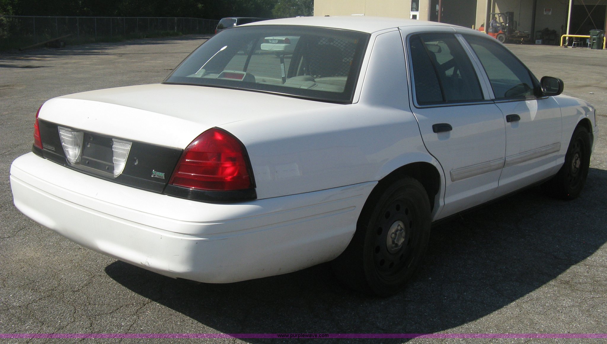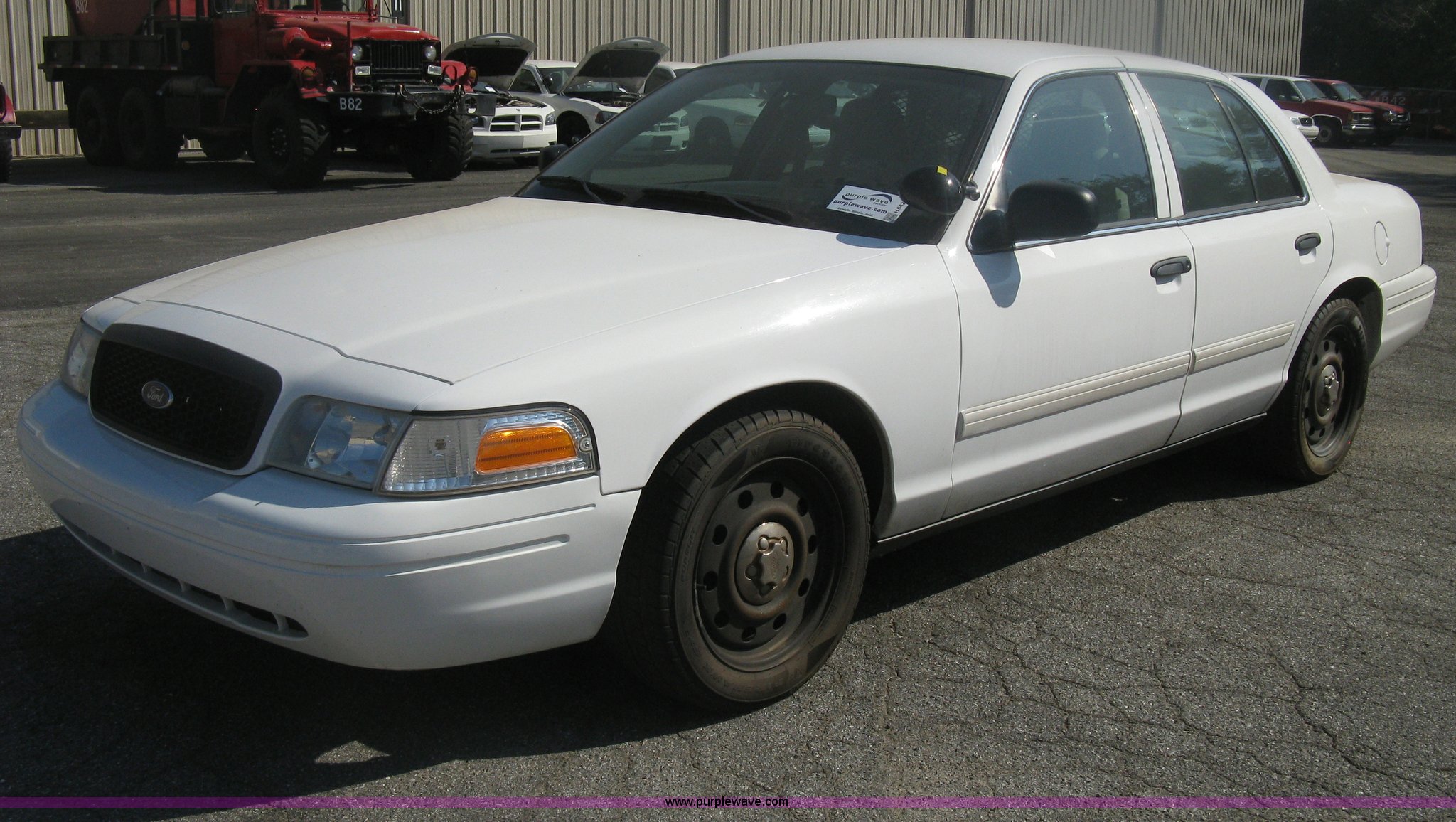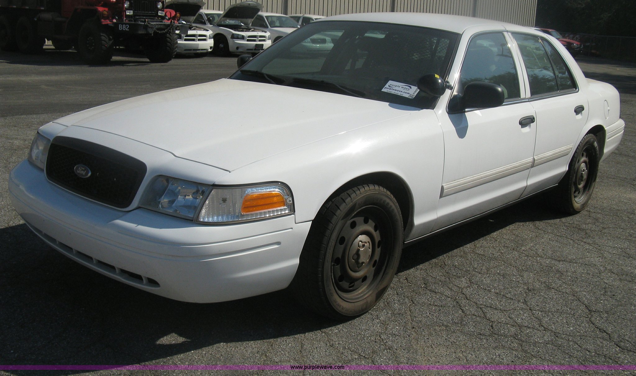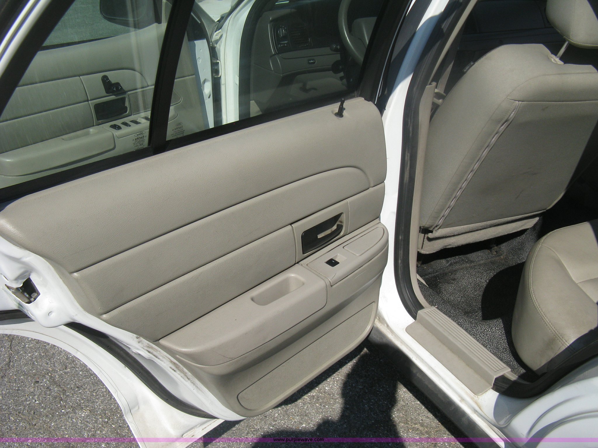 Purple Wave is selling a used Passenger Vehicle in Kansas. This item is a 2009 Ford Crown Victoria Police Interceptor with the following: 105,159 miles on odometer, 4.6L V8 SOHC 16V FFV gas engine, Automatic transmission, AC and heat, AC inoperable, Tilt, AM/FM, Power windows, locks, mirrors, and seats, Cloth front interior, Vinyl rear interior, Rear single passenger cage surround, Roof top port holes, Exterior spotlight, P235/55R17 tires, Interior cosmetic damage, Front bumper cracked, Battery dead, Unit# 221