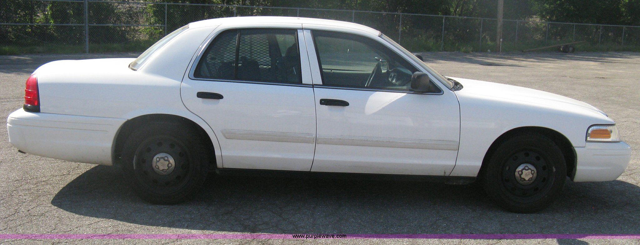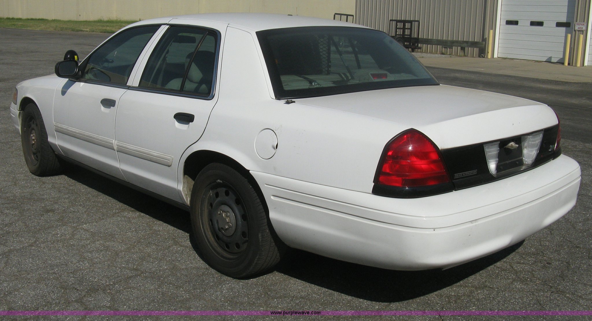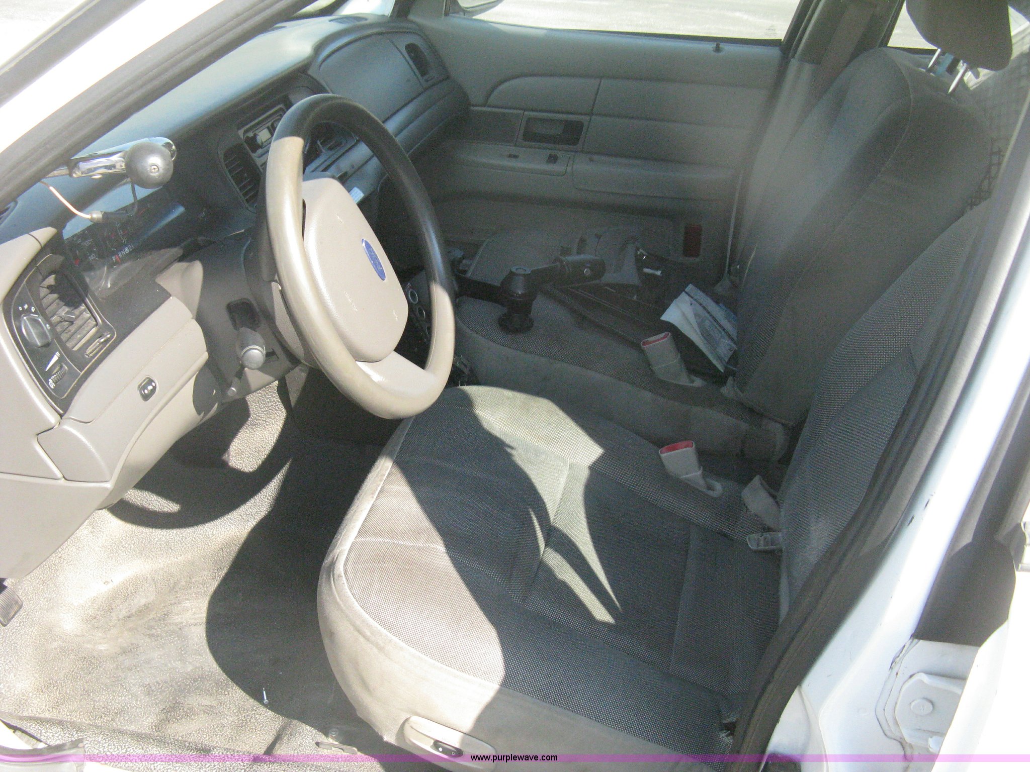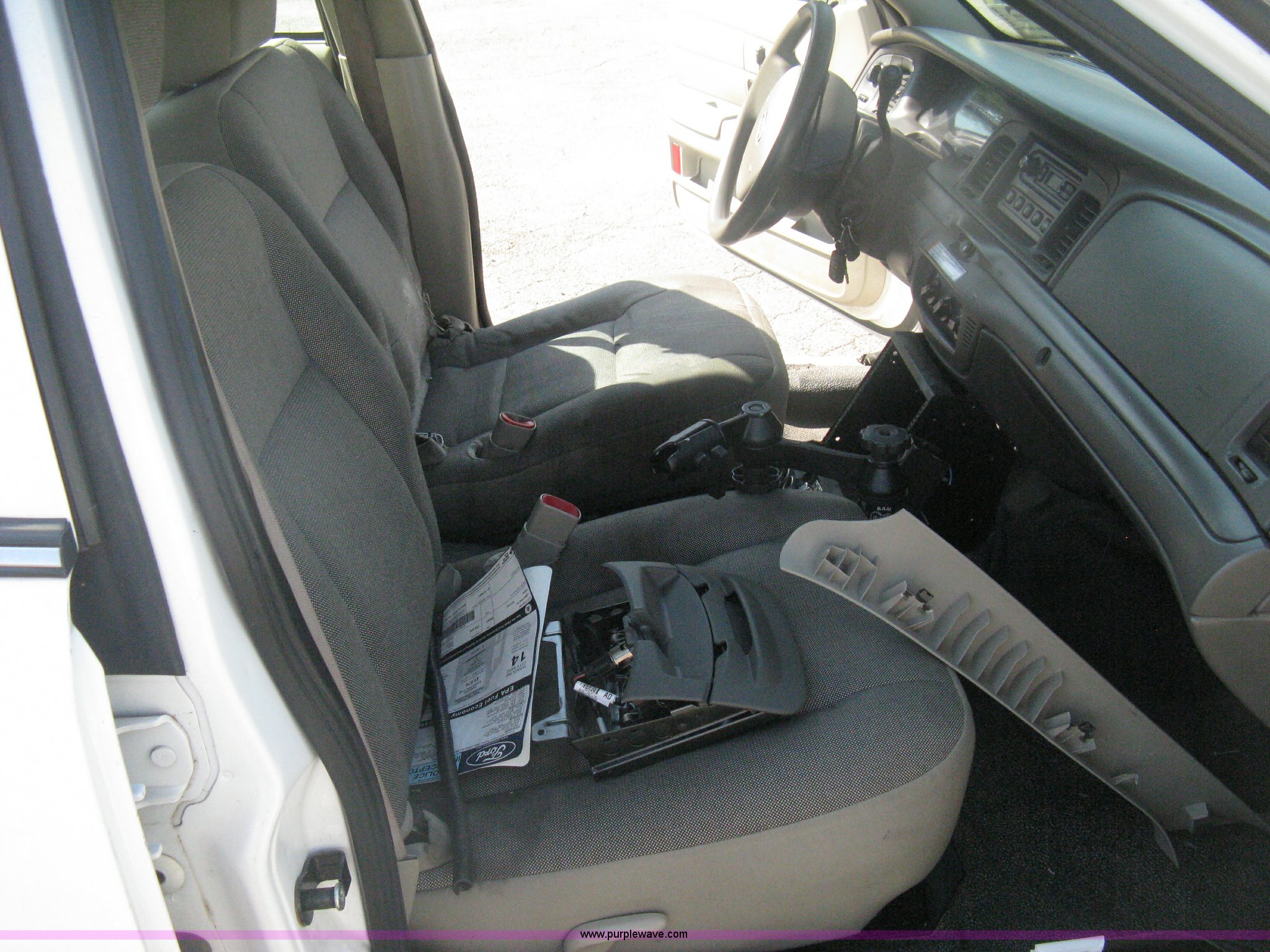 Purple Wave is selling a used Passenger Vehicle in Kansas. This item is a 2009 Ford Crown Victoria Police Interceptor with the following: 106,743 miles on odometer, 4.6L V8 SOHC 16V FFV gas engine, Automatic transmission, AC and heat, Tilt, AM/FM, Power windows, locks, mirrors, and seats, Cloth front interior, Vinyl rear interior, Laptop floor stand, Tray missing, Roof top port holes, Exterior spotlight, P235/55R17 tires, Interior cosmetic damage, Left rear axle bearing needs replaced, Damage to axle, Battery dead, Unit# 230