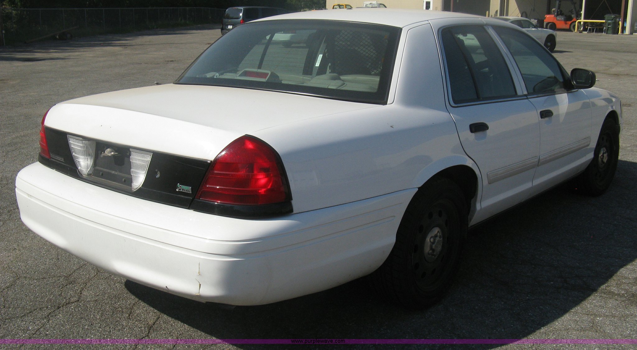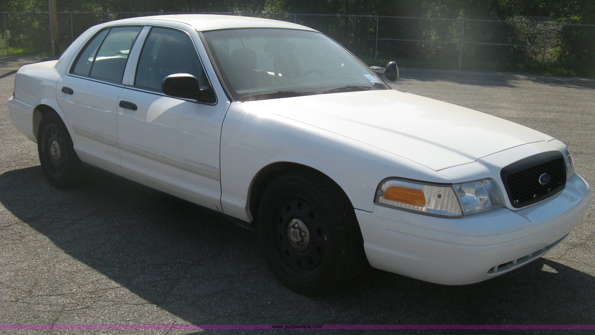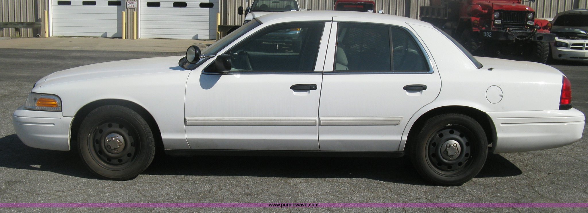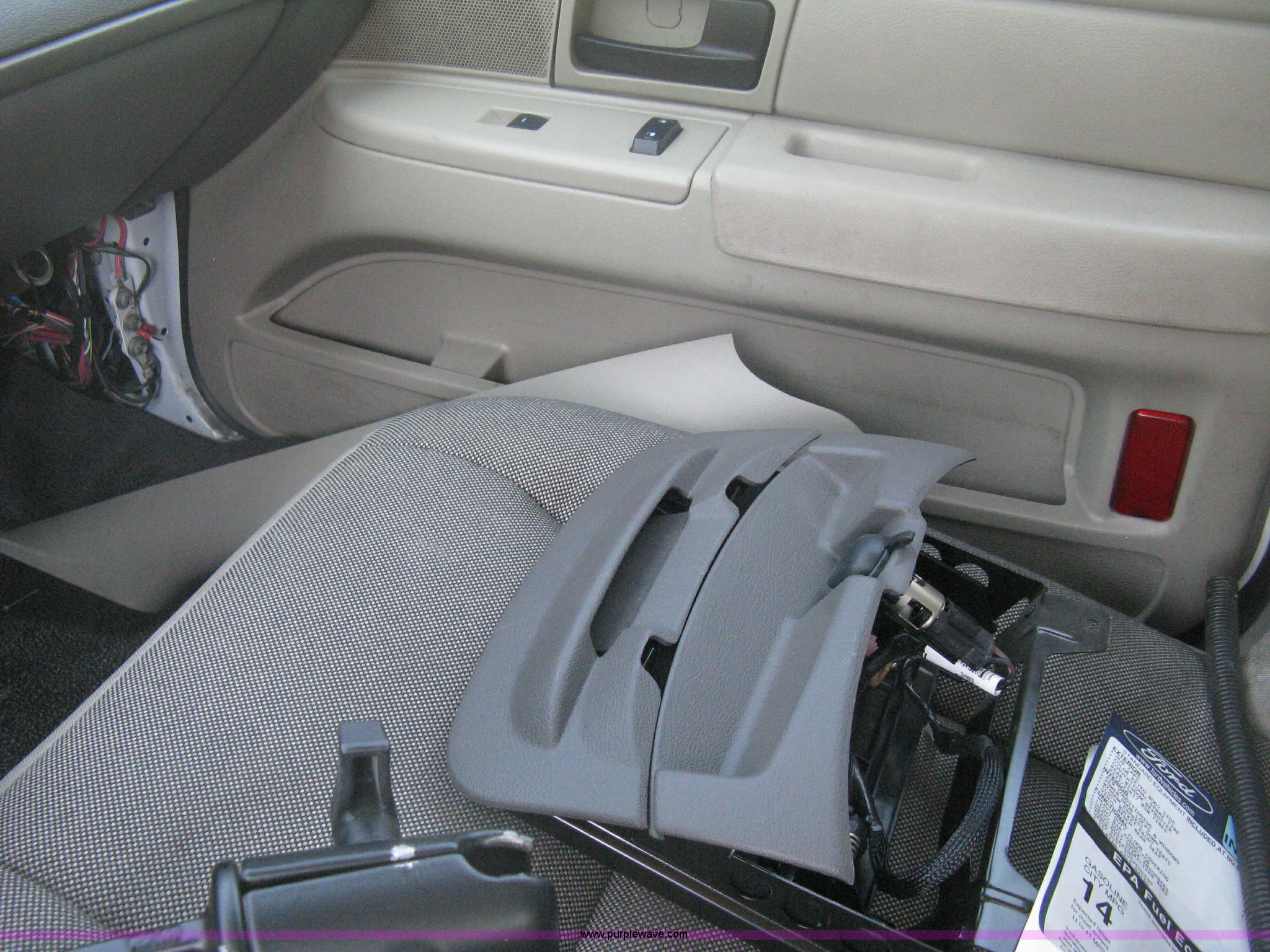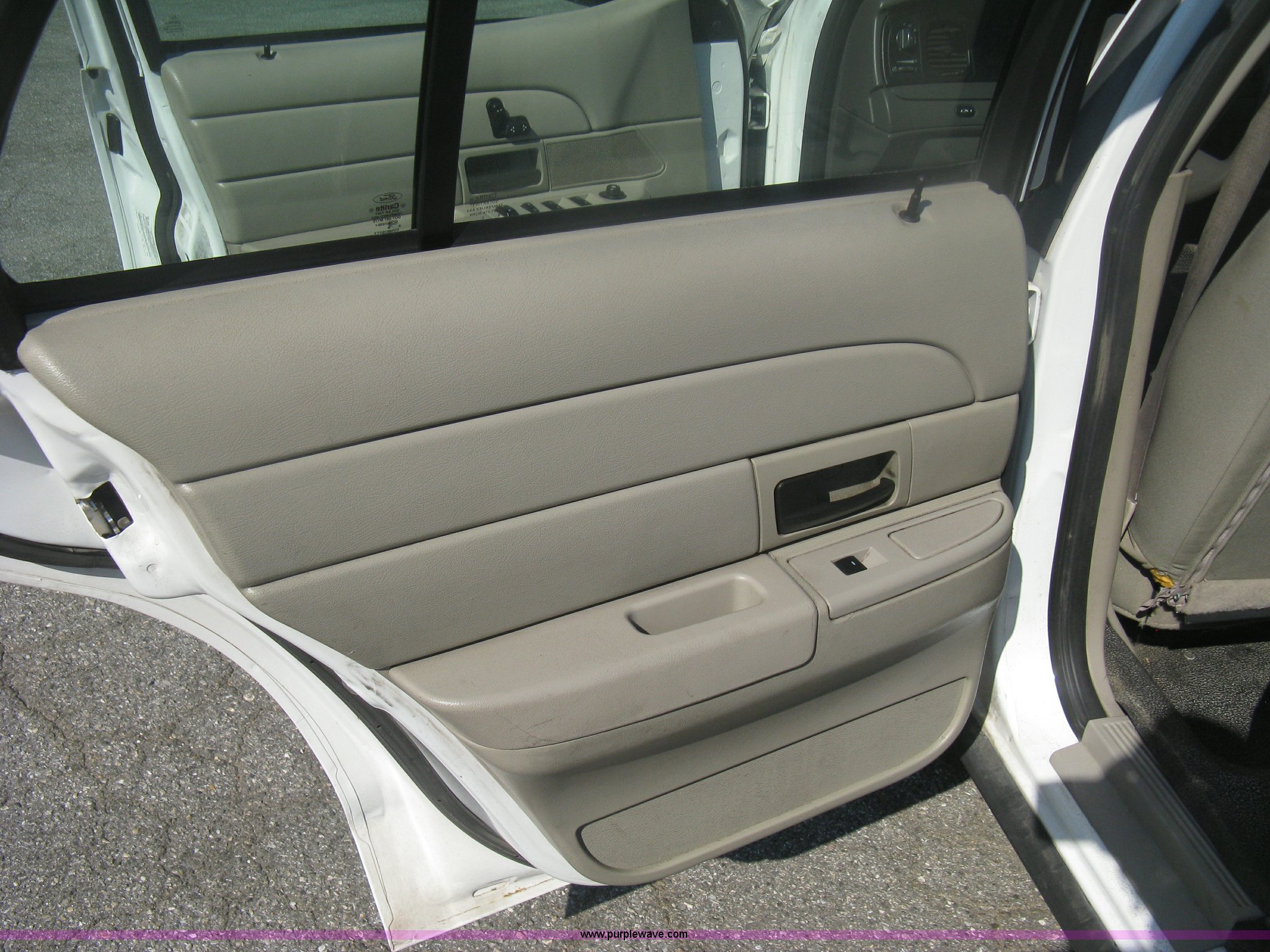 Purple Wave is selling a used Passenger Vehicle in Kansas. This item is a 2009 Ford Crown Victoria Police Interceptor with the following: 106,743 miles on odometer, 4.6L V8 SOHC 16V FFV gas engine, Automatic transmission, AC and heat, Tilt, AM/FM, Power windows, locks, mirrors, and seats, Cloth front interior, Vinyl rear interior, Laptop floor stand, Tray missing, Roof top port holes, Exterior spotlight, P235/55R17 tires, Interior cosmetic damage, Left rear axle bearing needs replaced, Damage to axle, Battery dead, Unit# 230