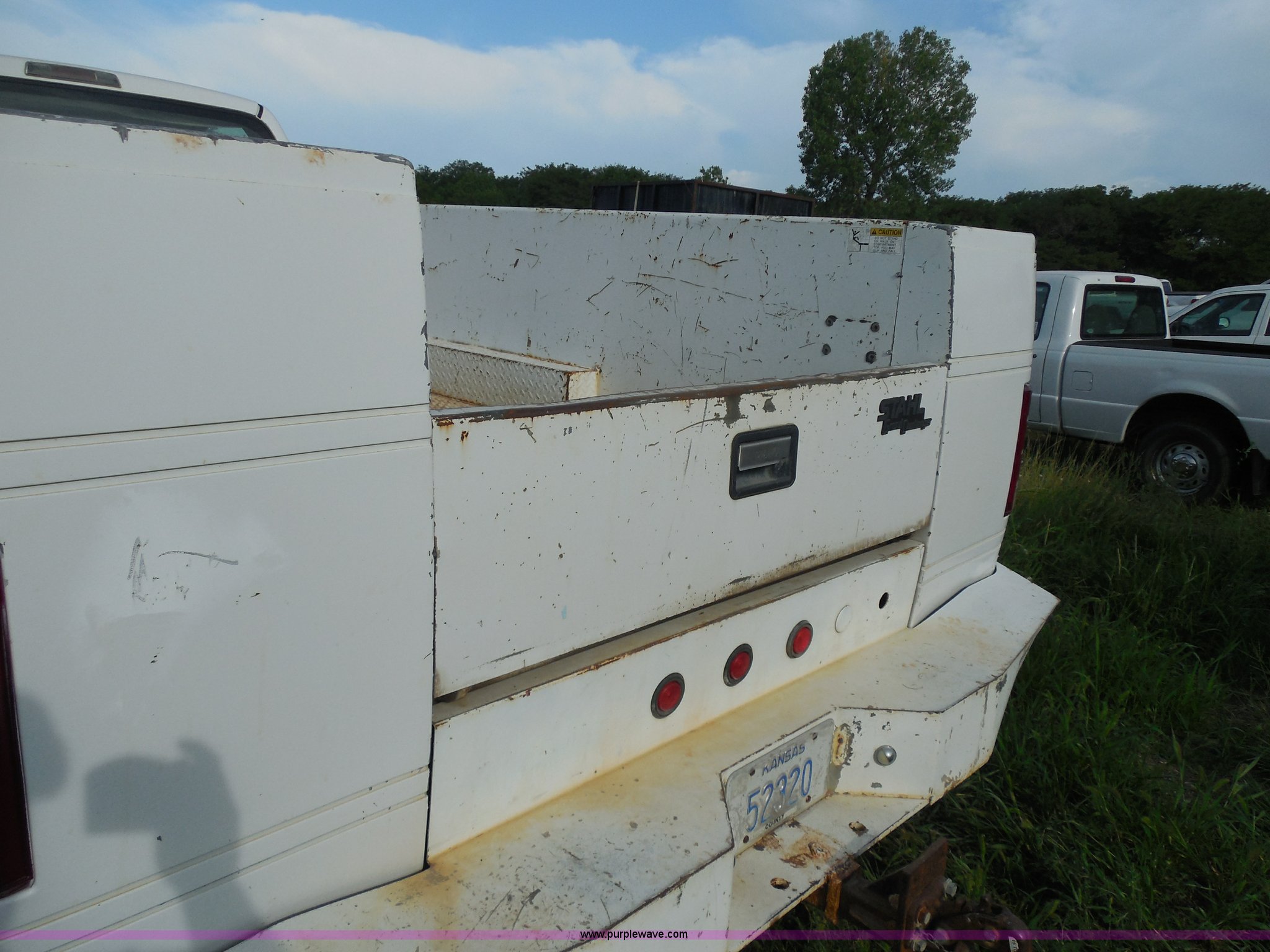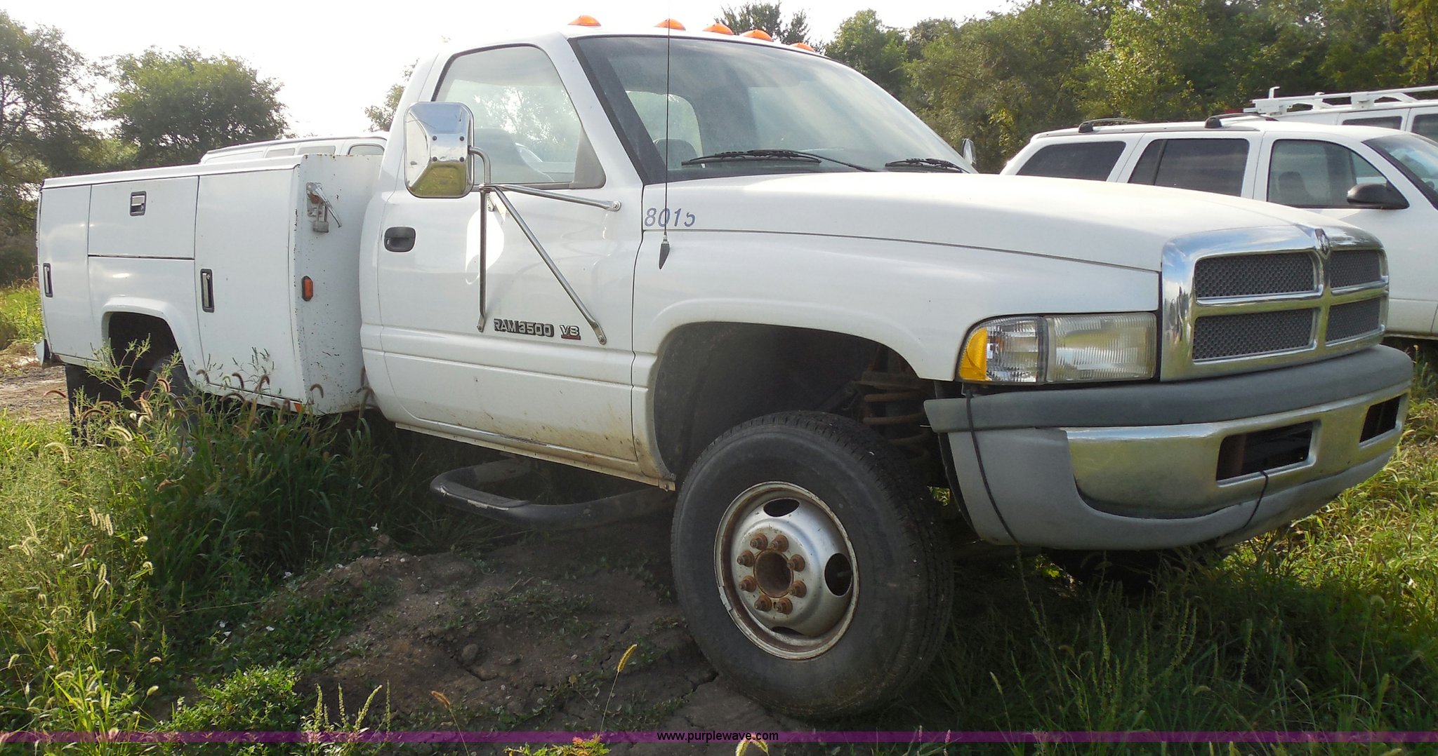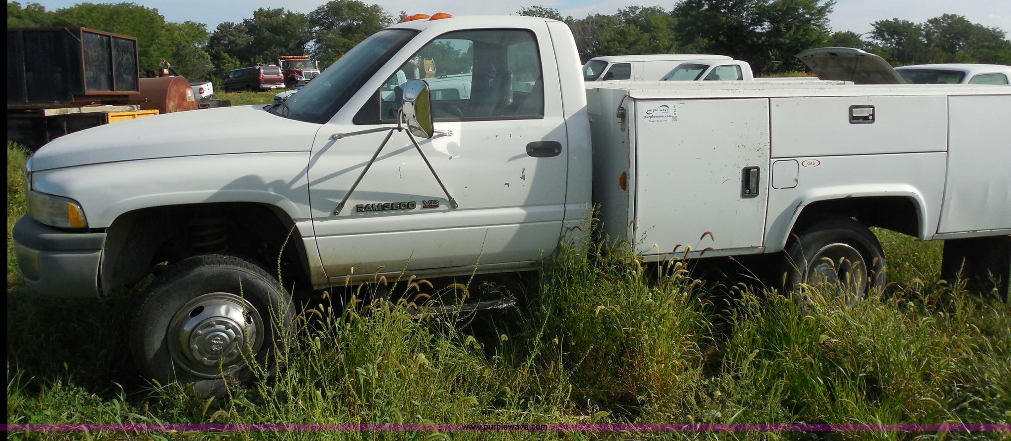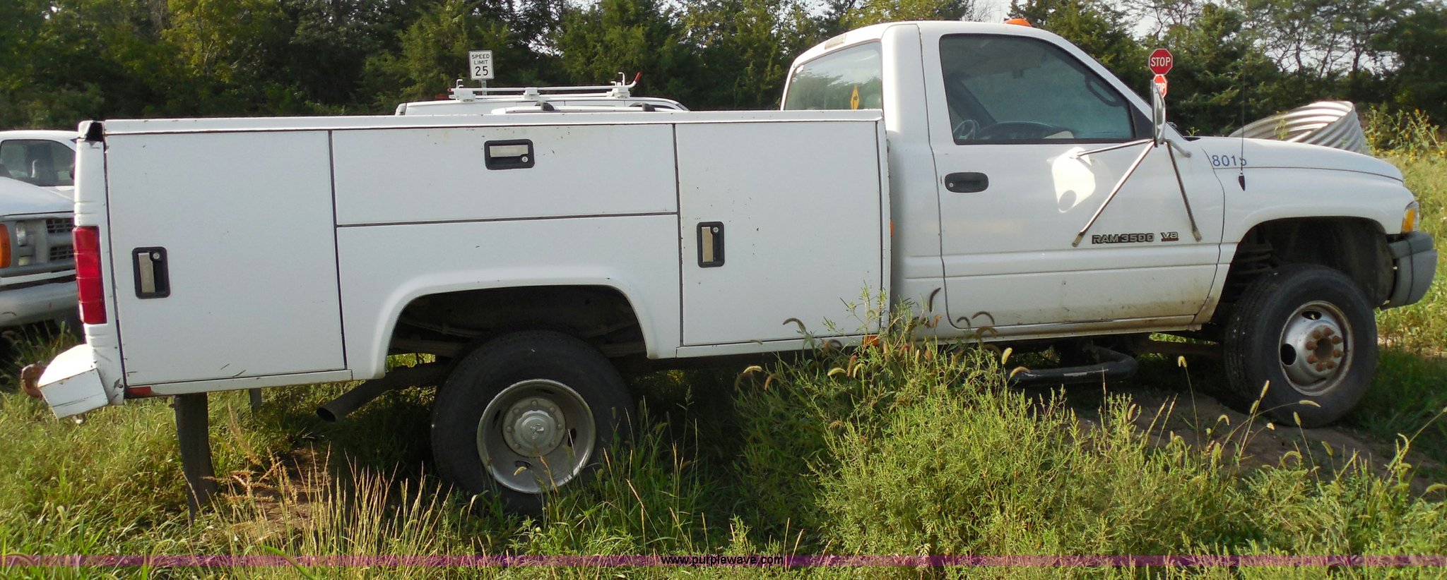 Purple Wave is selling a used Passenger Vehicle in Kansas. This item is a 1999 Dodge Ram 3500 utility truck with the following: 29,314 miles on odometer, 5.9L V8 OHV 16V gas engine, Automatic transmission, AC and heat, AM/FM/cassette, Manual windows and locks, Vinyl interior, Stahl 10' bed, Receiver hitch, 215/85R16 tires, Headliner loose, Paint chipping, Dented rear bumper, Unit# JCW8015