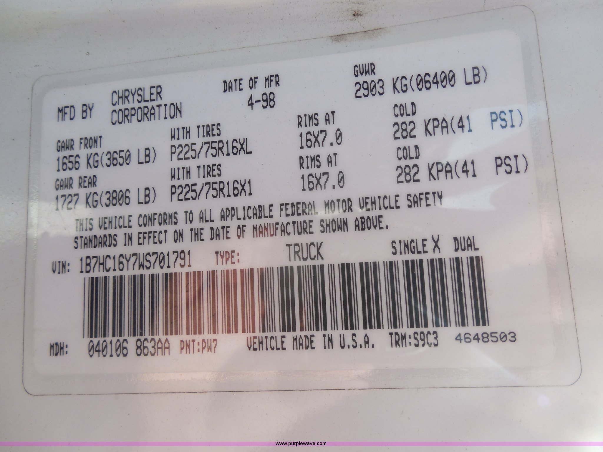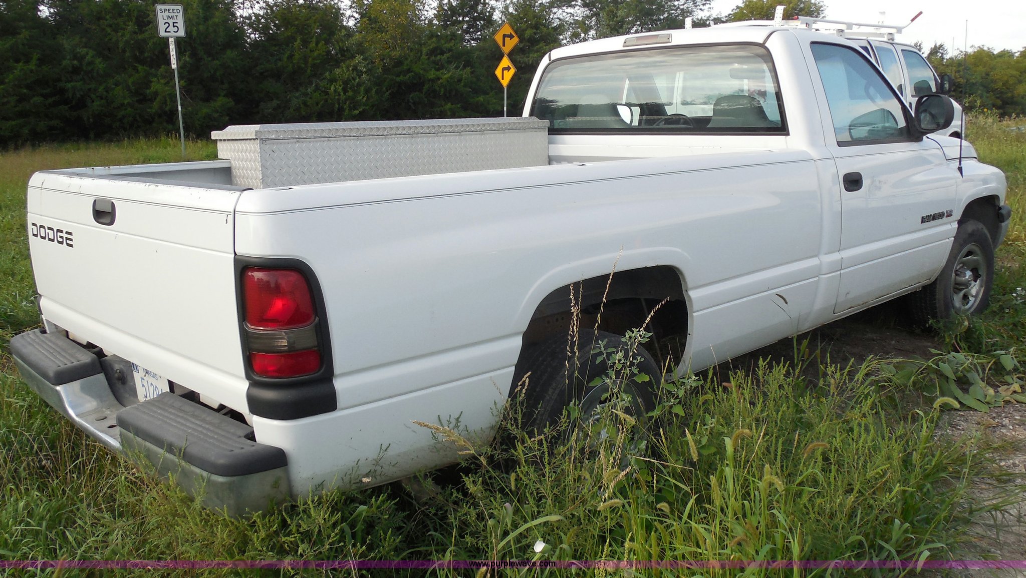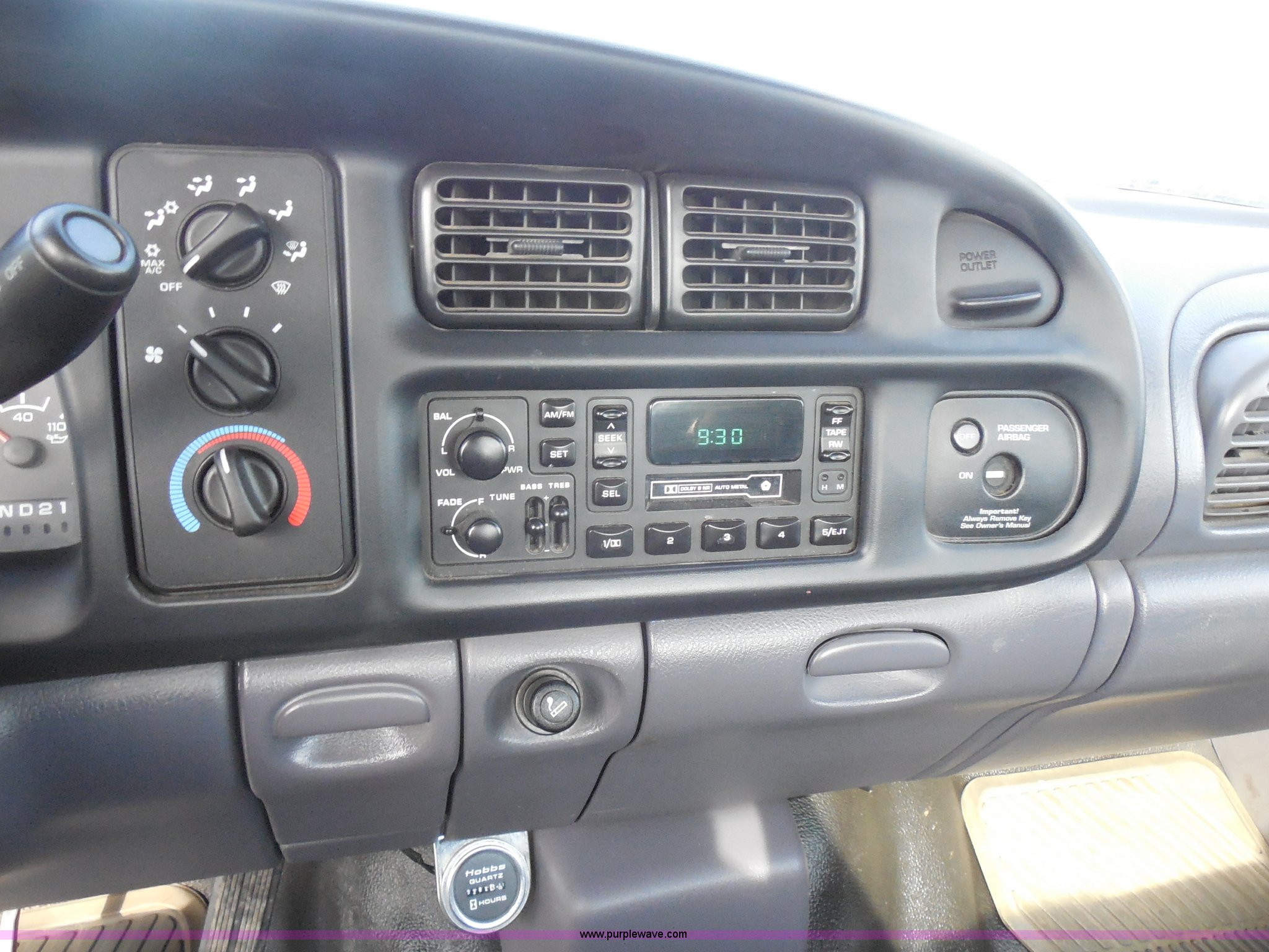 Purple Wave is selling a used Passenger Vehicle in Kansas. This item is a 1998 Dodge Ram 1500 pickup truck with the following: 84,853 miles on odometer, 5.2L V8 OHV 16V gas engine, Automatic transmission, AC and heat, Tilt, Cruise, AM/FM/cassette, Manual windows and locks, Cloth interior, Long bed, DeeZee toolbox, Bed mat, 275/75R16 tires, Maintained every 250 hours, Hole in body corner of cab on driver's side from rust, Bed dented, Cracked dashboard, Headliner loose, Unit# JCW2077