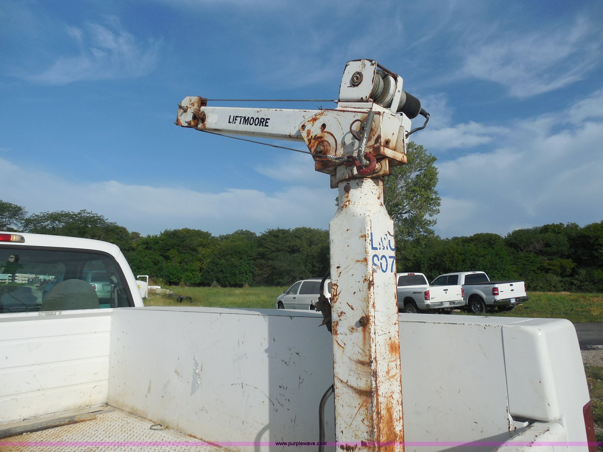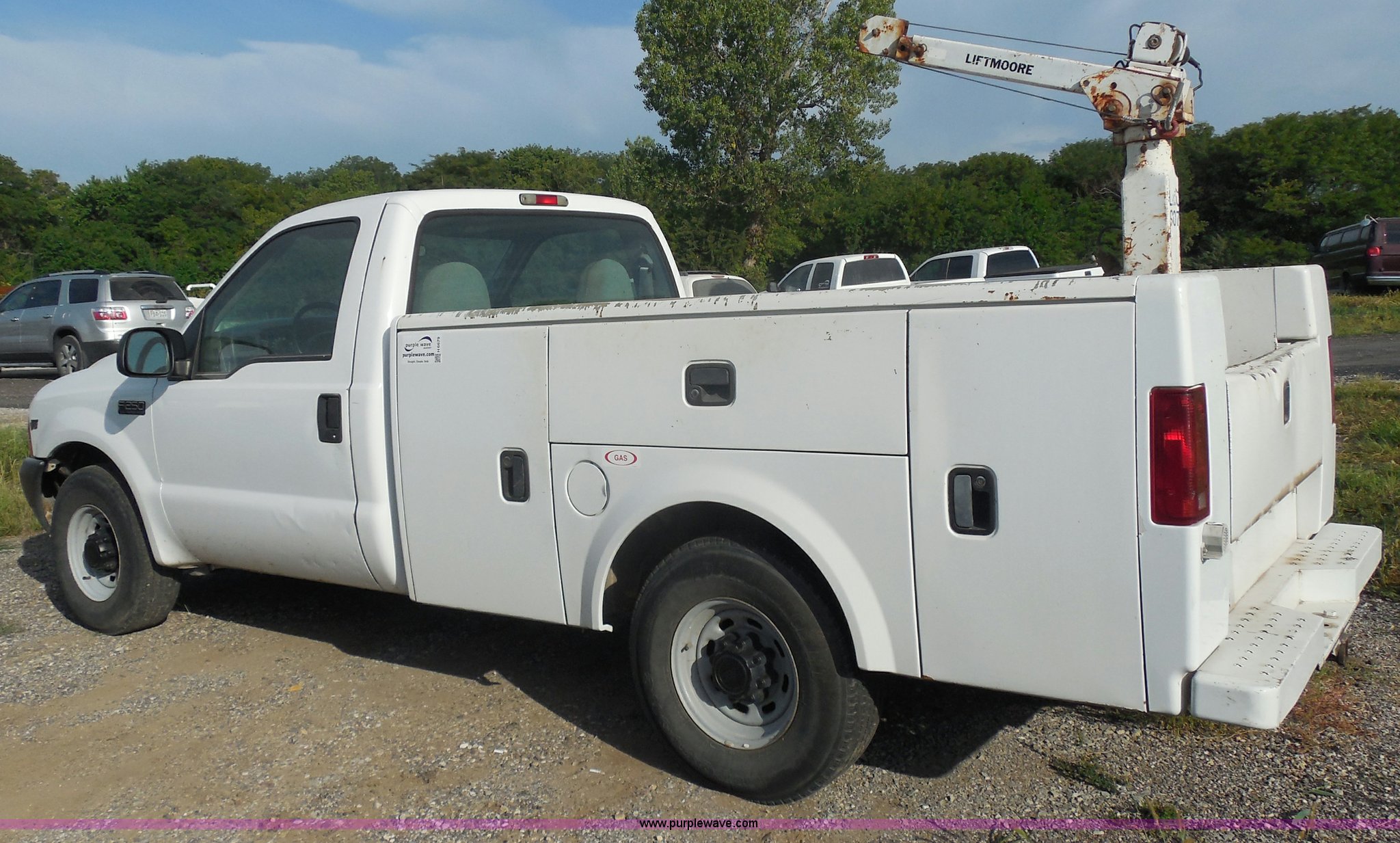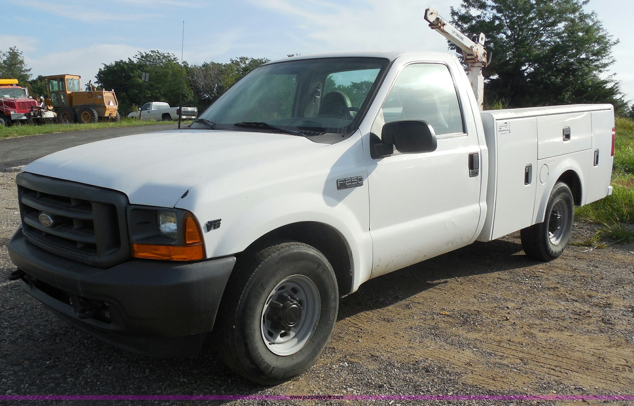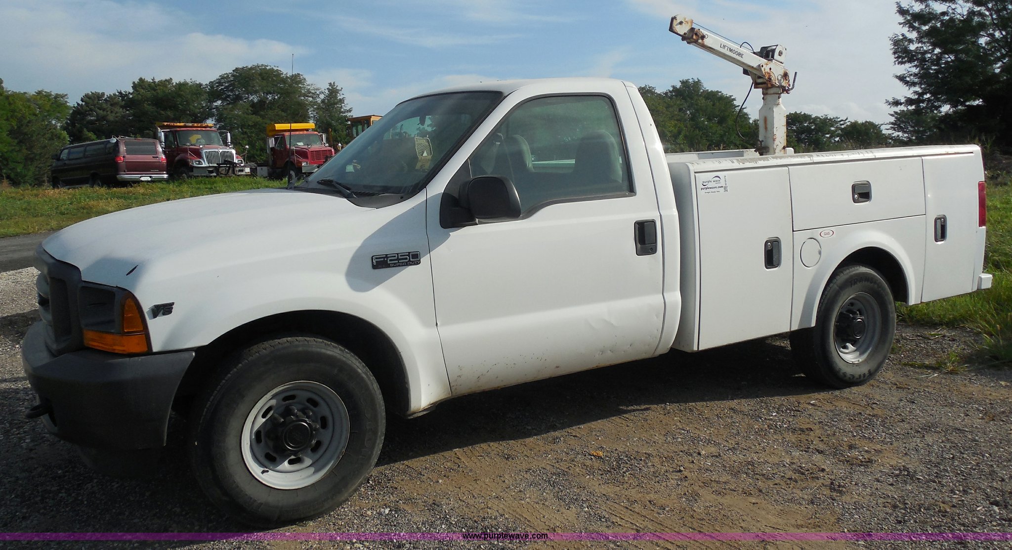 Purple Wave is selling a used Service Truck in Kansas. This item is a 2001 Ford F250 Super Duty XL utility truck with the following: 26,761 miles on odometer, 5.4L V8 SOHC 16V gas engine, Automatic transmission, AC and heat, AM/FM, Manual windows and locks, Vinyl interior, 9' utility bed, Liftmoore electric crane, Receiver hitch, Backup alarm, 235/85R16 tires, Right rear bed door is not attached, Unit# JCW9060