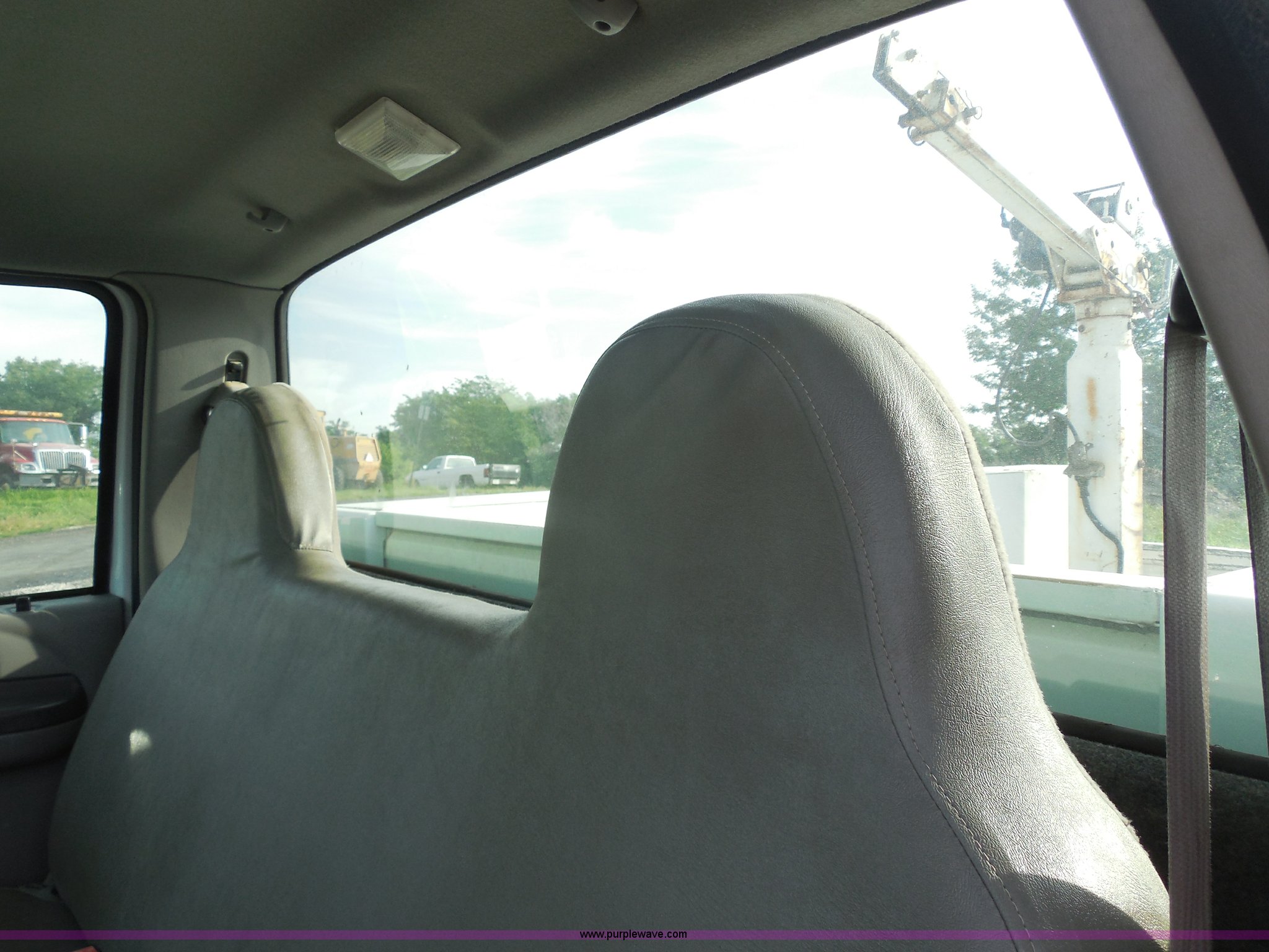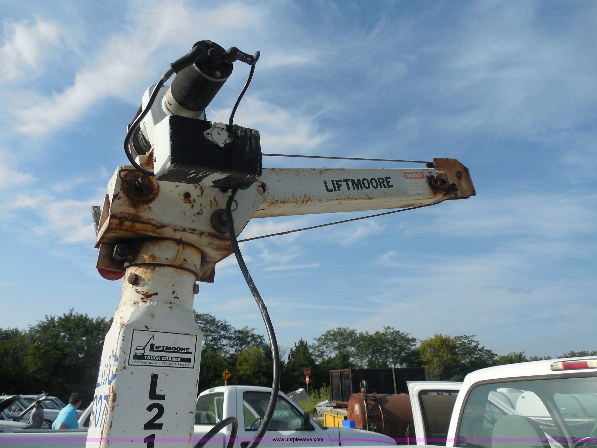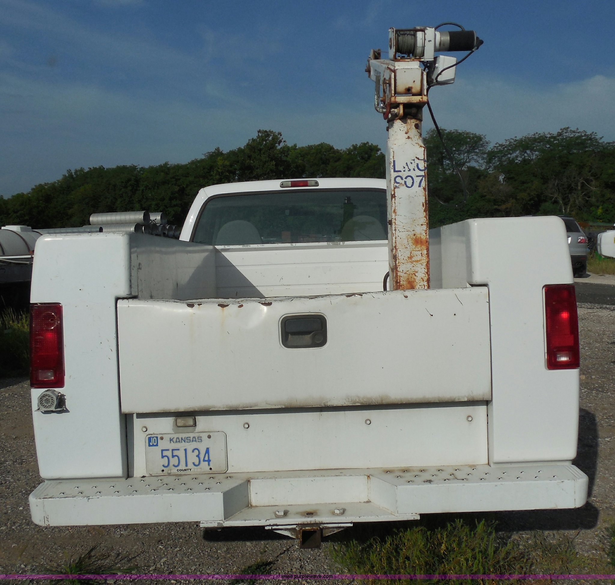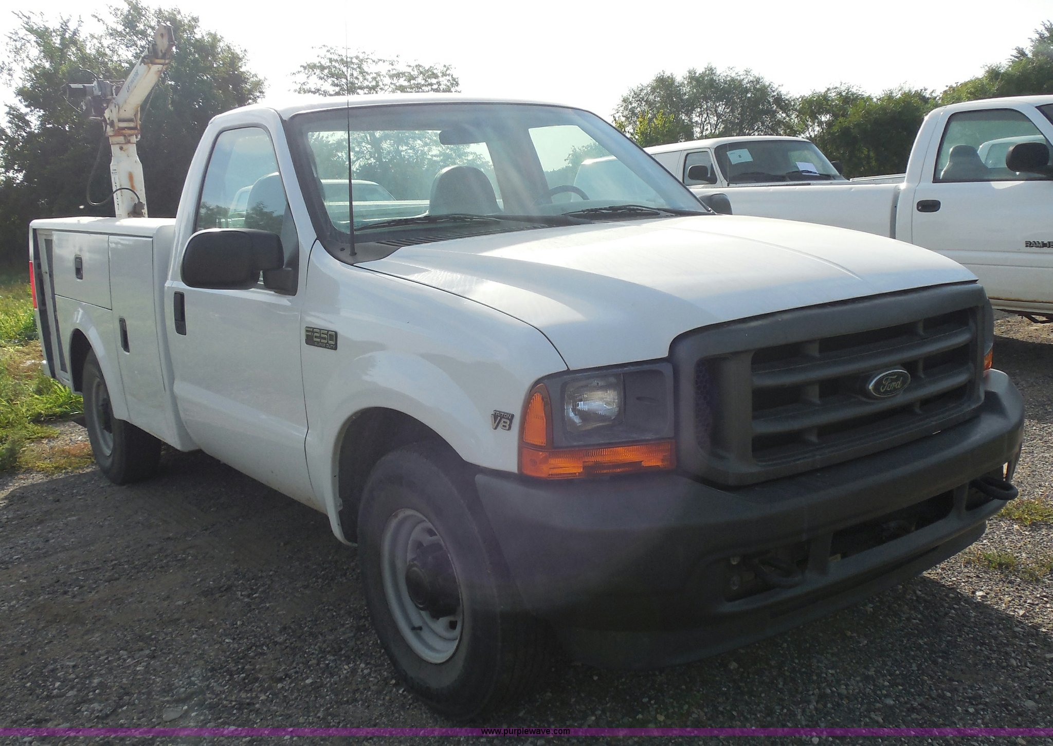 Purple Wave is selling a used Service Truck in Kansas. This item is a 2001 Ford F250 Super Duty XL utility truck with the following: 26,761 miles on odometer, 5.4L V8 SOHC 16V gas engine, Automatic transmission, AC and heat, AM/FM, Manual windows and locks, Vinyl interior, 9' utility bed, Liftmoore electric crane, Receiver hitch, Backup alarm, 235/85R16 tires, Right rear bed door is not attached, Unit# JCW9060