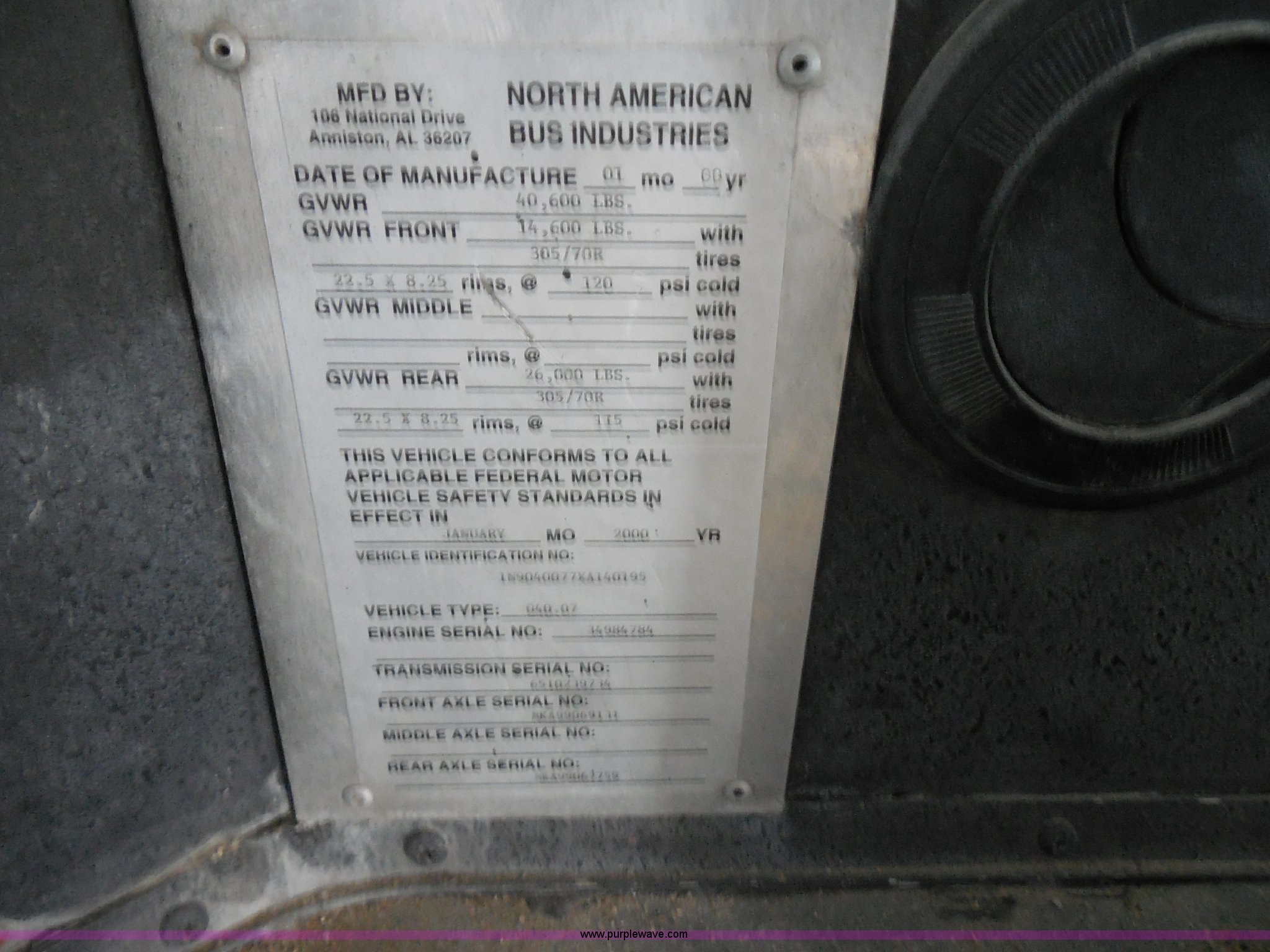 Purple Wave is selling a used Bus in Kansas. This item is a 2000 NABI 40' passenger bus with the following: 92,747 miles on odometer, Not Actual Mileage, Cummins ISM diesel engine, Allison automatic transmission, AC and heat, Cloth interior, (2) side entry doors, Aluminum wheels, 305/70R22.5 tires, GVWR 40,600 lbs, FAWR 14,600 lbs, RAWR 26,000 lbs, Dead batteries, Used has not been used in approx. six months, Unit# TRANSIT301