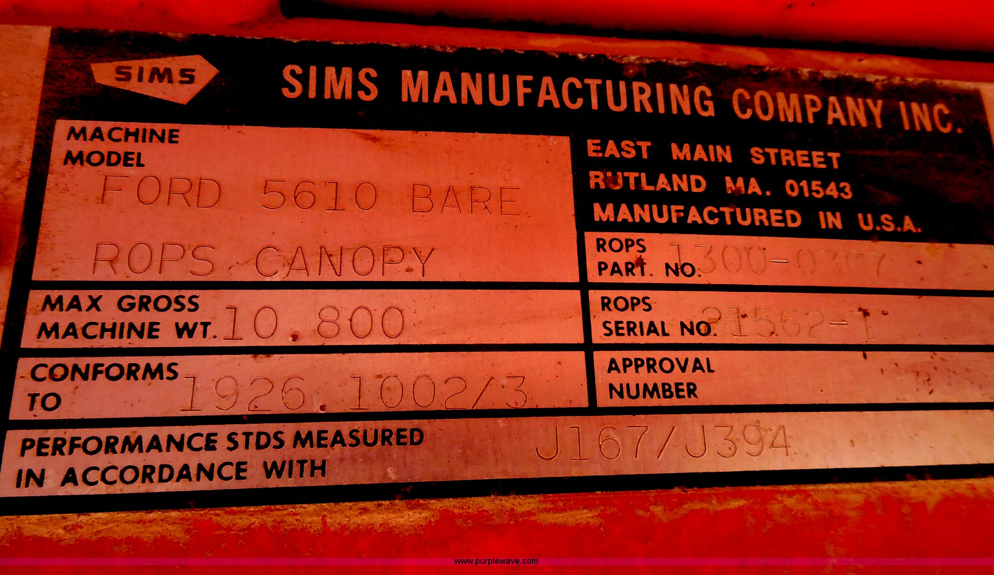 Purple Wave is selling a used Tractor in Kansas. This item is a 1983 Ford 5610 tractor with the following: 5,967 hours on meter, Ford four cylinder diesel engine, Serial 3J13A, Four speed manual transmission, Hi-Lo, OROPS, Three point, Draw bar, 540 PTO, 21 gallon fuel tank, 11L-15 front tires, 16.9-24 rear tires, 10,800 lbs. base operating weight, Missing battery, Hydraulic pump is bad, Mower is not included, Serial C707813, Unit# 75