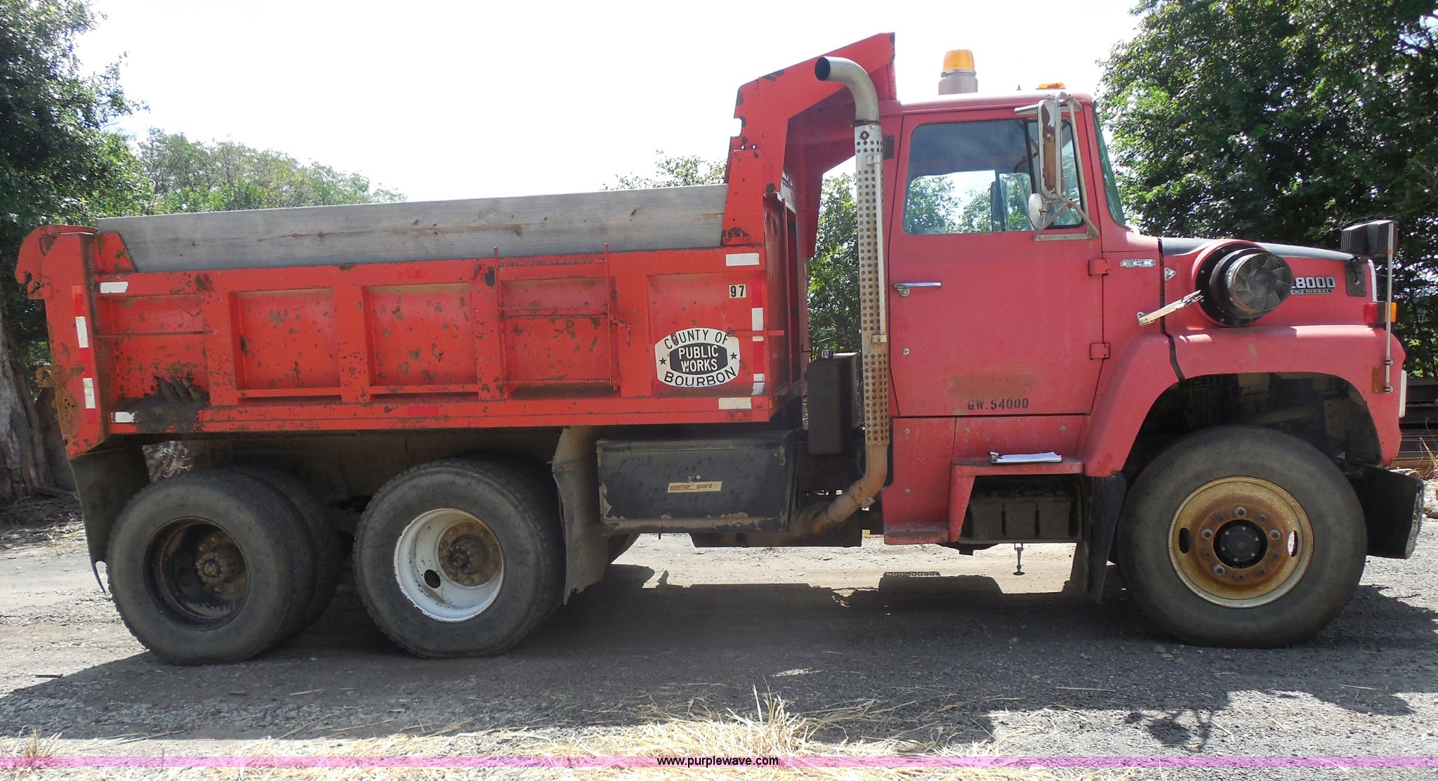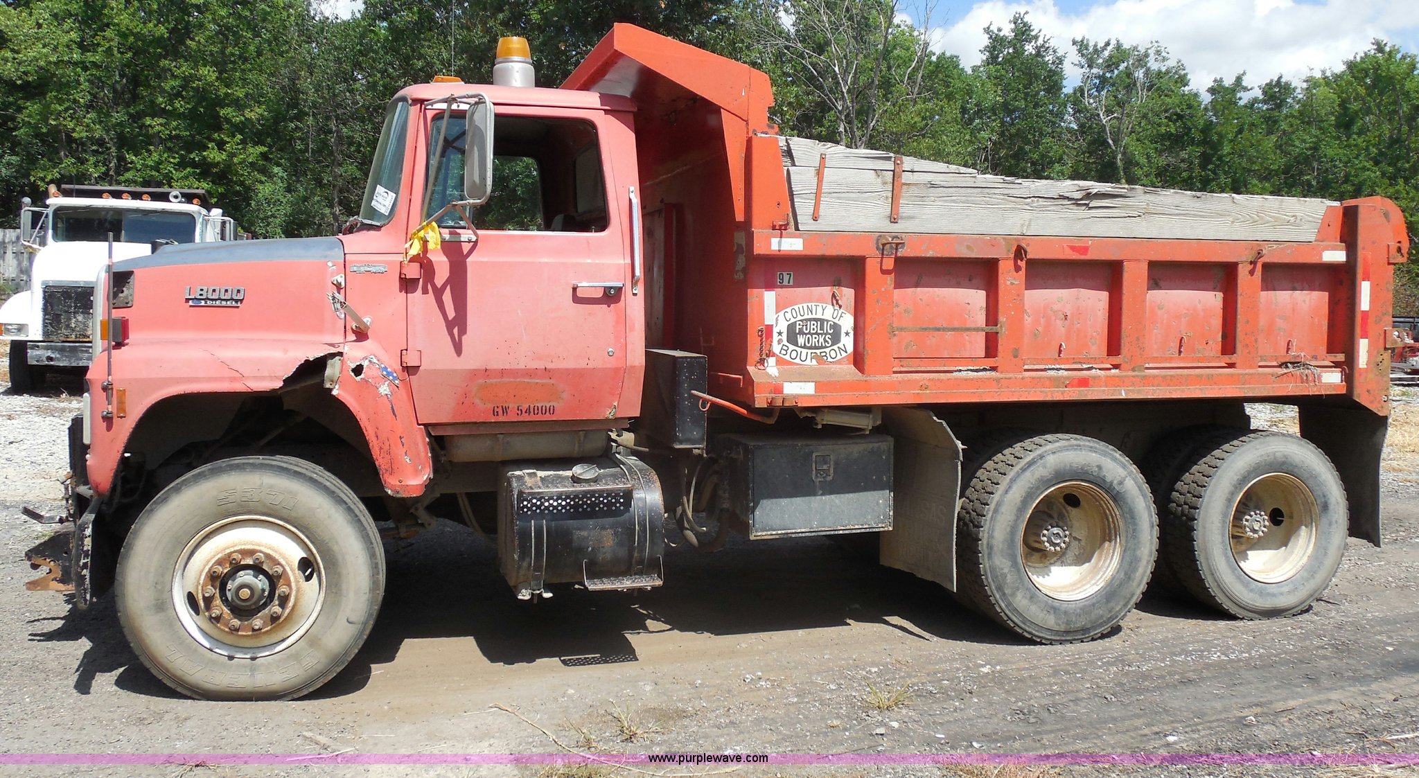 1989 Ford LNT8000 dump truck. 280,523 miles on odometer, 5,567 hours on meter, 7.8L L6 turbo diesel engine, Automatic transmission, Heat, AM/FM, 8'L dump bed Manual end gate, 50 gallon fuel tank, Pintle hitch, PTO, Spring suspension, 174" wheelbase, 11R24.5 tires, GVWR 46,000 lbs. 1FDYW82AXKVA23843. Bourbon County Public Works. 1427 215th Street. Fort Scott, KS 66701