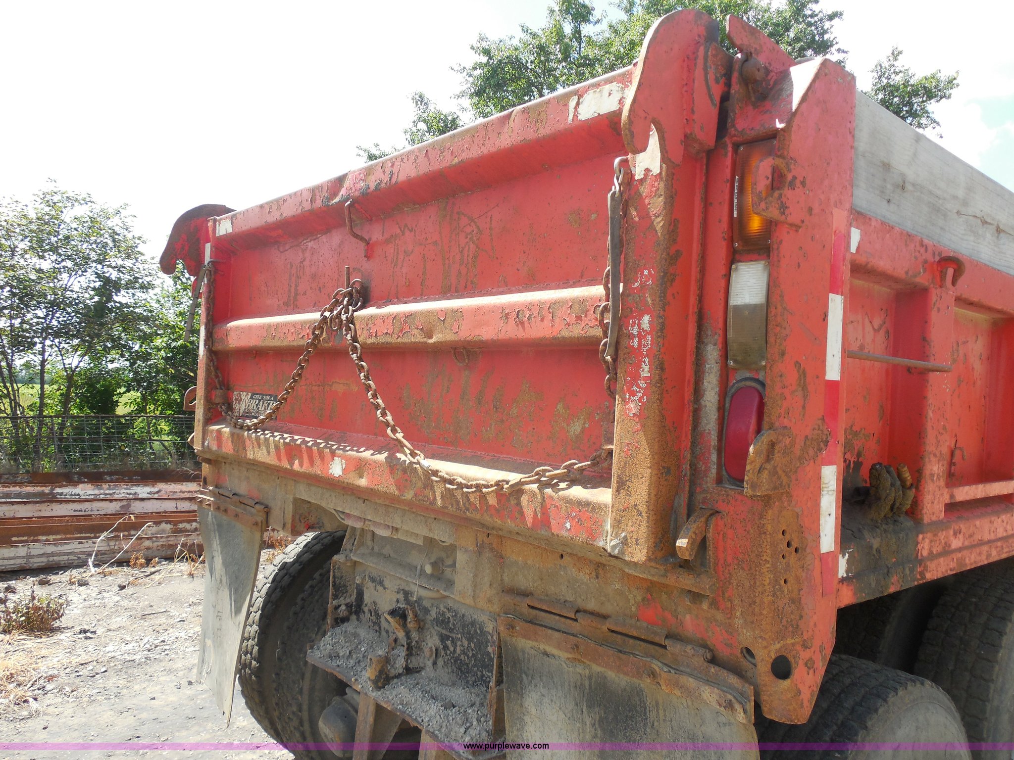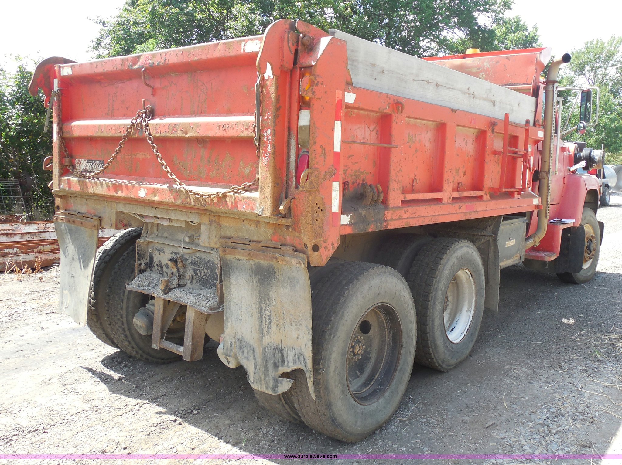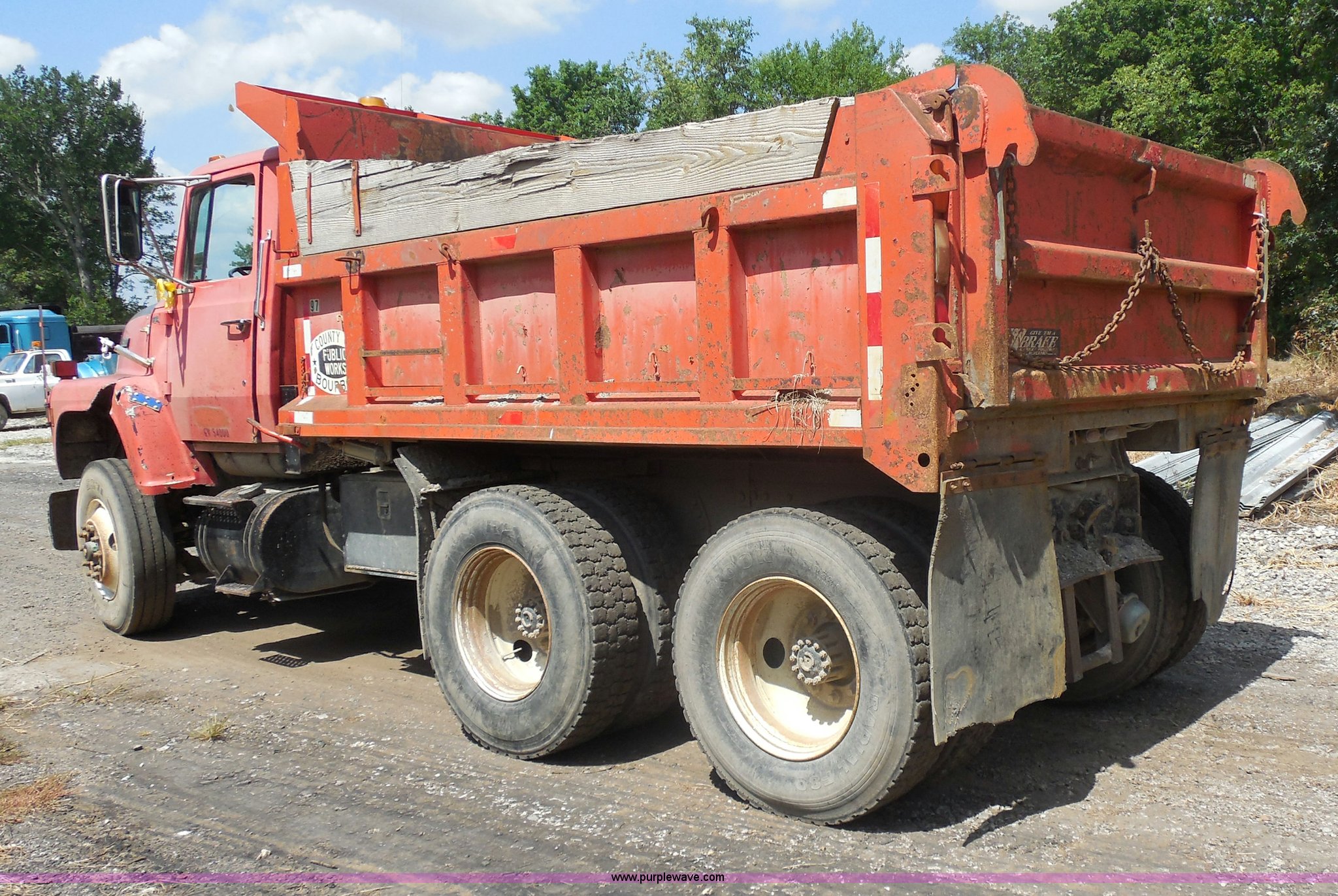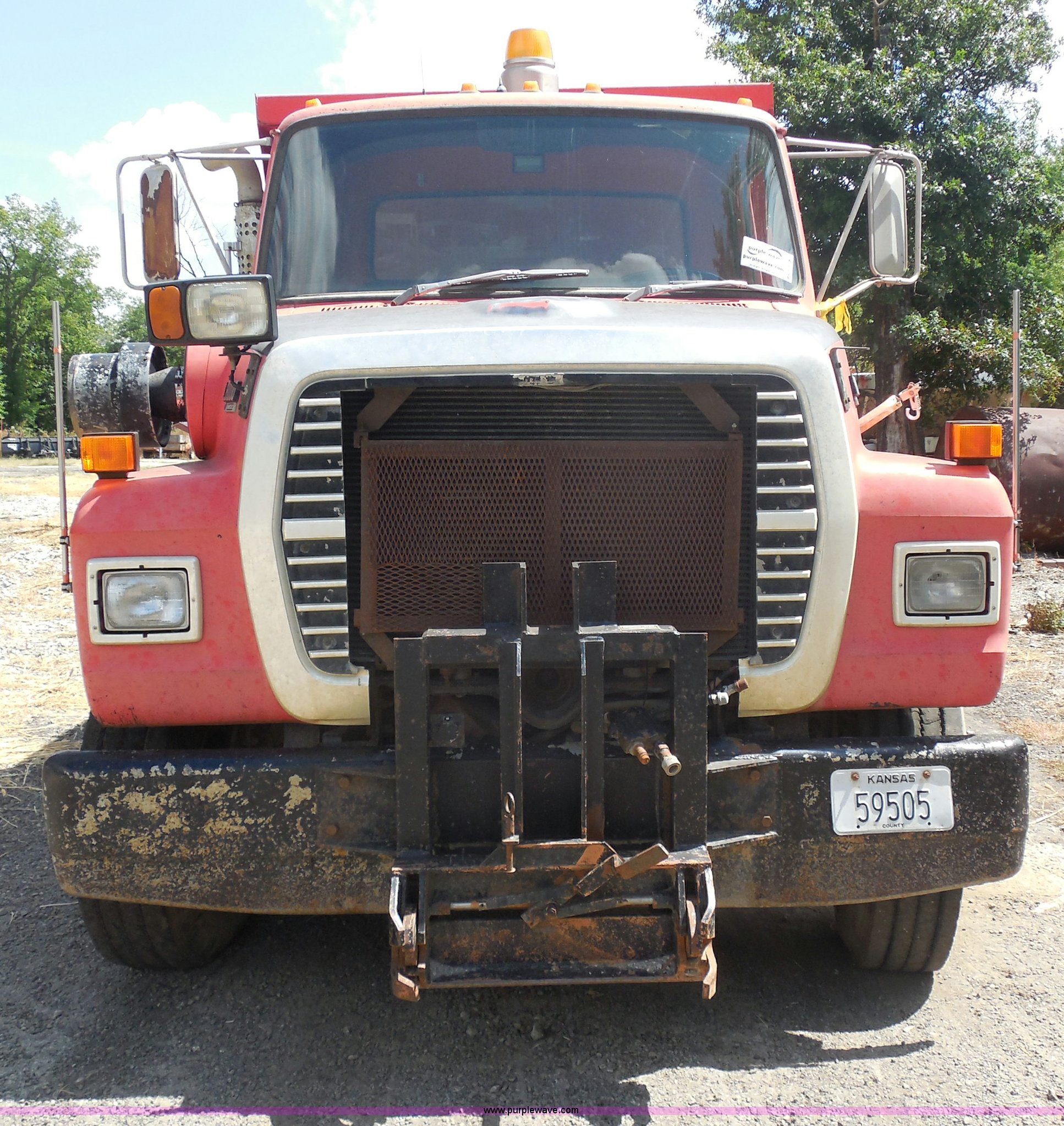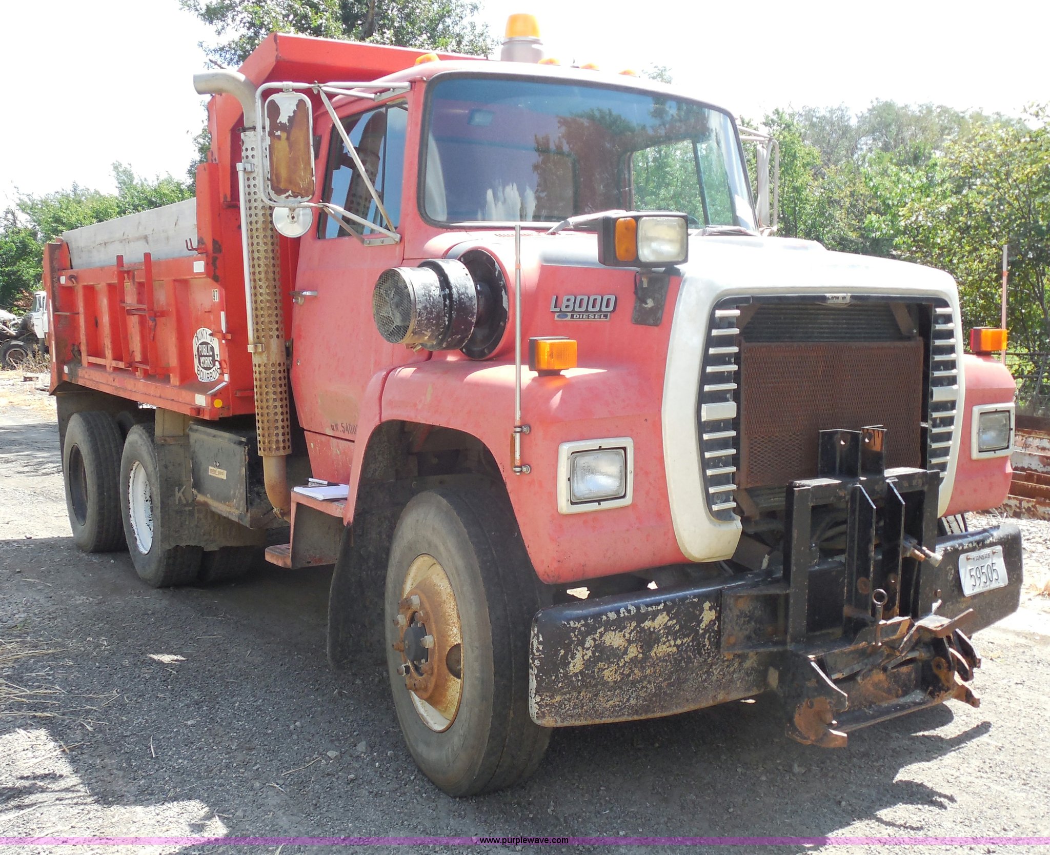 Purple Wave is selling a used Construction Dump Truck in Kansas. This item is a 1989 Ford LNT8000 dump truck with the following: 280,523 miles on odometer, 5,567 hours on meter, 7.8L L6 turbo diesel engine, Automatic transmission, Heat, AM/FM, 8'L dump bed, Manual end gate, 50 gallon fuel tank, Pintle hitch, PTO, Spring suspension, 174" wheelbase, 11R24.5 tires, GVWR 46,000 lbs