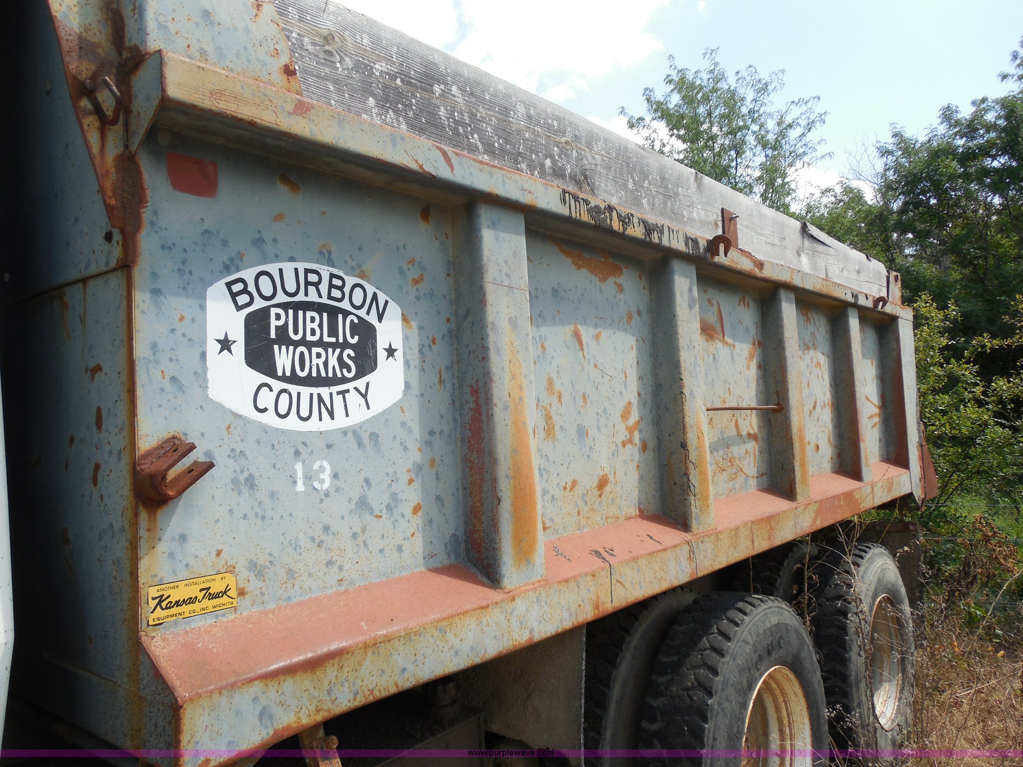 1991 Ford LT8000 dump truck. 324,238 miles on odometer, Ford 7.8L L6 diesel engine, Eaton Fuller eight speed manual transmission, AM/FM, 14'L dump bed, Dual 50 gallon fuel tanks, PTO, Spring suspension, 186" wheelbase, 11R24.5 tires, GVWR 46,000 lbs, FAWR 12,000 lbs, RAWR 17,000 lbs, Unit inoperable Possible starter issue, End gate missing. 1FDYU82AXMVA23477. Bourbon County Public Works. 1427 215th Street. Fort Scott, KS 66701