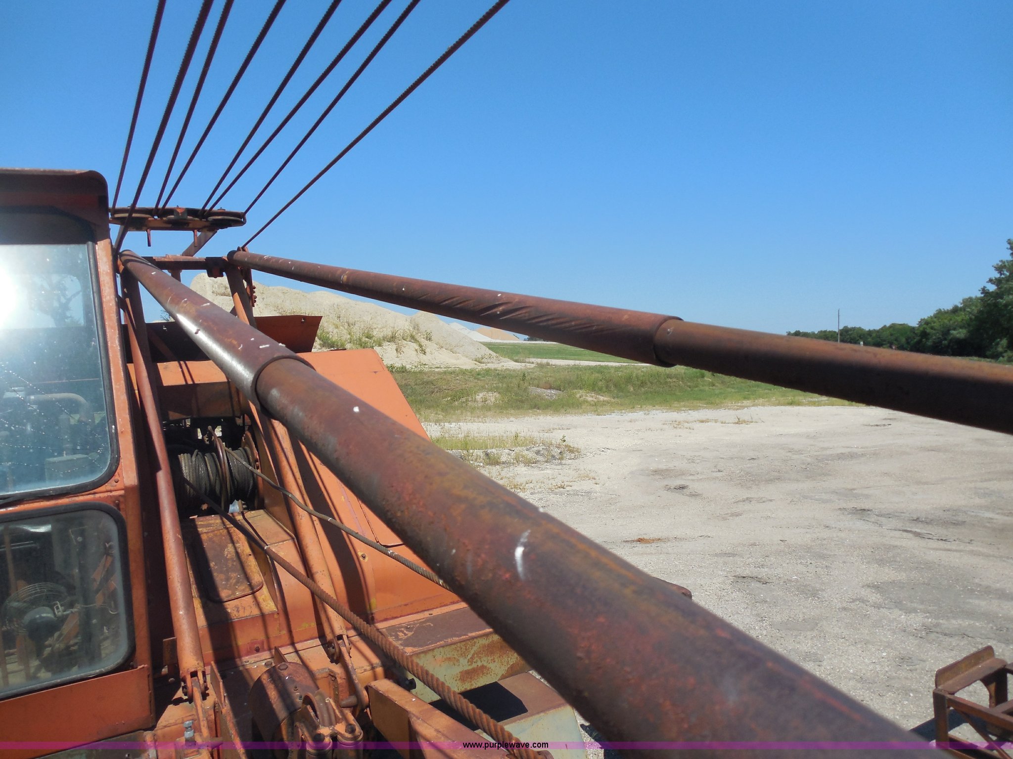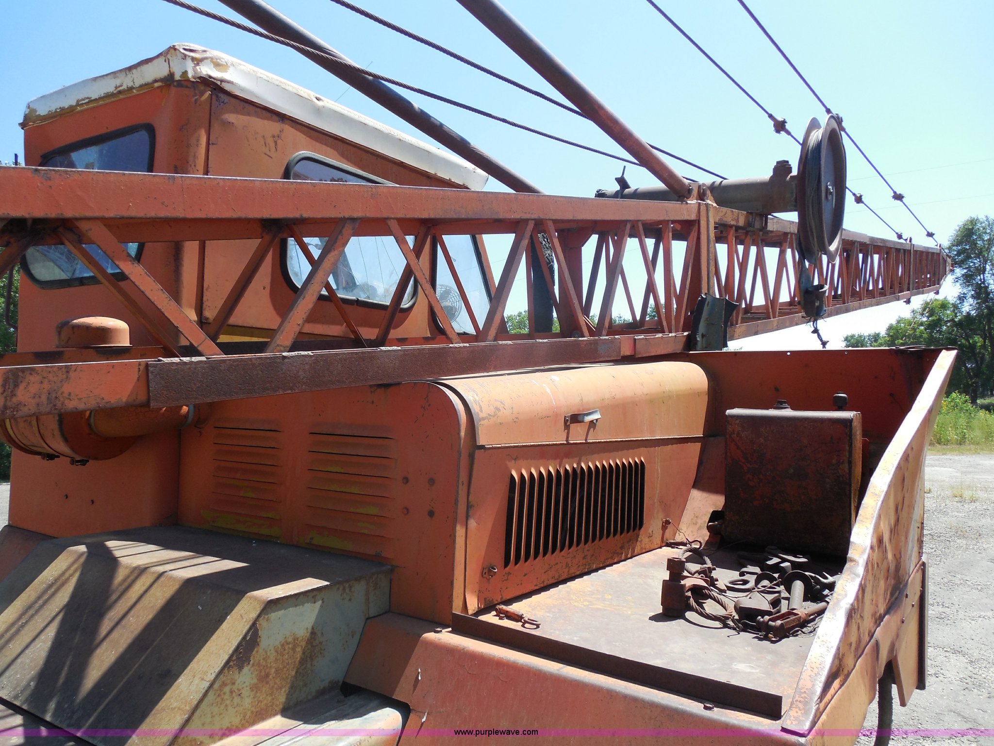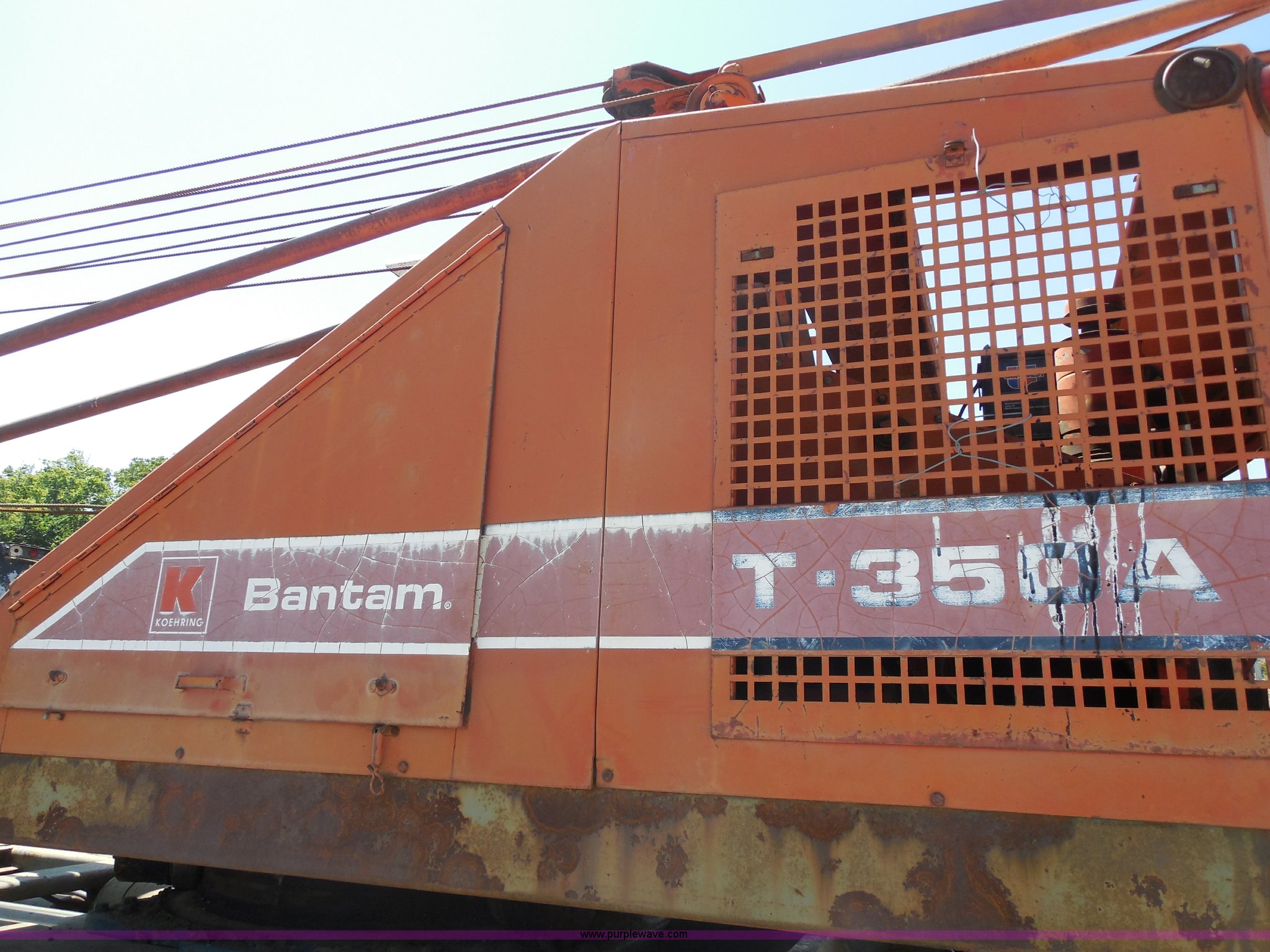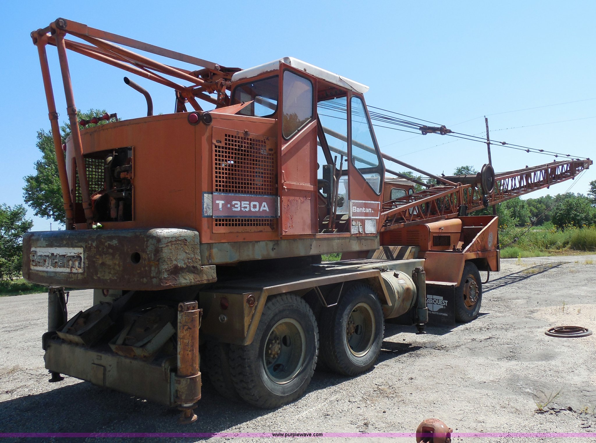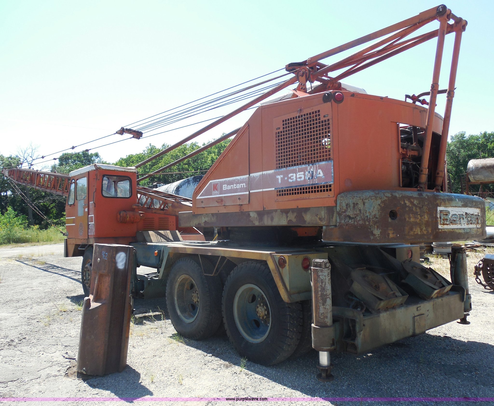 Purple Wave is selling a used Truck Crane in Kansas. This item is a 1975 Bantam T-350 18 ton crane with the following: 15,775 miles on odometer, Continental 226 six cylinder gas crane engine, Electronic ignition, Ford 361 C.I.D. truck engine, Five speed manual transmission, Heat, 40 gallon fuel tank, Outriggers, Johnson 85 lbs ball, Maxi brakes, 5,500 lbs counter weight, 9.00-20 tires, Serial 39393