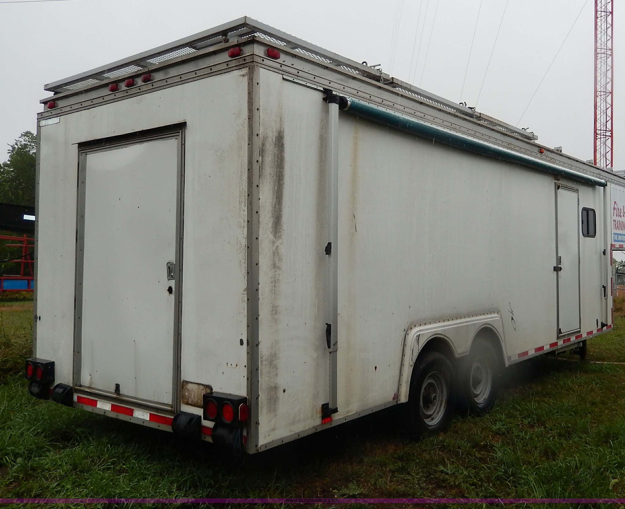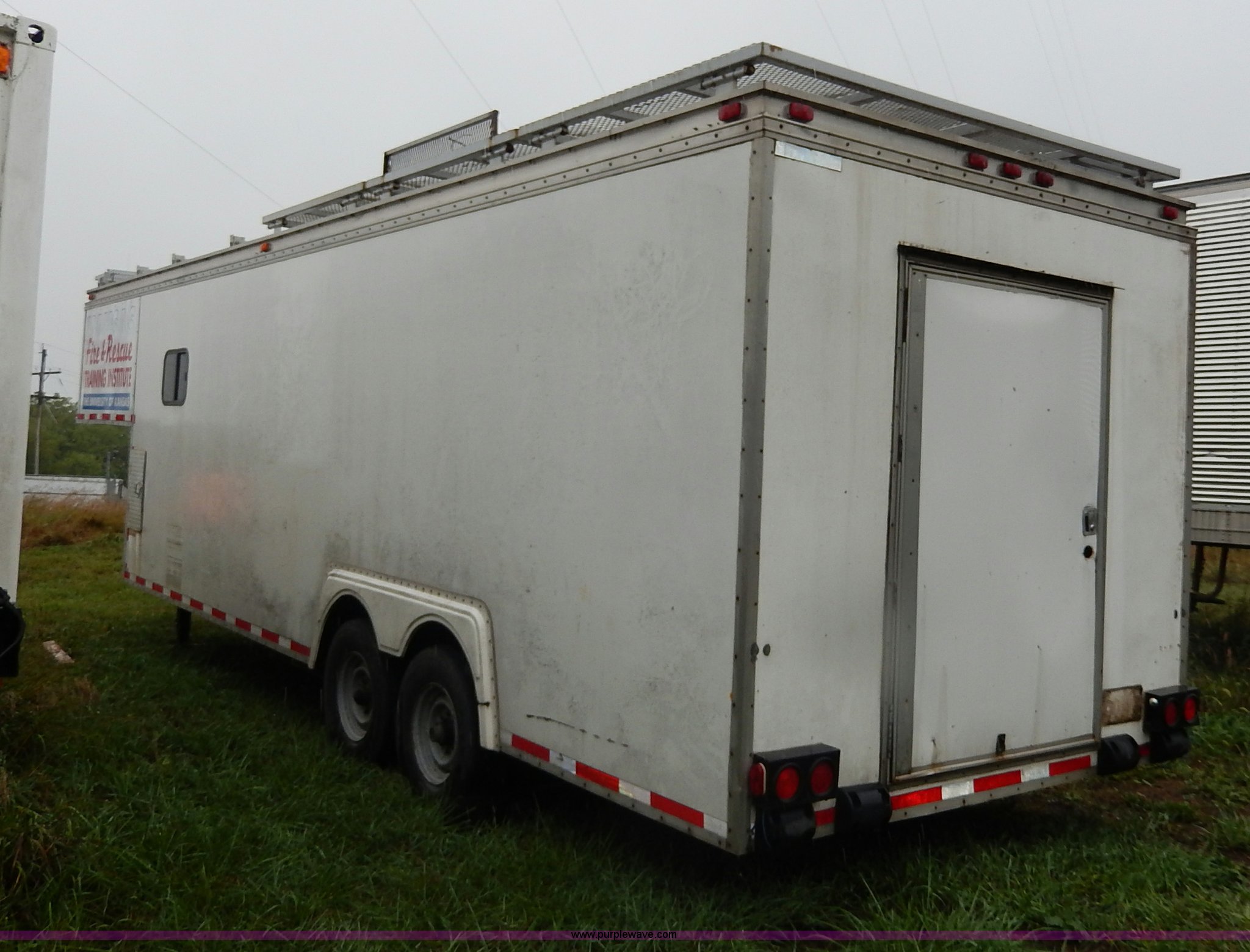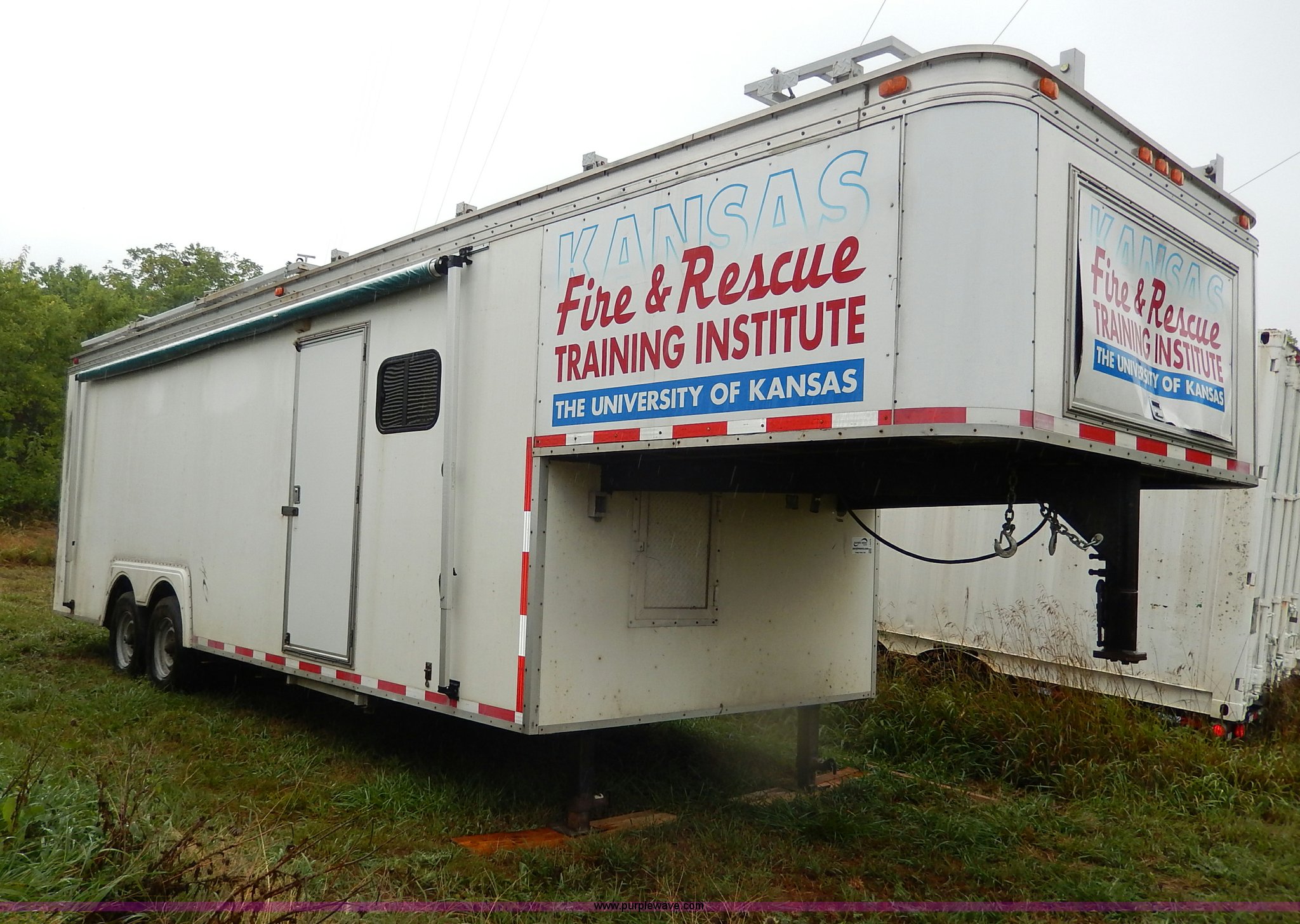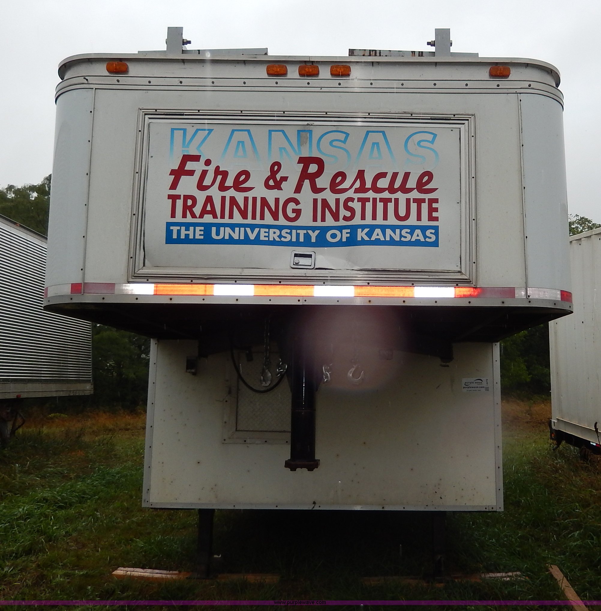 Purple Wave is selling a used Enclosed Cargo Trailer in Kansas. This item is a 1994 Speedwagon fifth wheel fire rescue simulator trailer with the following: 24'L main body, 88"H interior, 7'L tongue, 102"W, Outlet compartment, Hide-away jack handle compartment, Awning, Rear and side door entry, Interior dead bolt, 8' ramp, Stairs to top side, Retractable side rails and roof simulator for drills, Lights, Safety chains, 235/85R16 tires, GVWR 12,000 lbs