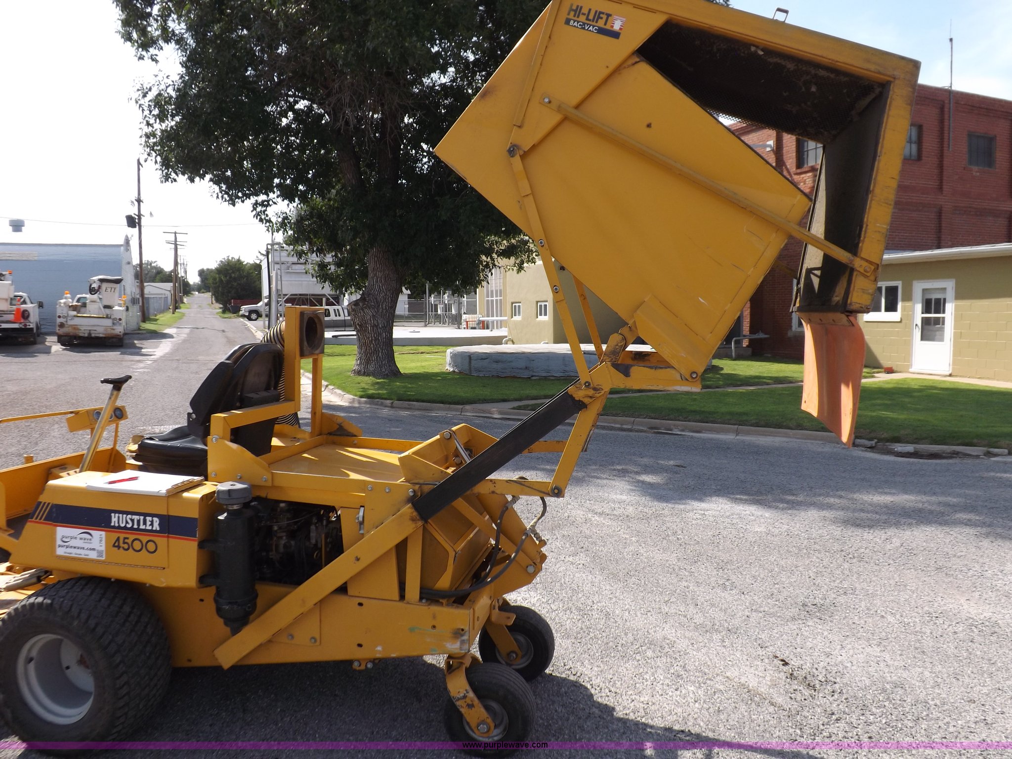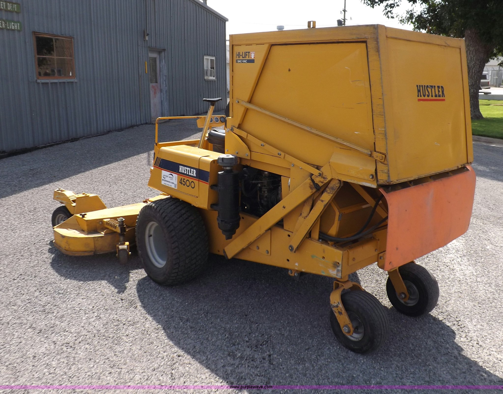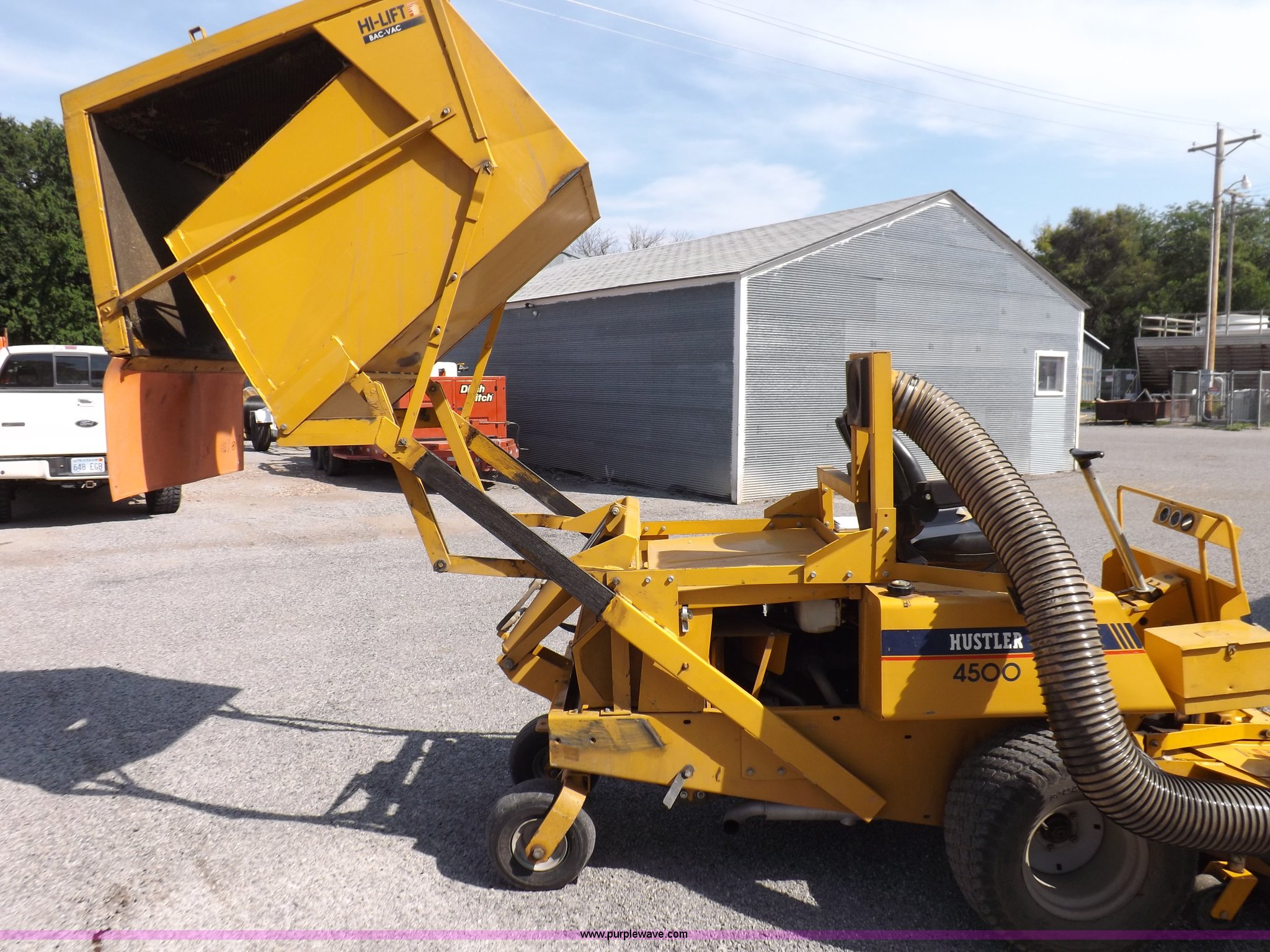 Purple Wave is selling a used Commercial Turf Mower in Kansas. This item is a 2003 Hustler 4500 lawn mower with the following: Model 924738, 2,066 hours on meter, 72" deck, Ford four cylinder engine, Hydrostatic transmission, High lift bagging system with auto dump, Hydraulic deck lift, 26x12-12 drive tires, 13x6.5-6 rear tires, Additional parts included, Engine runs, has electrical issues, Serial 01014022