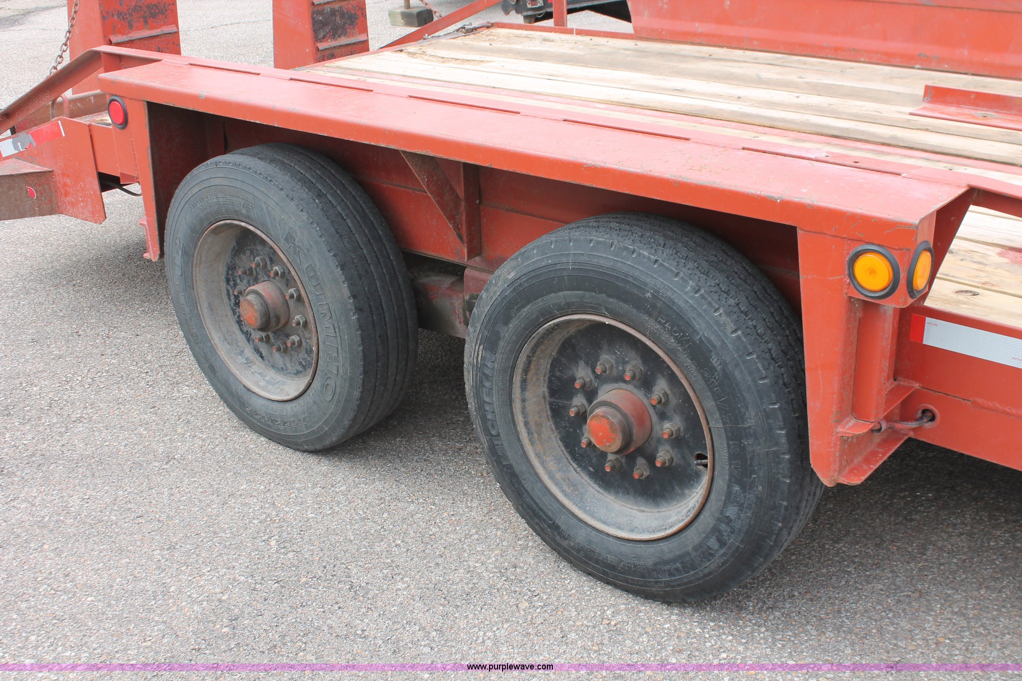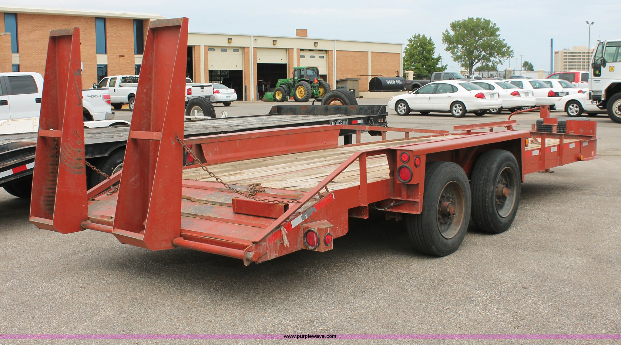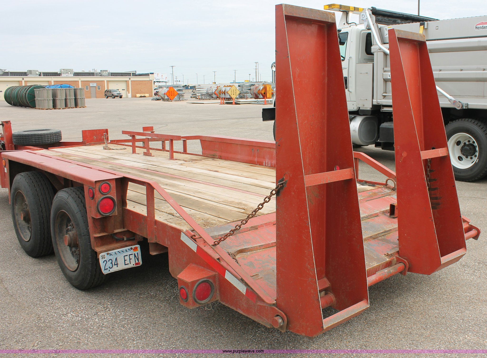 Purple Wave is selling a used Equip. Trailer in Kansas. This item is a 2005 Belshe equipment trailer with the following: 18'L x 81.5"W, 33.5" dovetail, Wood floor, Steel dovetail, (2) sliding fold up ramps, 60"L x 13.75"W, Toolbox mounting frame, Rod rack, Single post jack stand, (7) D-ring tie downs, Adjustable height pintle hitch, Six pin trailer wiring, Full fenders, Spring suspension, Tandem axle, 215/75R17.5 tires, Directional drill hauling application