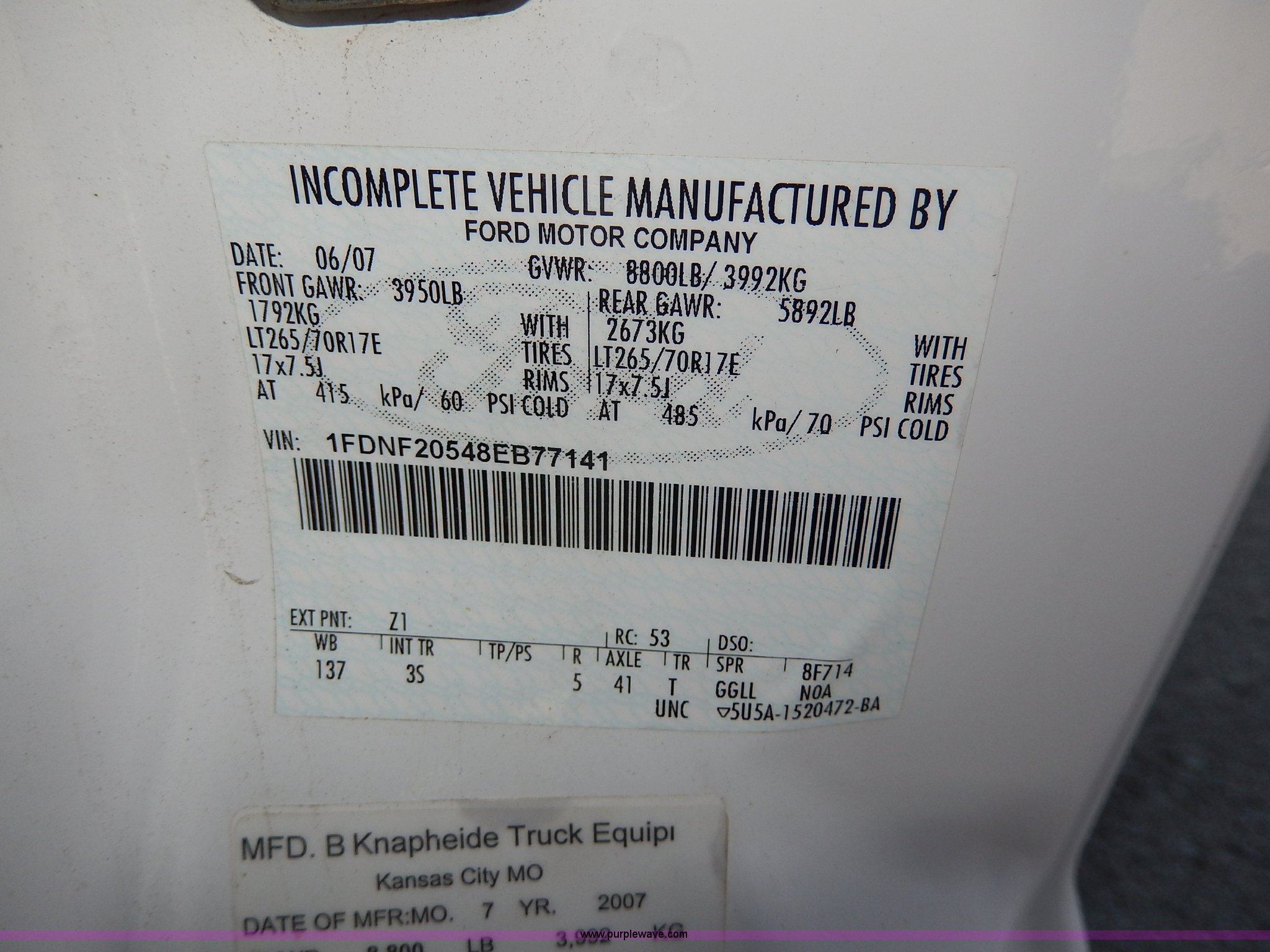 2008 Ford F250 Super Duty XLT utility truck. 164,184 miles on odometer, 5.4L V8 SOHC 16V gas engine, Automatic transmission, AC and heat, Tilt, Cruise, AM/FM/CD, Power windows, locks, and mirrors, Cloth interior, Keyless entry, Knapeide 696S utility bed, Serial 20070522-0073127, Front tow hooks, Delta III running boards, Trailer wiring , Pintle hitch, 265/70R17 tires, Rust, Unit# 2082. 1FDNF20548EB77141. Kansas Turnpike Authority - Topeka. 3939 SW Topeka Blvd. Topeka, KS 66609