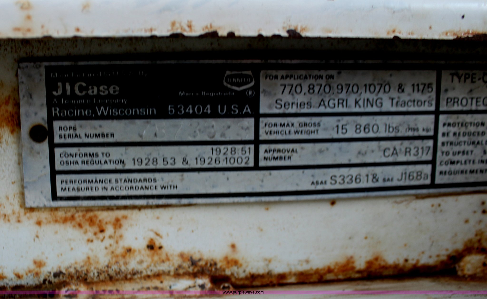 Purple Wave is selling a used Tractor in Kansas. This item is a Case 1175 tractor with the following: 2,041 hours on meter, Six cylinder diesel engine, Powershift transmission, 540 PTO, Draw bar, Top link included, (2) rear hydraulic remotes, 11.00-15 front tires, 18.4R38 dual rear tires, Serial 1012965