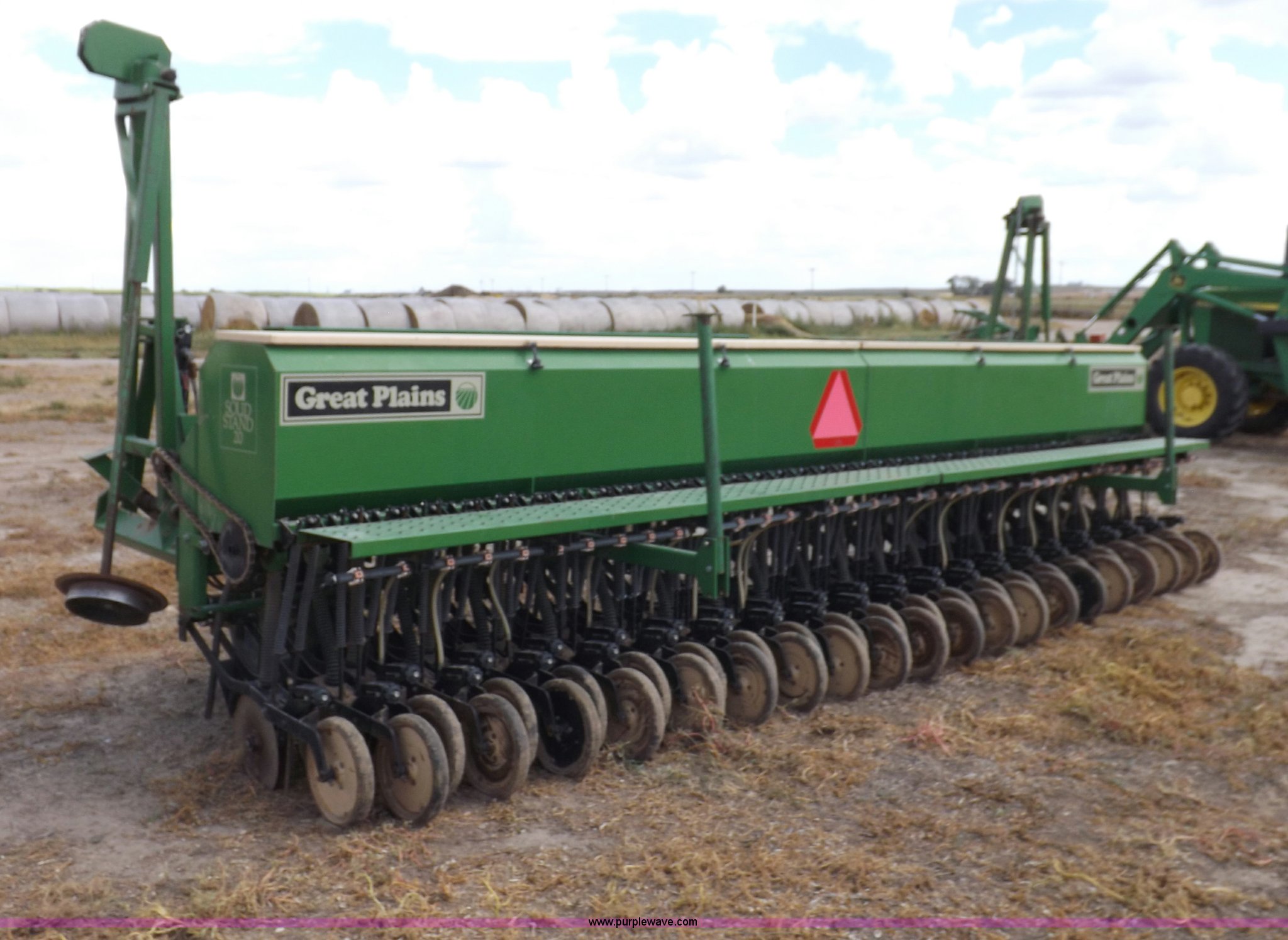 Purple Wave is selling a used Grain Drill or Seeder in Kansas. This item is a Great Plains Solid Stand 20 drill with the following: Model 400685-0131, 6" spacing, 2" x 17" press wheels, Three point, Row markers, Alfalfa seed boxes, Liquid plumbed, 13" openers, 9.5-15 tires, Serial 3070B