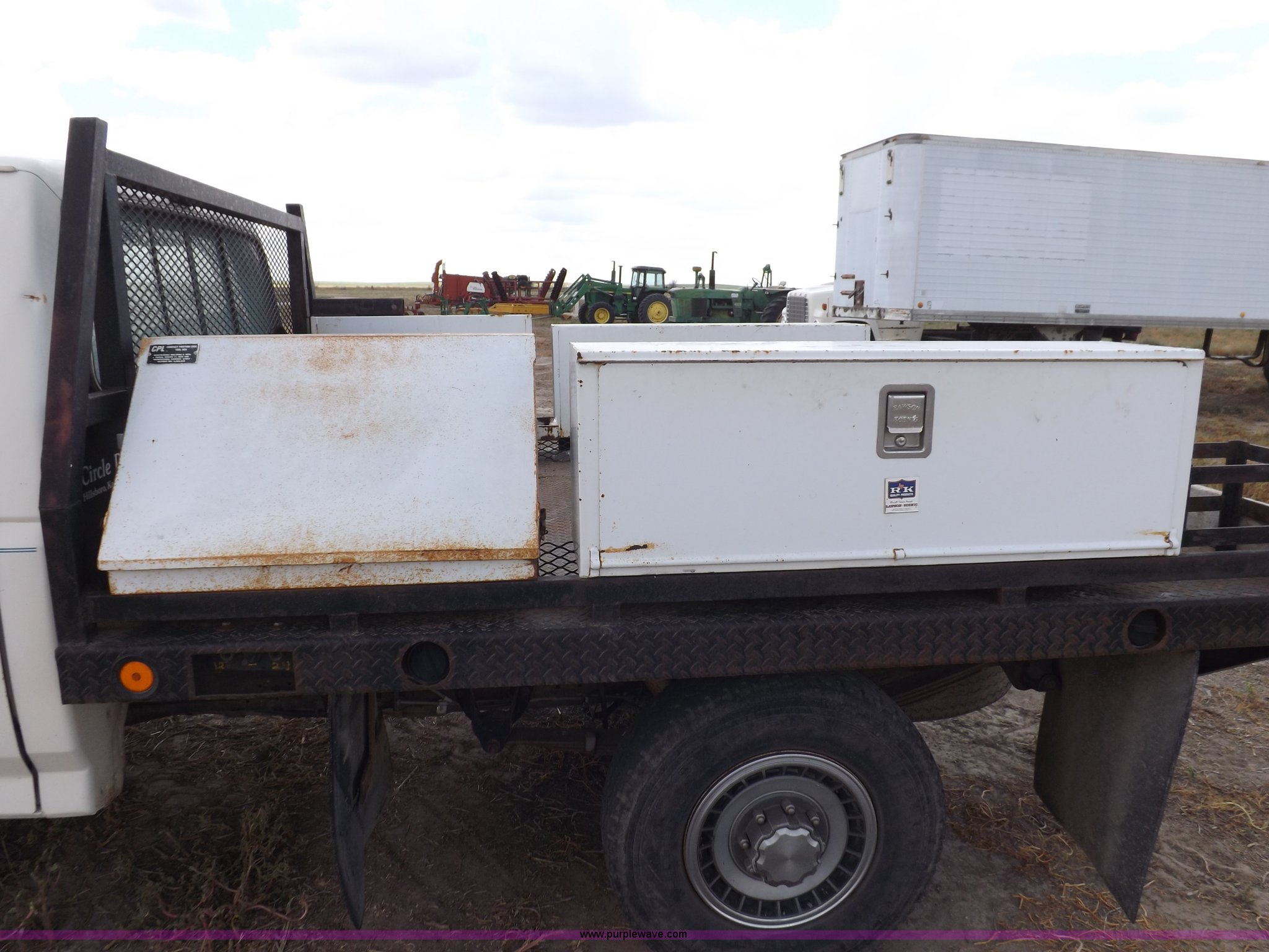Purple Wave is selling a used Passenger Vehicle in Kansas. This item is a 1990 Ford F250 XL pickup truck with the following: 70,498 miles on odometer, 5.8L V8 OHV 16V gas engine, Five speed manual transmission, AC and heat, AM/FM, Manual windows and locks, Vinyl interior, Sliding rear window, Circle D flatbed, 8.5'L x 7'2"W, Headache rack, Recessed 2 5/16" gooseneck ball, (2) Rawson-Koenig storage boxes, 48"L x 20"D x 16"H, 30"W x 18"D x 18"H, CPL toolbox, 30"W x 17"H x 15"D,, 2" ball hitch, Trailer wiring, 235/85R16 tires, Right side dented, Seat torn, Cracked windshield