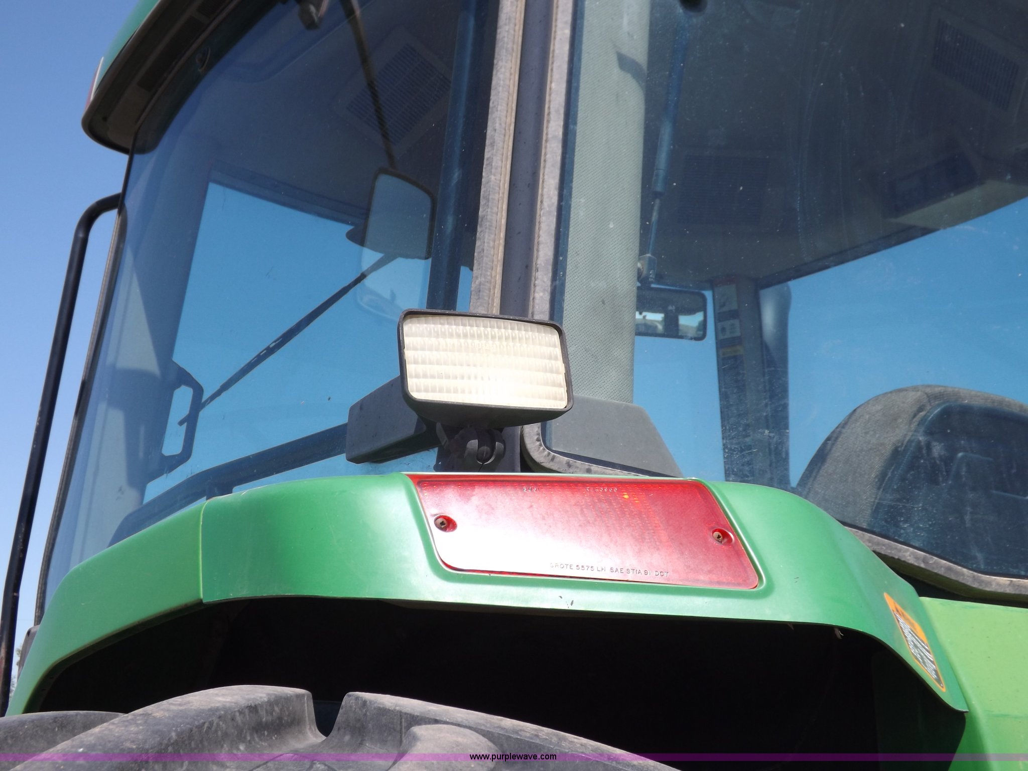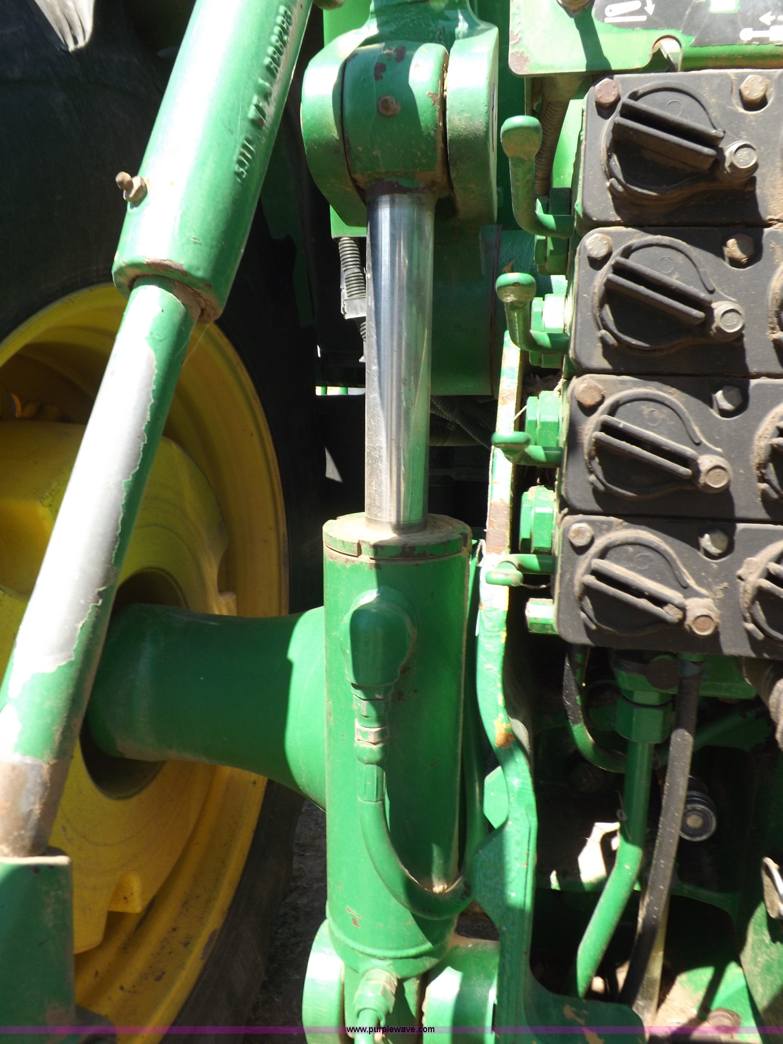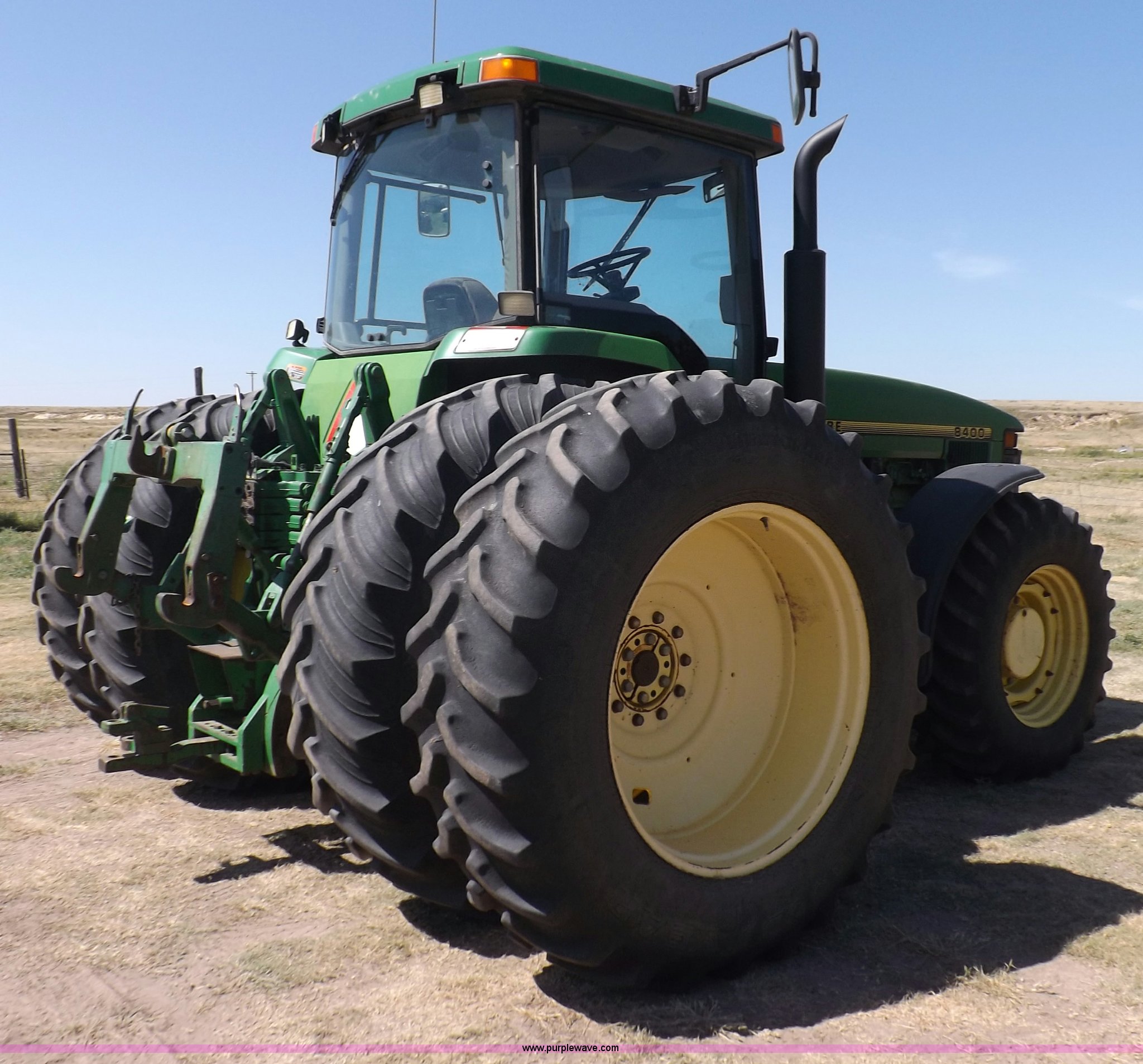 Purple Wave is selling a used Tractor in Kansas. This item is a 1996 John Deere 8400 MFWD tractor with the following: 9,437 hours on meter, John Deere six cylinder diesel engine, Model 6081HRW01, 225 HP, Serial RG6081H002824, Powershift transmission, 16F-4R gears, AC and heat, AM/FM, Air suspension seat, Tilt steering wheel, Three point, Quick attach, Draw bar, Auxiliary outlet, 1000 PTO, Rear hydraulic remotes, (16) 47 kg suitcase weights, Wheel weights, 116" wheelbase, 520/85R24 front tires, 420/90R30 dual rear tires, Front tires filled with calcium, Serial RW8400P006090