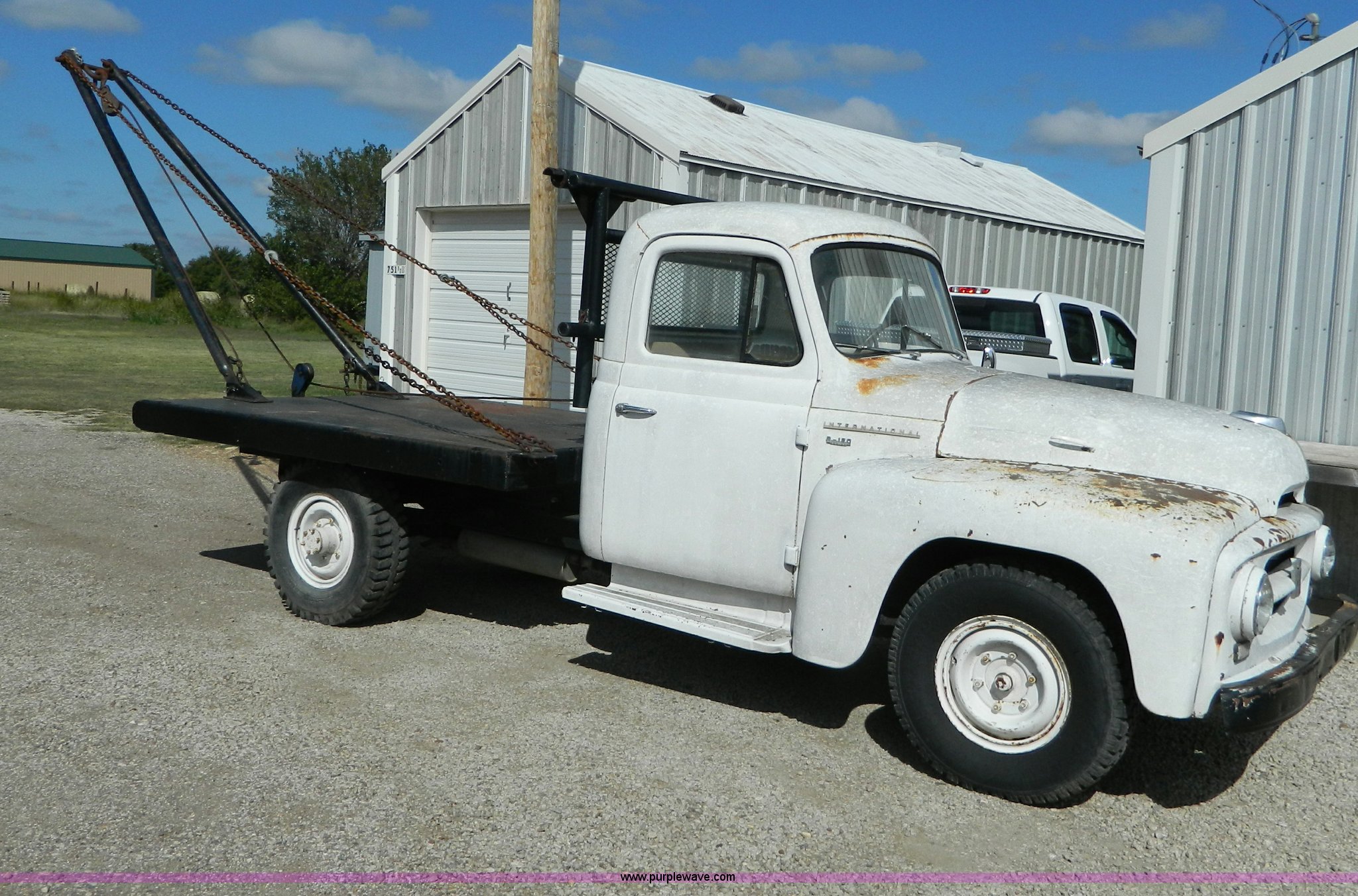 Purple Wave is selling a used Rollback or Tow Truck in Kansas. This item is a 1955 International Harvester R120 winch dump bed truck with the following: 79,140 miles on odometer, Six cylinder gas engine, Four speed manual transmission, 8' x 80" steel flatbed, Side bed boards, Spring suspension, 127" wheelbase, LT235/95R16 tires, GVWR 6,500 lbs