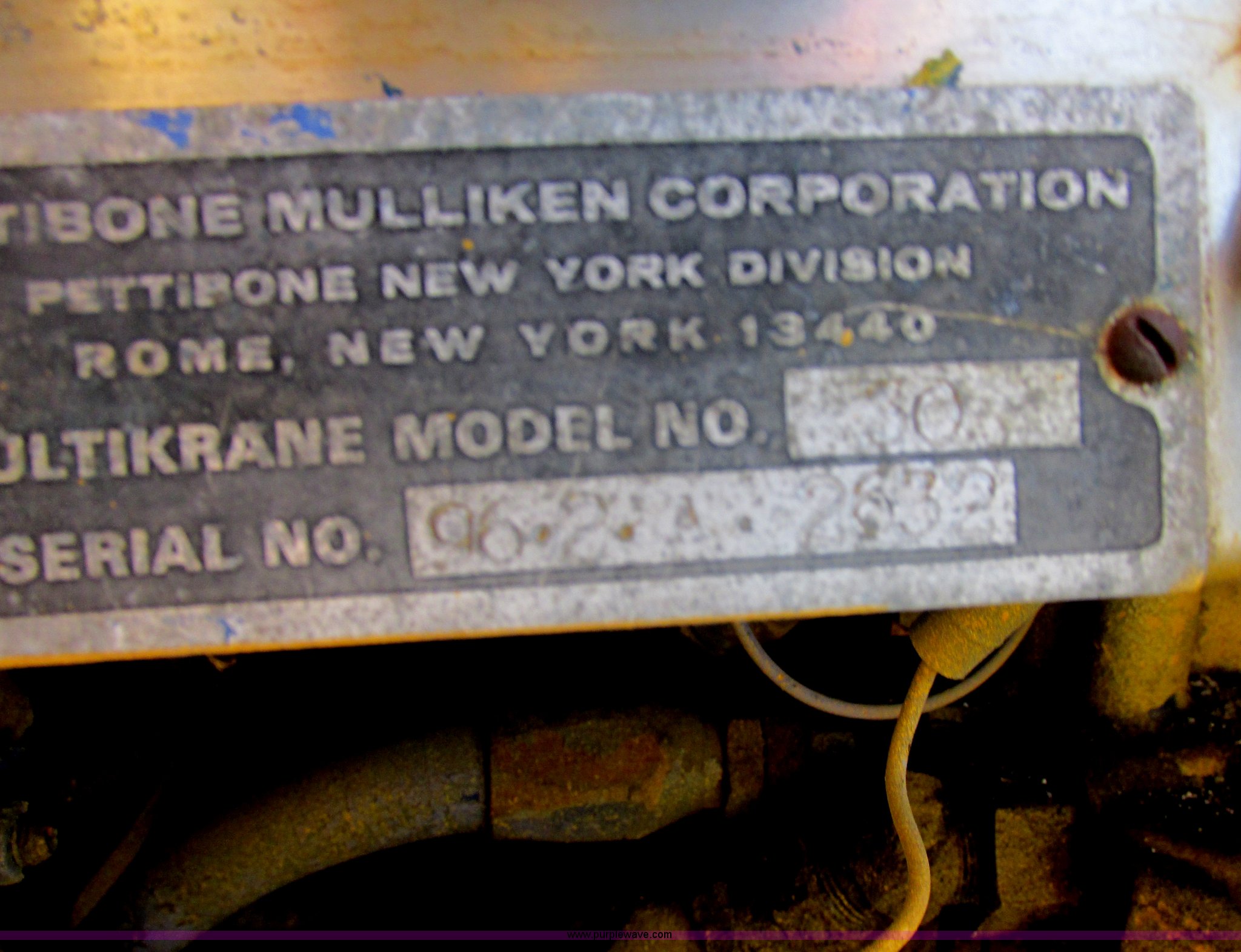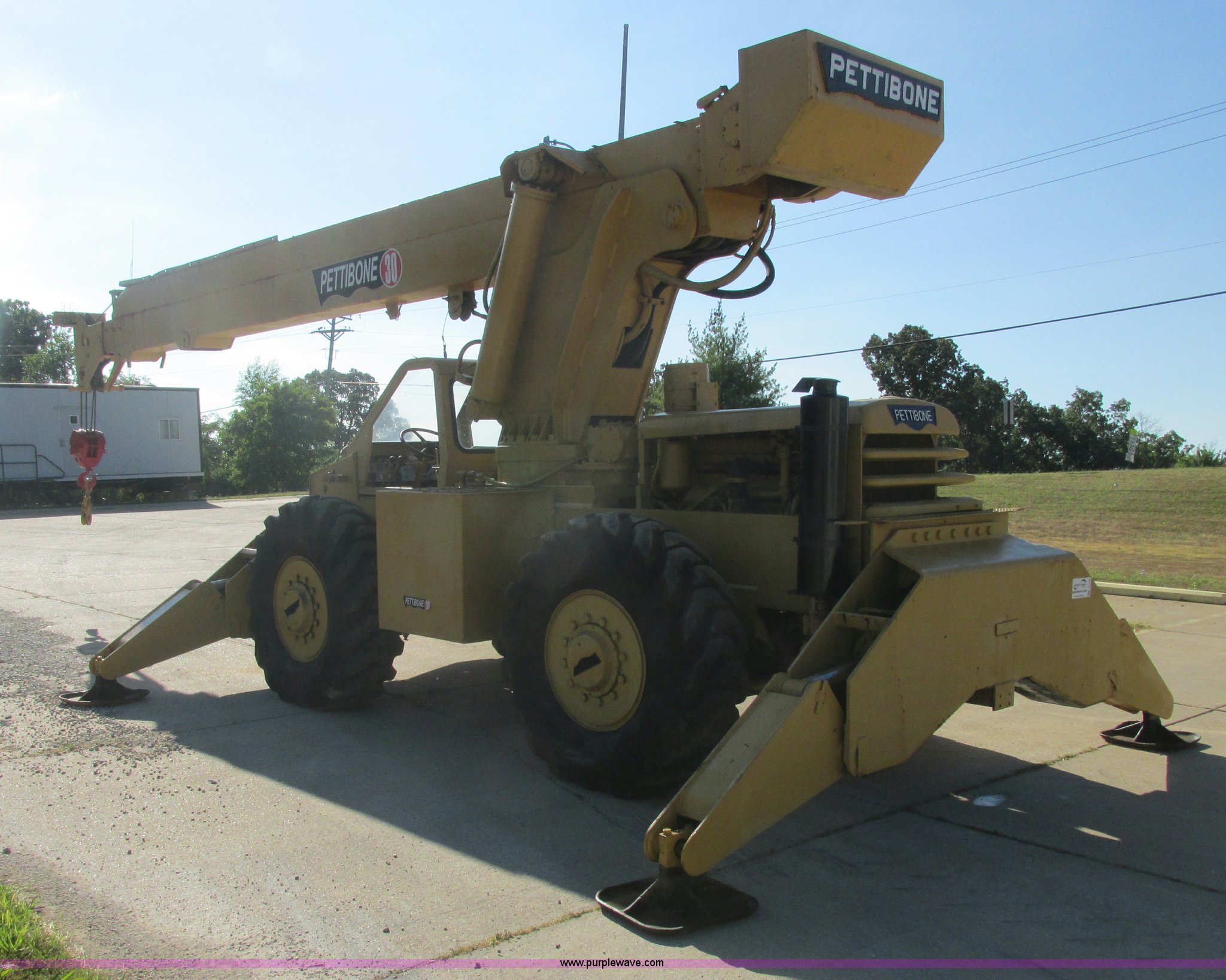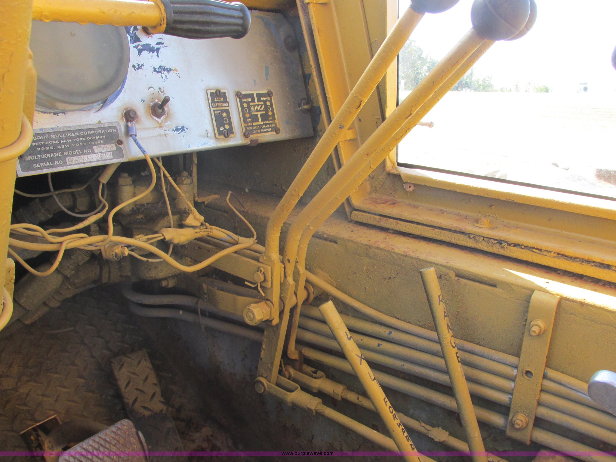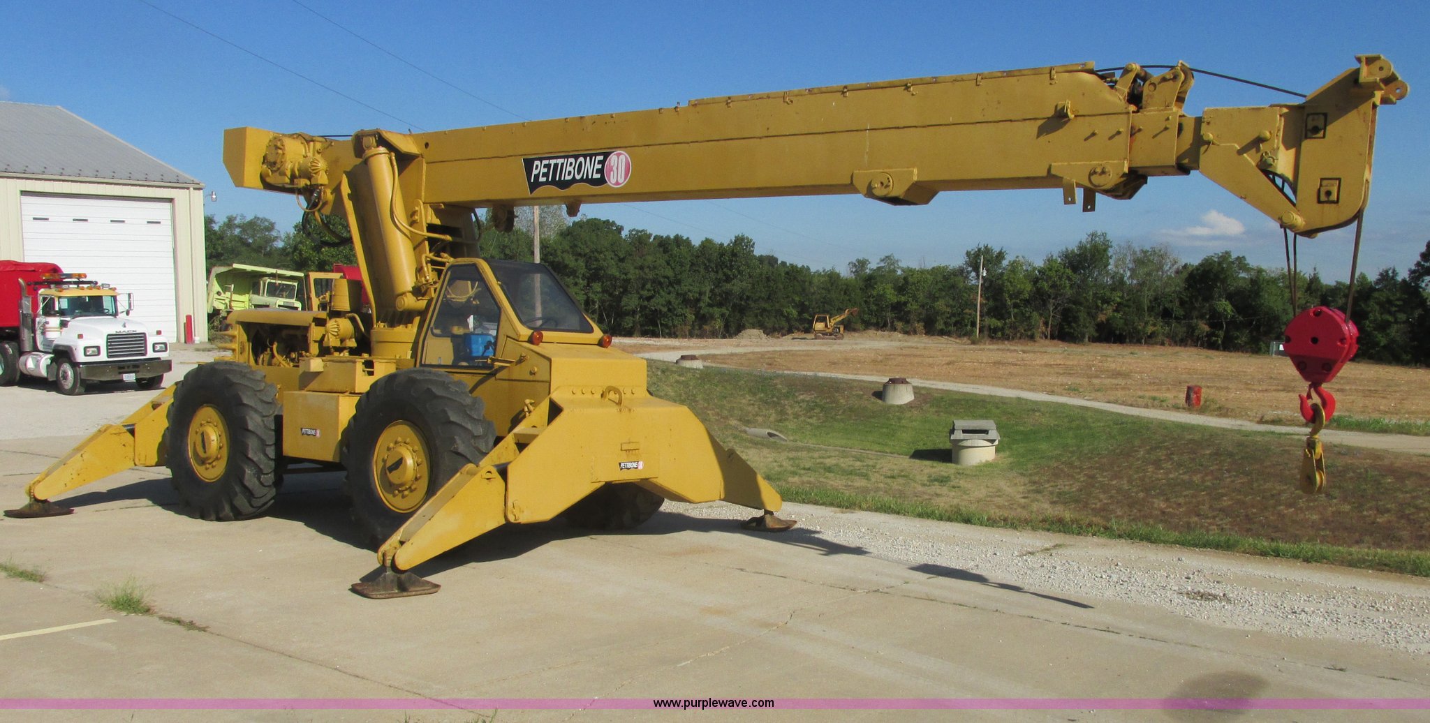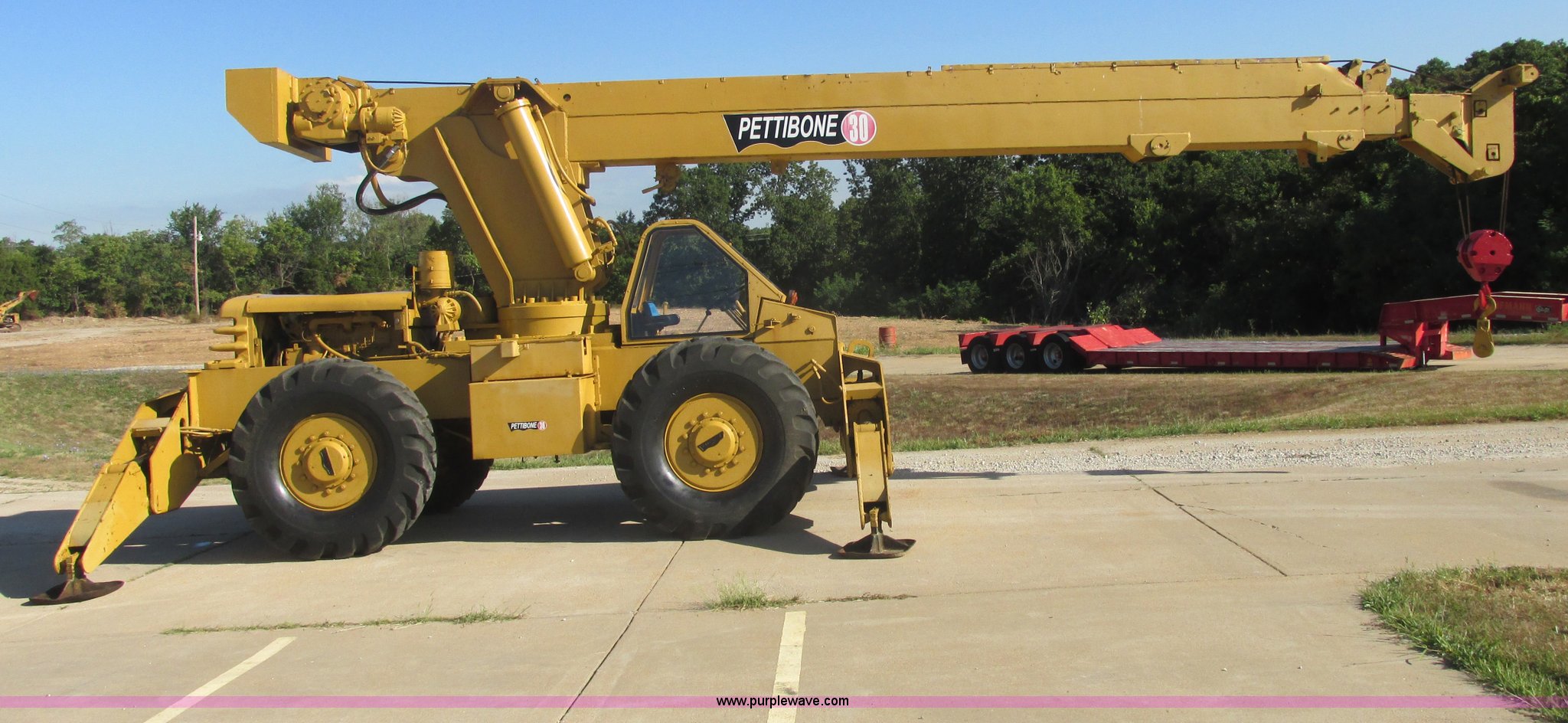 Purple Wave is selling a used Rough or All Terrain Crane in Missouri. This item is a 1969 Pettibone 30 all terrain 15 ton crane with the following: 312 hours on meter, Cummins six cylinder diesel engine, Serial 72368, Dual range three speed transmission, 6F-6R gears, Four wheel drive, Four wheel steer, Crab steer, Conventional steering, Enclosed cab, 60' reach, Jib mounts, Hand operated jib winch, No jib included, Three stage boom, 360 degree rotation, Double sheave block and hook, Greasable single line block, Dual line cable, Hydraulic brakes, Front flashers, Parking brakes, 16.00-24 tires, 38,400 lbs. base operating weight, Recently replaced battery, Serial 962A2632