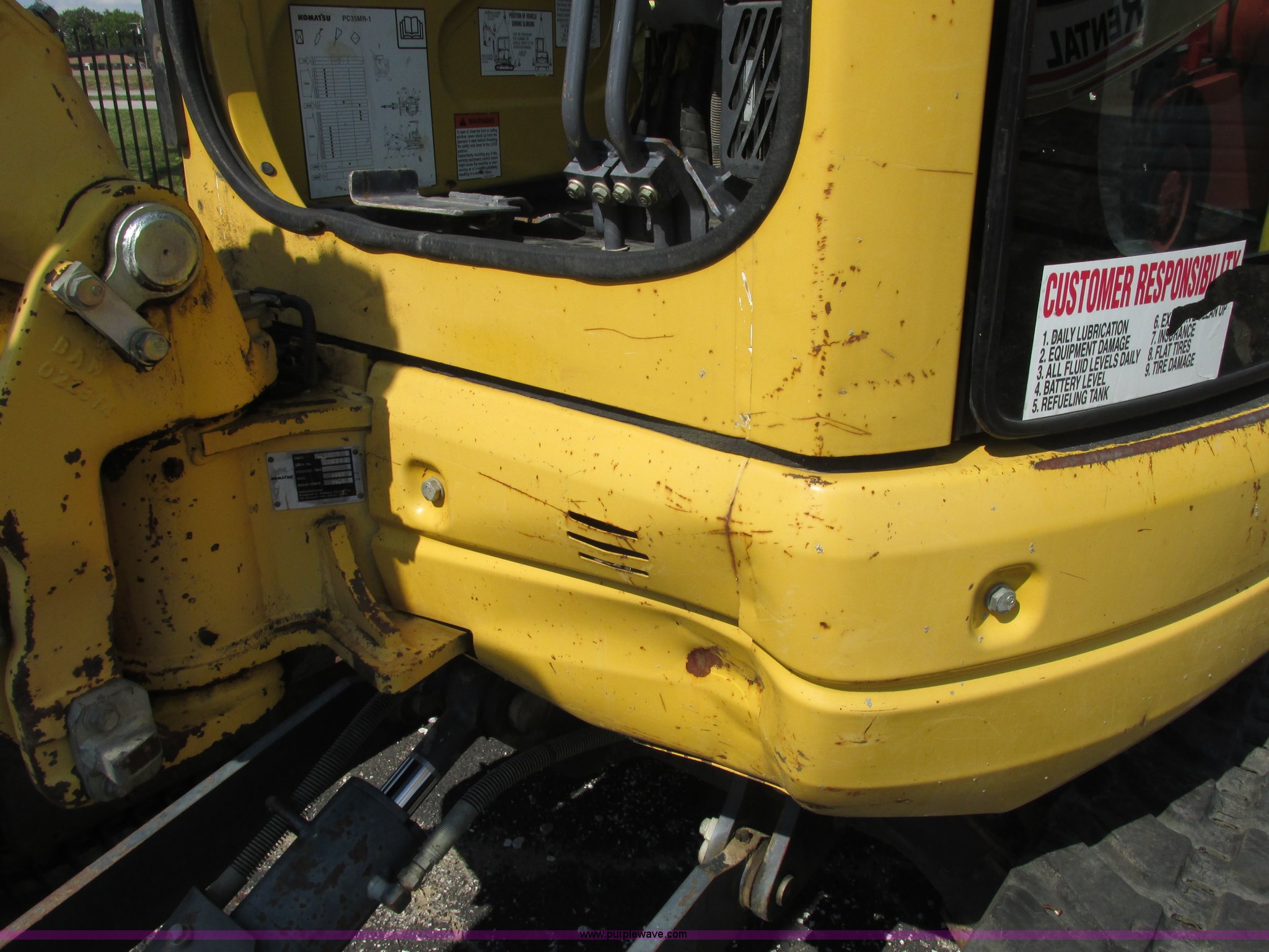 Purple Wave is selling a used Mini Excavator in Missouri. This item is a 2006 Komatsu PC35MR-1 mini excavator with the following: 2,084 hours on meter, Komatsu three cylinder diesel engine, Hydrostatic transmission, Enclosed cab, Heat, Reversible controls, Komatsu or John Deere style, 24"W toothed bucket, 59"W blade, Plumbed for breaker, Work lights, 8,300 lbs. base operating weight, Bottom cab glass has been removed, One track torn, Front damaged, Serial 4352