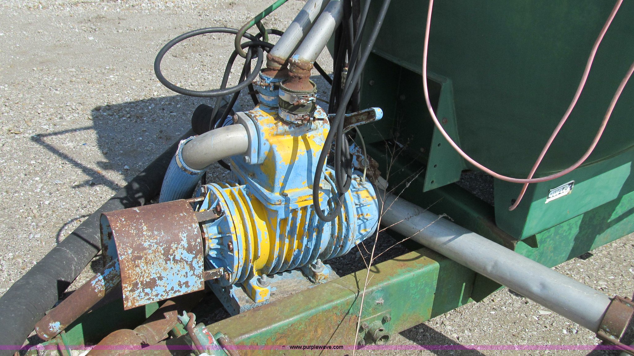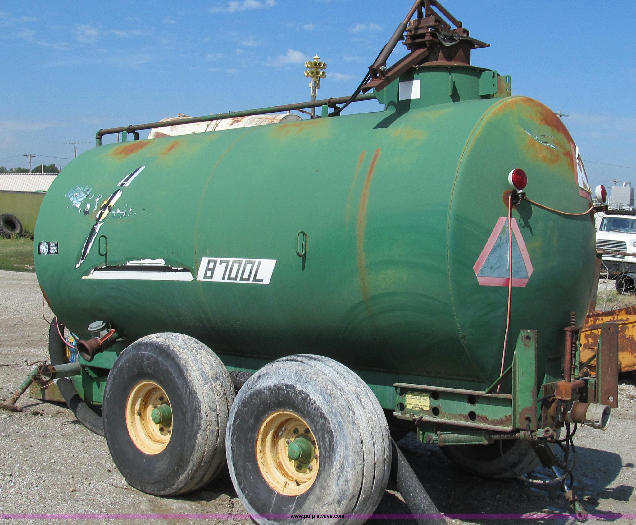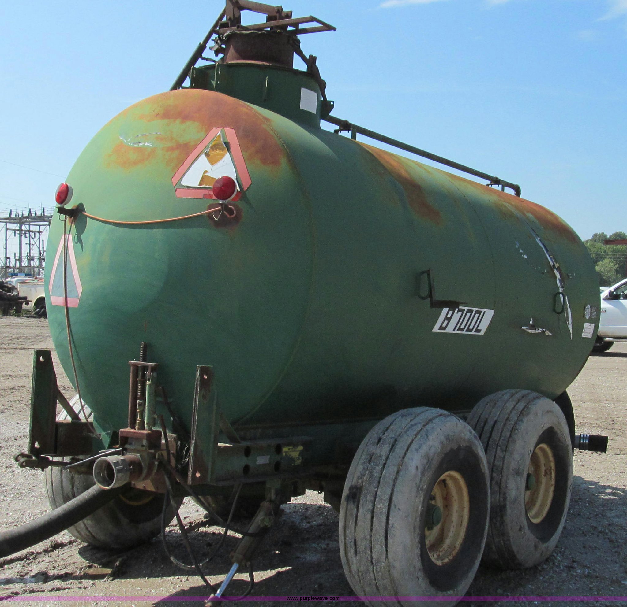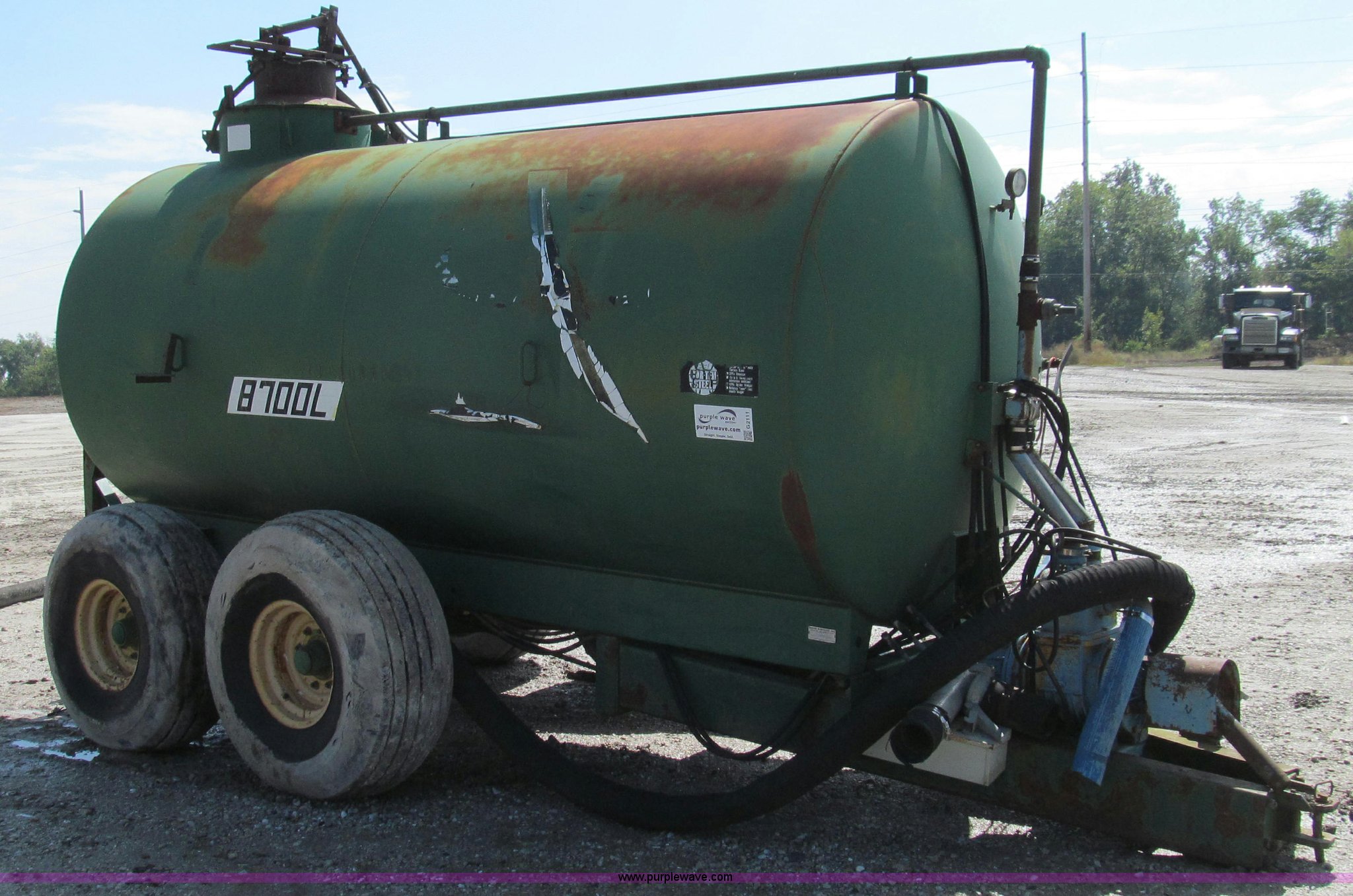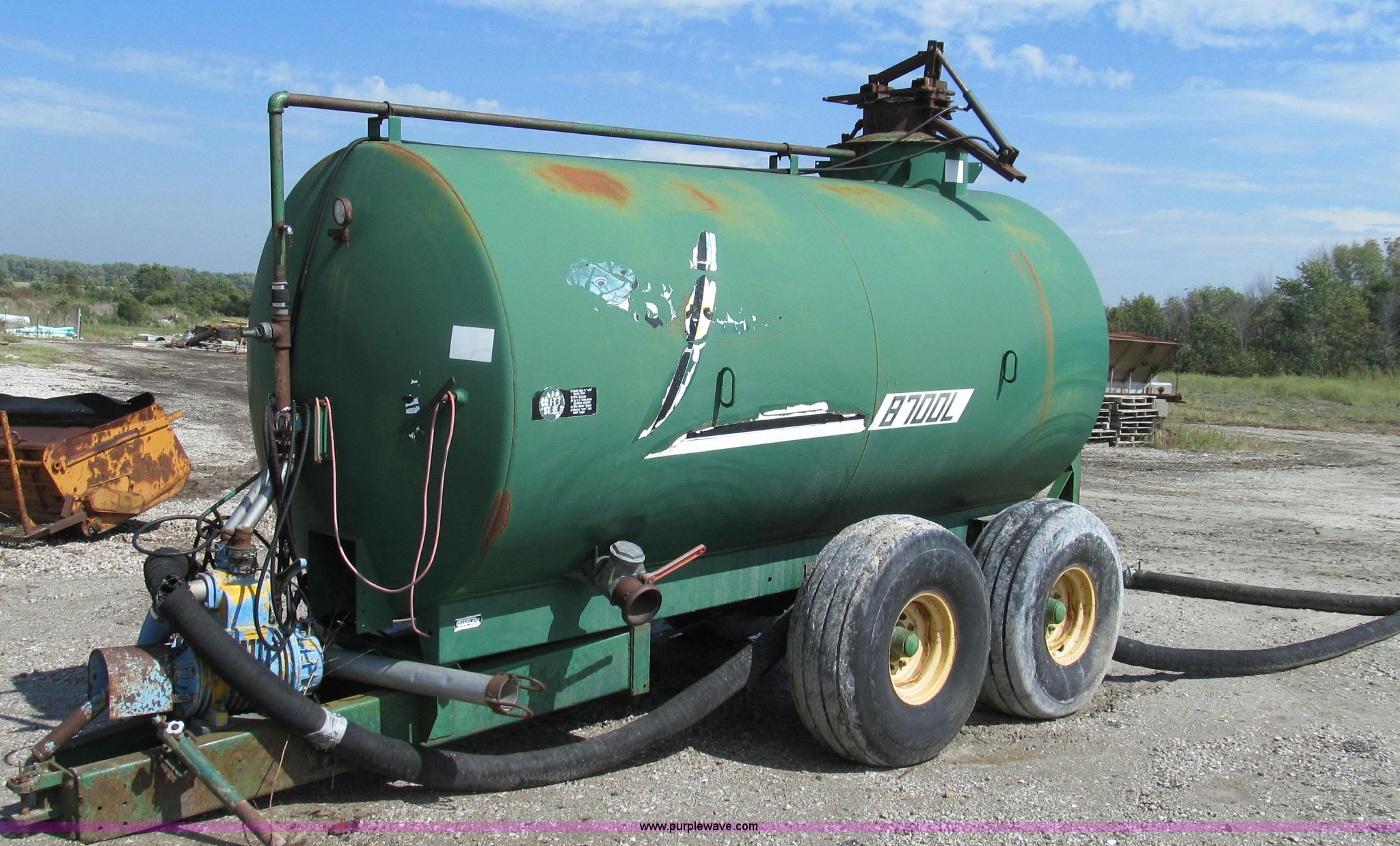 Purple Wave is selling a used Manure Spreader in Missouri. This item is a Badger 8700L BN326 honey wagon with the following: 2,000 gallon capacity, 1,000 PTO, Pearson Bros. PB-10 pump, 4" inside diameter inlet and discharge hose, 12" BN2200 rear mounted applicator, Injection unit, Four shank, Spring cushioned and coil, Bolt-on knives, Hydraulic raise and lower, Serial 287, Pin hitch, Tandem axle, 16.5L-16.1 tires, Serial 4272B23-20574