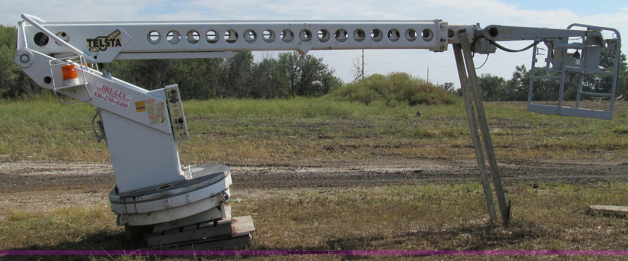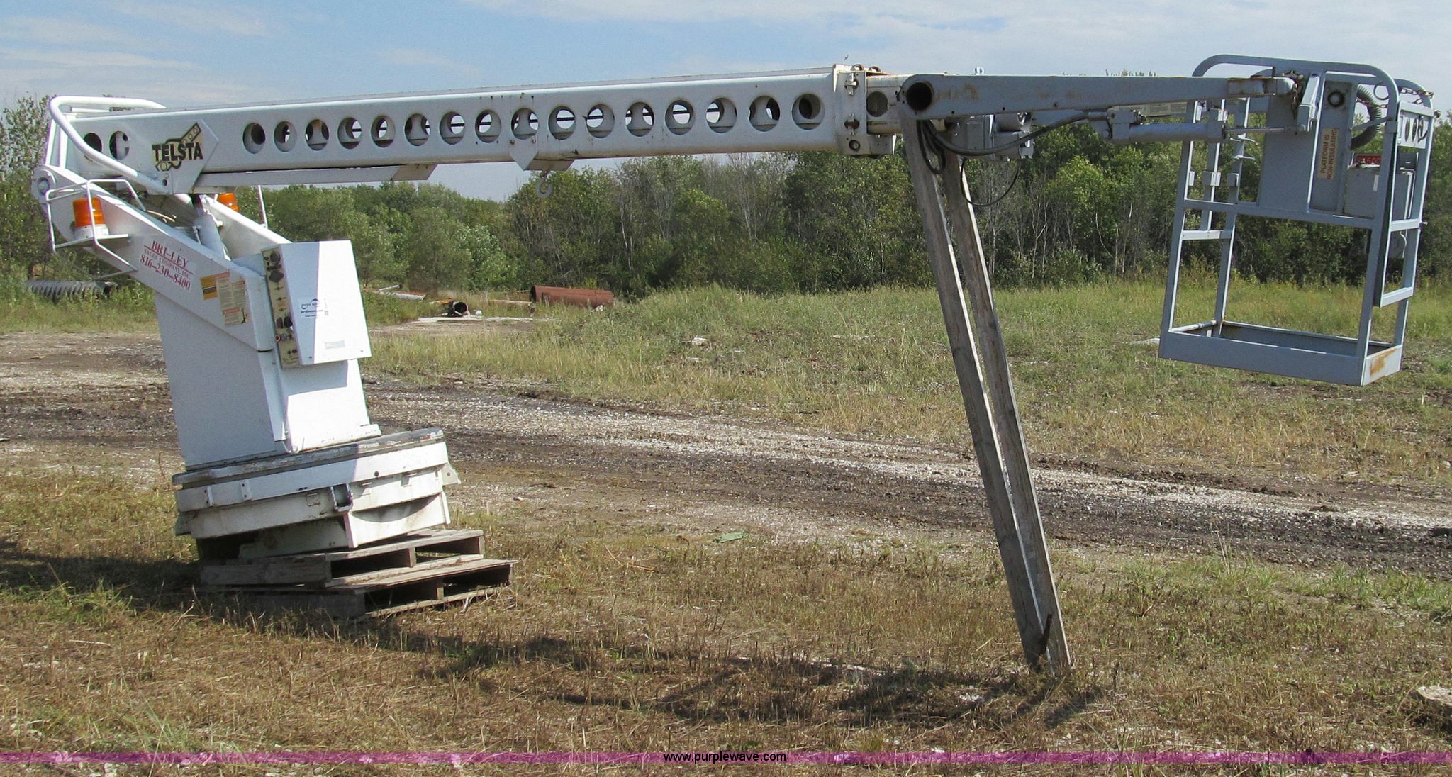 1992 Telsta T-400 single platform man lift. 6,924 hours on meter, Reel cable attachment, Electric over hydraulic controls, 29" x 29" platform, 500 lbs maximum platform capacity, 35' maximum reach, Ground and platform controls, Two stage boom, 54" diameter base, 2,000 lbs maximum hydraulic pressure, 6,000 lbs maximum reel arm load capacity, 20,000 lbs maximum pull load, Serial 92400018. City of Brookfield. 206 N Brunswick. Brookfield, MO 64628