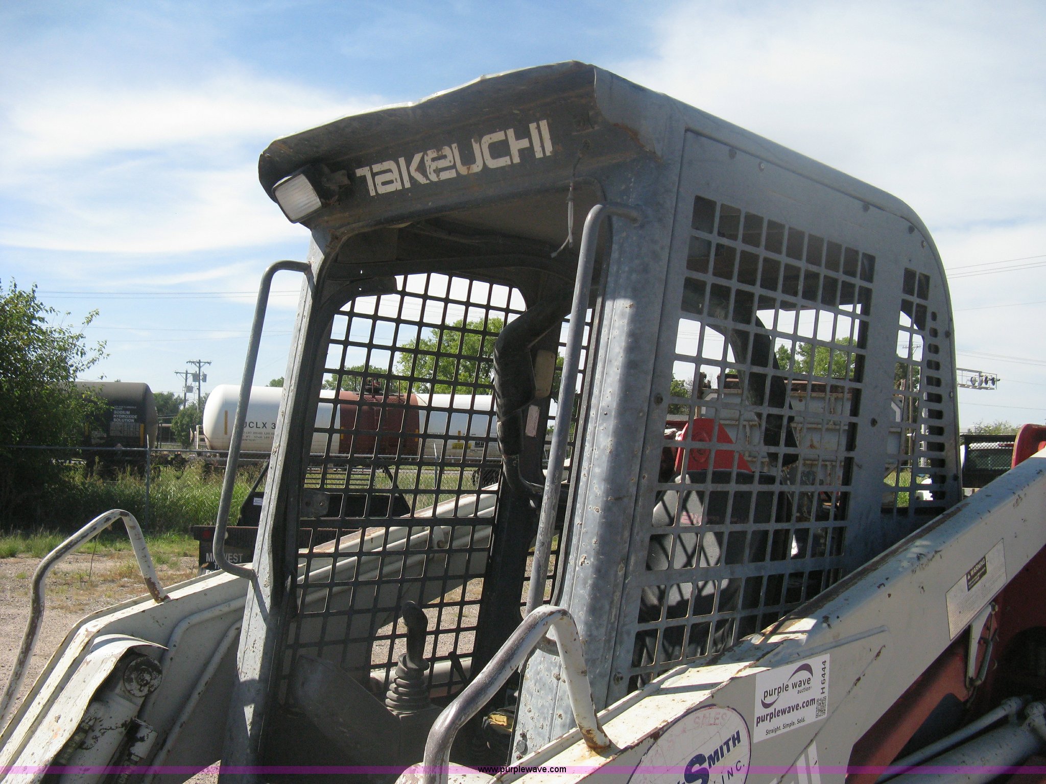 Purple Wave is selling a used Tracked Skid Steer Loader in Kansas. This item is a 2004 Takeuchi TL140 track skid steer with the following: 4,835 hours on meter, Three cylinder diesel engine, EROPS, No side/rear glass, No entry door, Hand loader control, Work lights, One headlight missing, Auxiliary hydraulics, 68"W bucket, Bolt-on cutting edge, 18" rubber tracks, Rubber worn/damaged, Serial 21400164, Unit# 53.109L