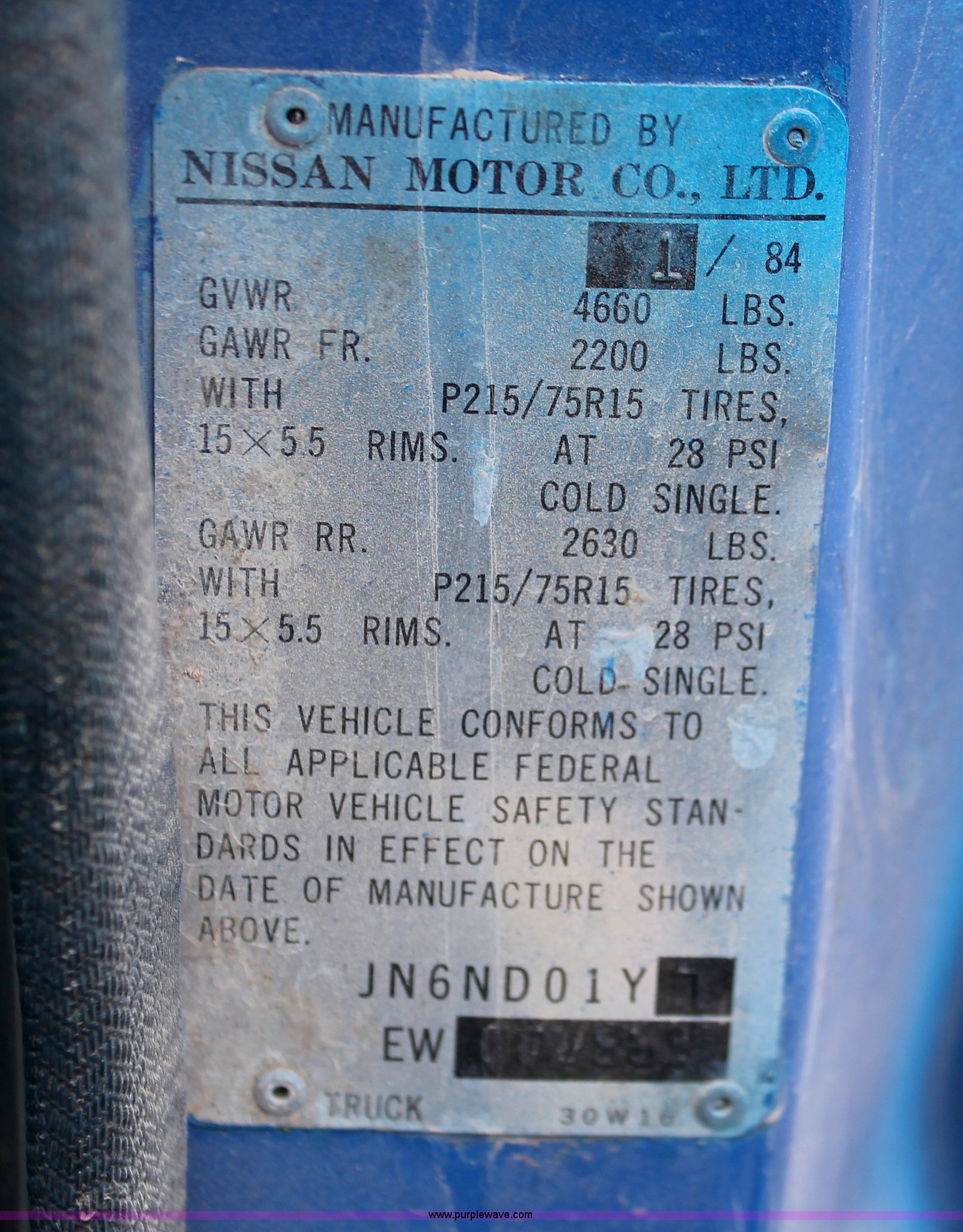 1984 Nissan Datsun pickup truck. 186,660 miles on odometer, 2.4L L4 gas engine, Five speed manual transmission, Four wheel drive, AM/FM/CD, Grill guard, 6' flatbed 4"H stake rails, Sliding rear window, Receiver hitch, Trailer wiring, Goodyear Wrangler 31x10.50R15LT tires Recently replaced, Case# 13C46951. Vehicle is abandoned. No additional information is available. Vehicle does not have keys unless notated otherwise in the item listing.. View City Of Wichita Terms for title acquisition and item removal requirements.. JN6ND01Y7EW004868. Interstate Wrecker Service. 1028 N Mosier. Wichita, KS 67214