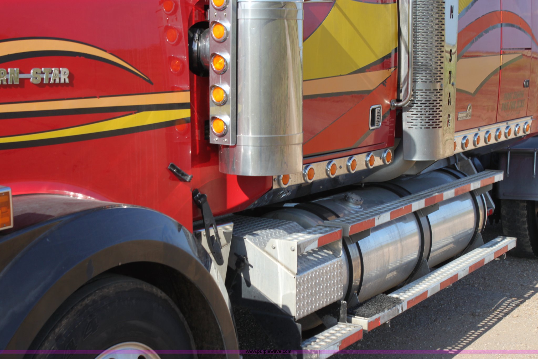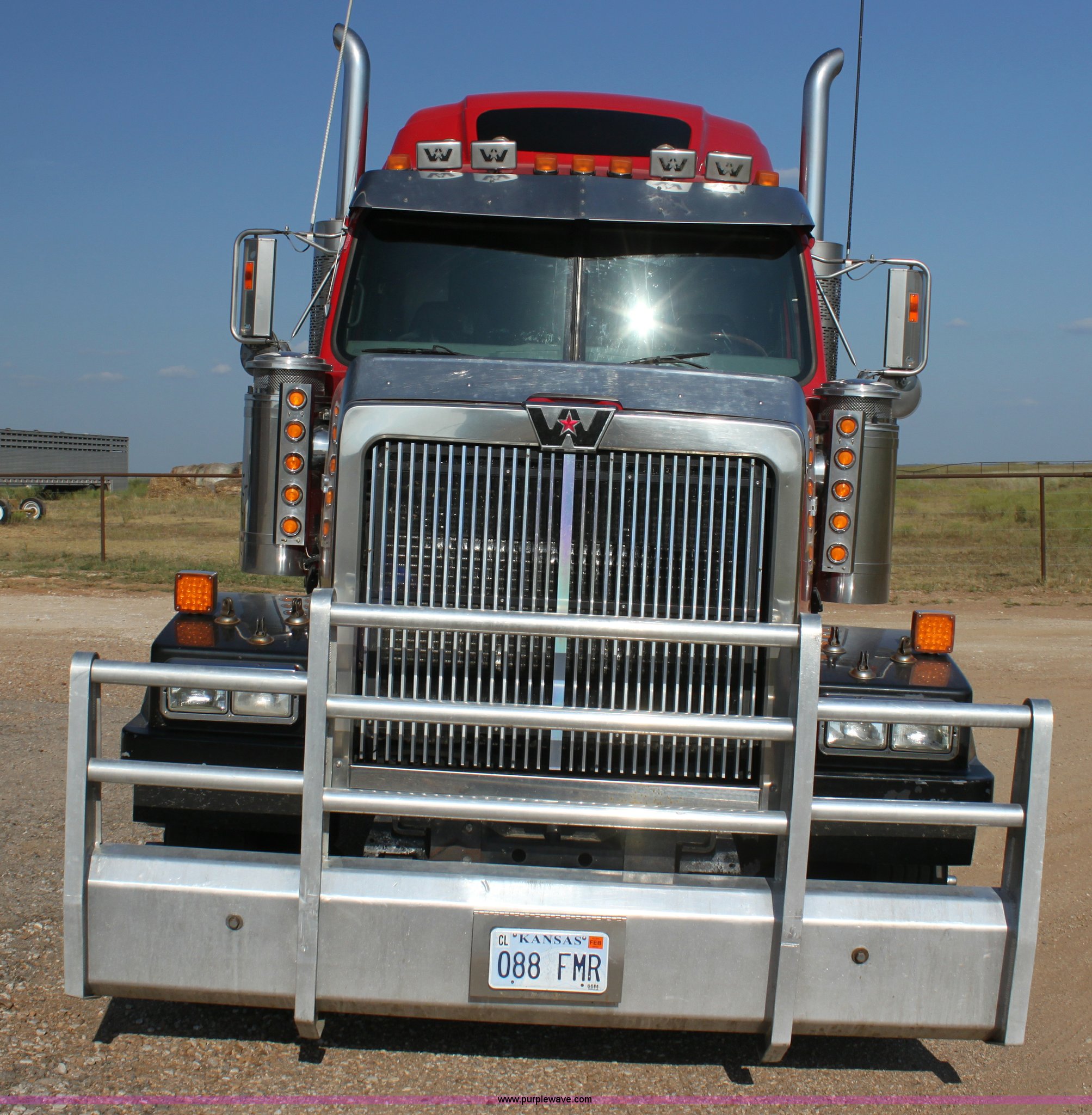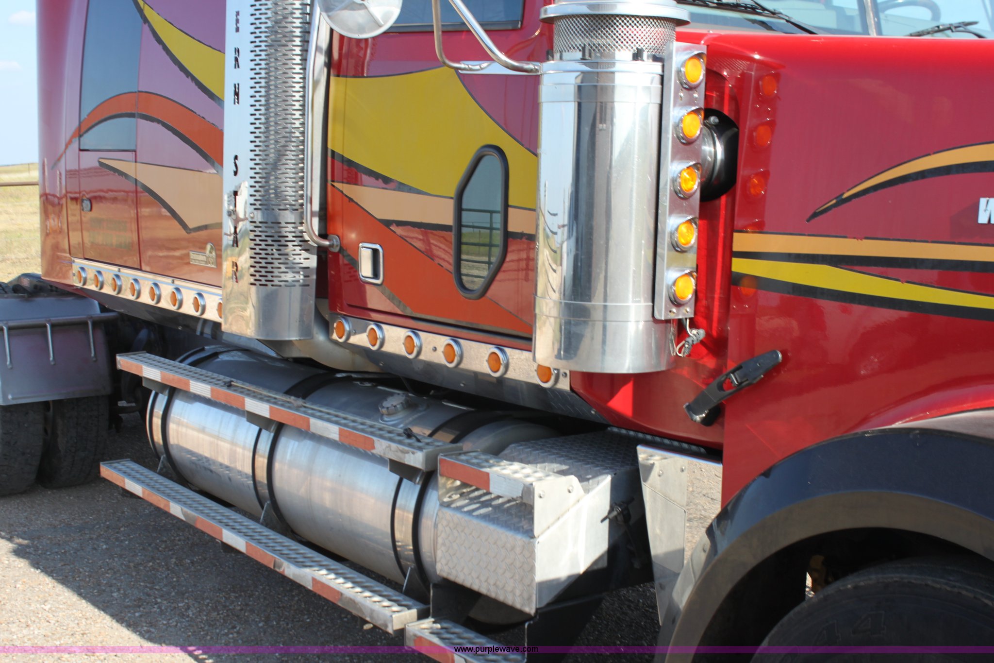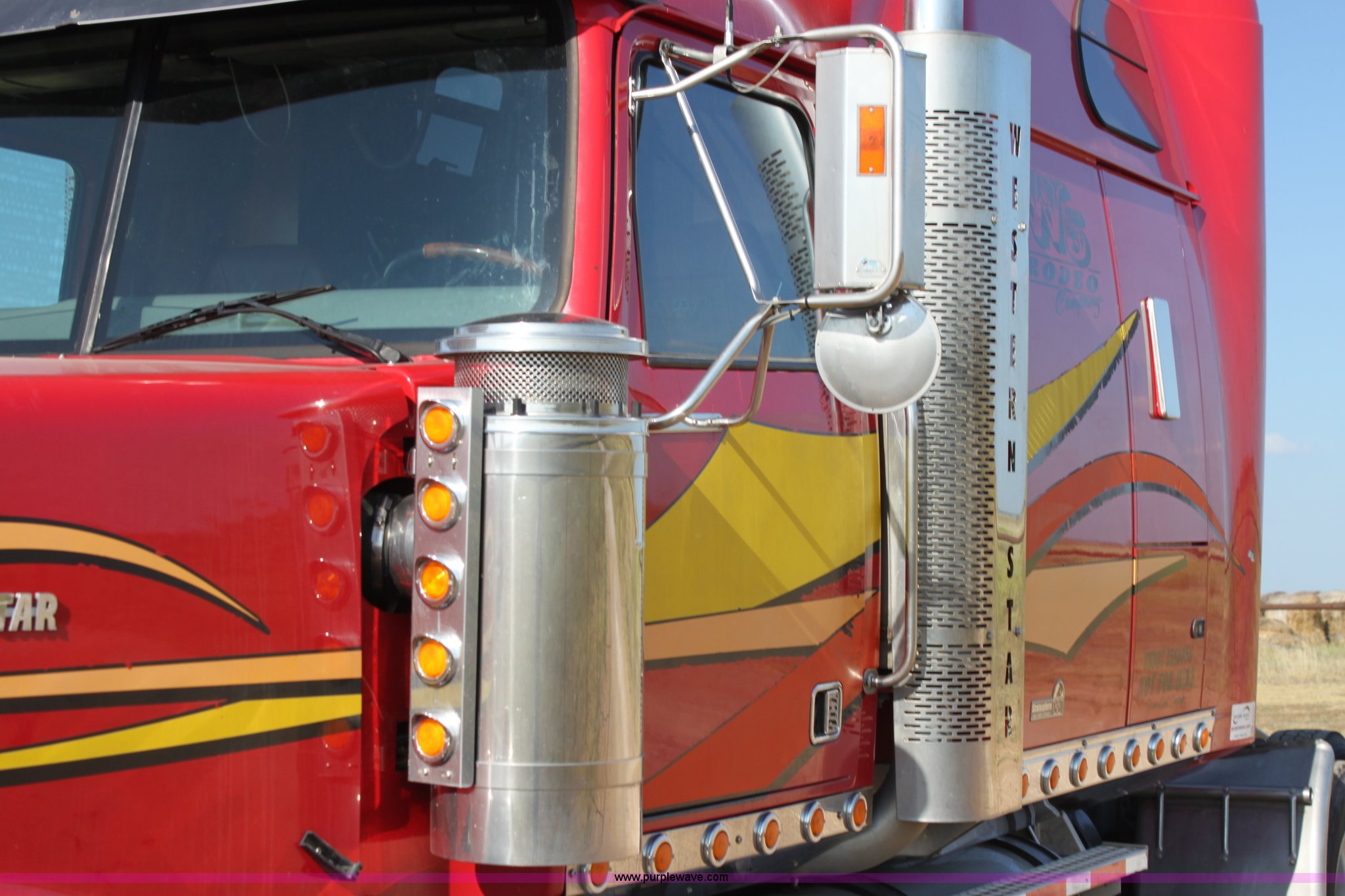 Purple Wave is selling a used Truck Tractor in Kansas. This item is a 2006 Western Star 4900EX semi truck with the following: 878,429 miles on odometer, 22,177 hours on meter, Caterpillar C15 Acert 14.6L L6 diesel engine, 13 speed manual transmission, AC and heat, Tilt, Cruise, AM/FM/CD, Power windows and mirrors, Heated mirrors, Stratoshpere Starlight sleeper, Visor, Chrome bumper, Block heater, Air slide fifth wheel, Dual fuel tanks, Dual front exhaust stacks, Aluminum quarter fenders, Dump valves, Air suspension, Air brakes, Jake brake, 295/80R24.5 tires, ABS light on