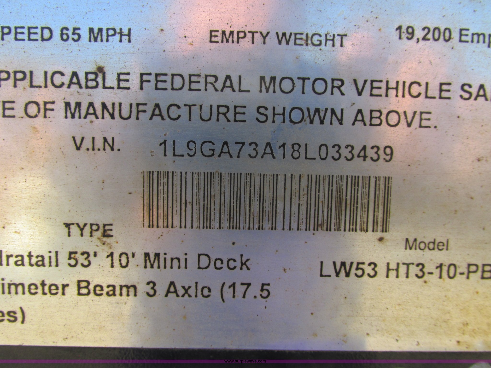 Purple Wave is selling a used Equip. Trailer in Minnesota. This item is a 2008 Ledwell LW53HT3-10-PB Hydratail triple axle trailer with the following: 10' upper deck, 41'9" lower deck, 8.5'W, Braden hydraulic winch, Winch does not spool out easily, Perimeter beam 3 axle, 215/75R17.5 tires, Load Range H, Air suspension, DOT inspection completed in August 2013, Lift cylinder for ramp for top deck leaks, GVWR 80,000 lbs, Chains and binders not included, EIN 717472RA