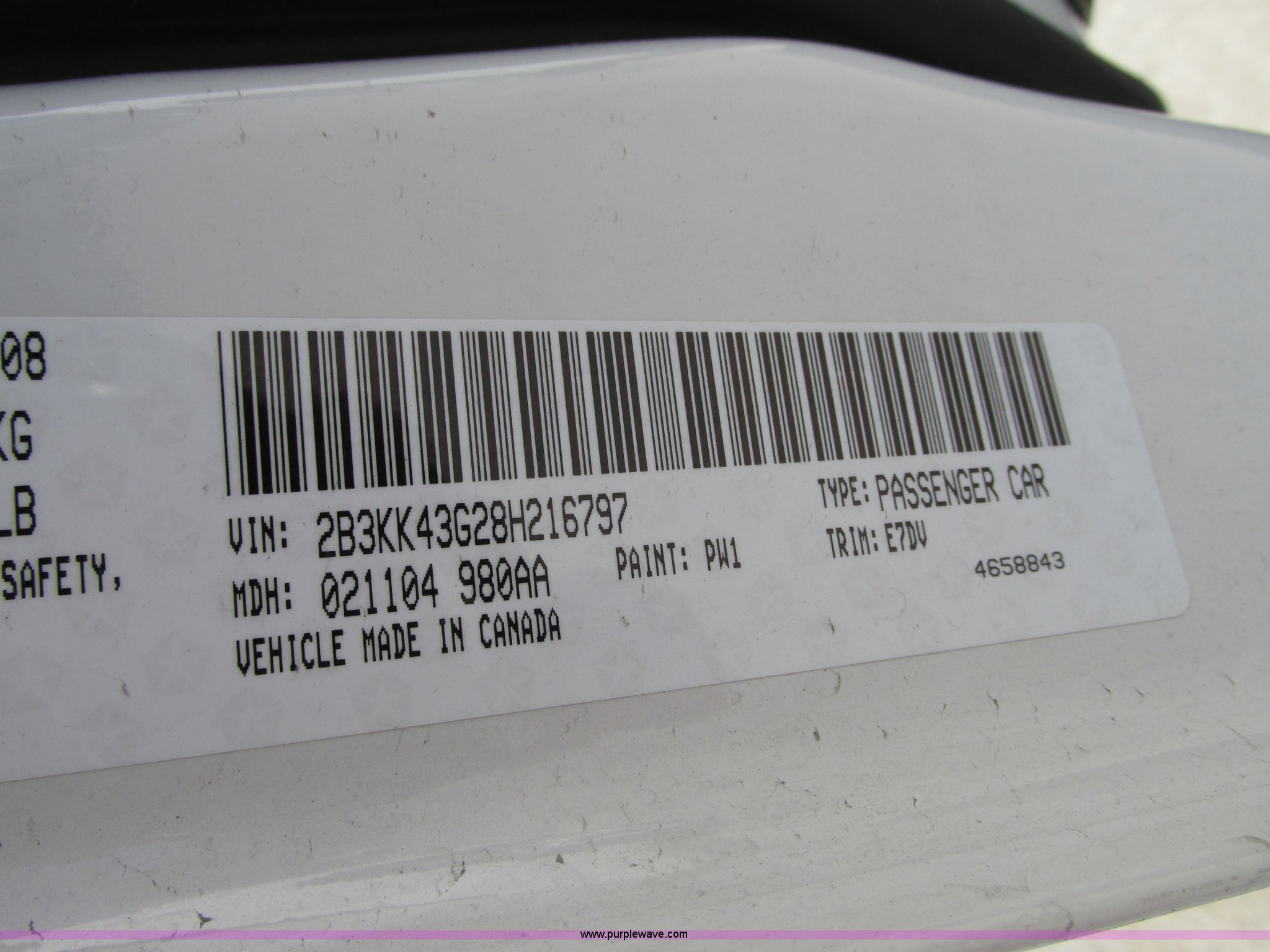 Purple Wave is selling a used Passenger Vehicle in Illinois. This item is a 2008 Dodge Charger SXT with the following: 140,136 miles on odometer, 3.5L V6 SOHC 24V gas engine, Automatic transmission, All wheel drive, AC and heat, Tilt, Cruise, AM/FM/CD, Auxiliary input, Power windows, locks, mirrors, and seats, Cloth interior, Keyless entry, Remote start, 18" alloy wheels, P225/60R18 tires, Paint blemishes, EIN 1044073