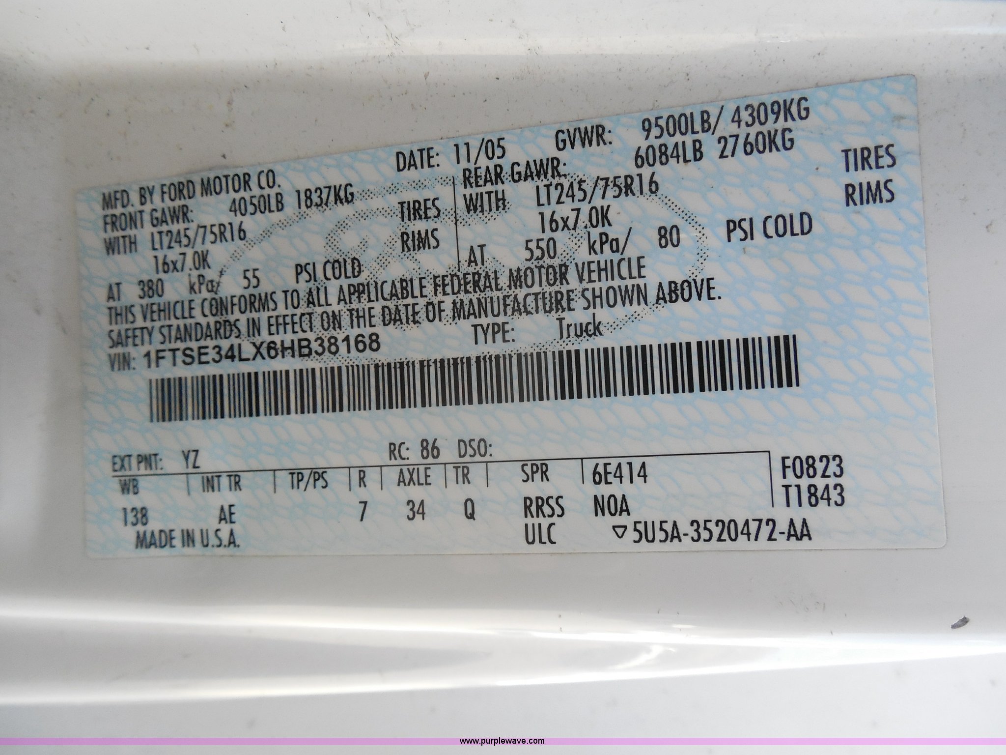 2006 Ford E350 Super Duty van. 165,913 actual miles, 5.4L V8 SOHC 16V gas engine, Automatic transmission, AC and heat, Tilt, AM/FM, Manual windows and locks, Vinyl interior, Receiver hitch, Trailer wiring, 138" wheelbase, LT245/75R16 tires, GVWR 9,500 lbs, EIN 903044. 1FTSE34LX6HB38168. United Rentals - Shrewsbury. 169 Memorial Drive. Shrewsbury, MA 01545