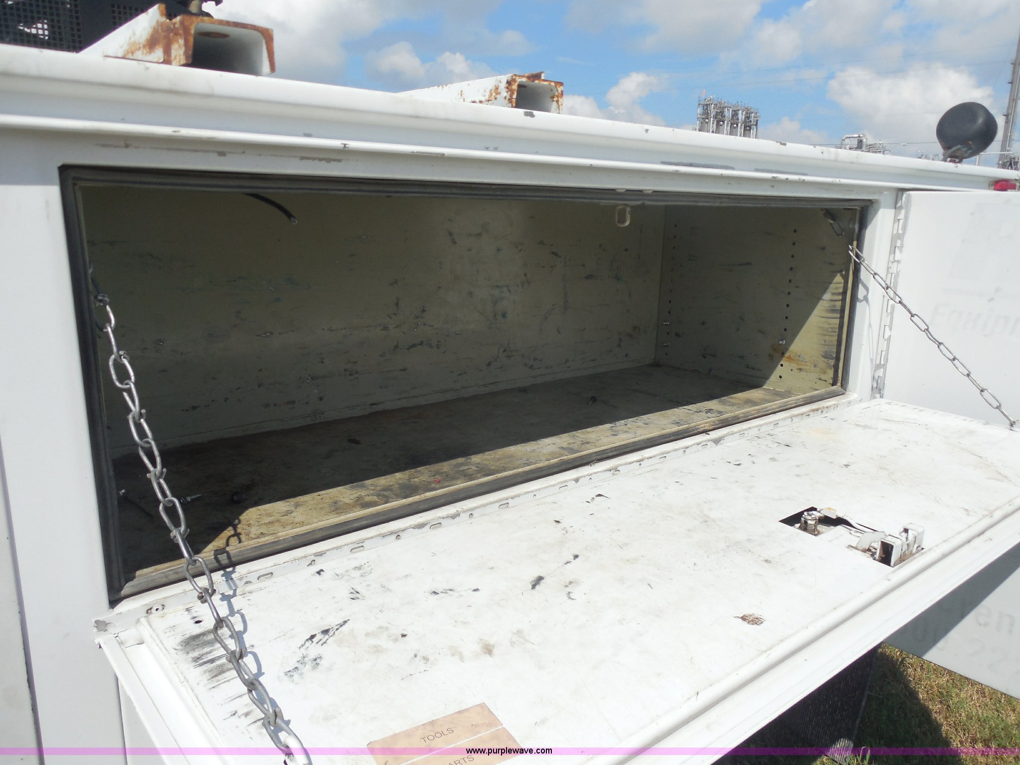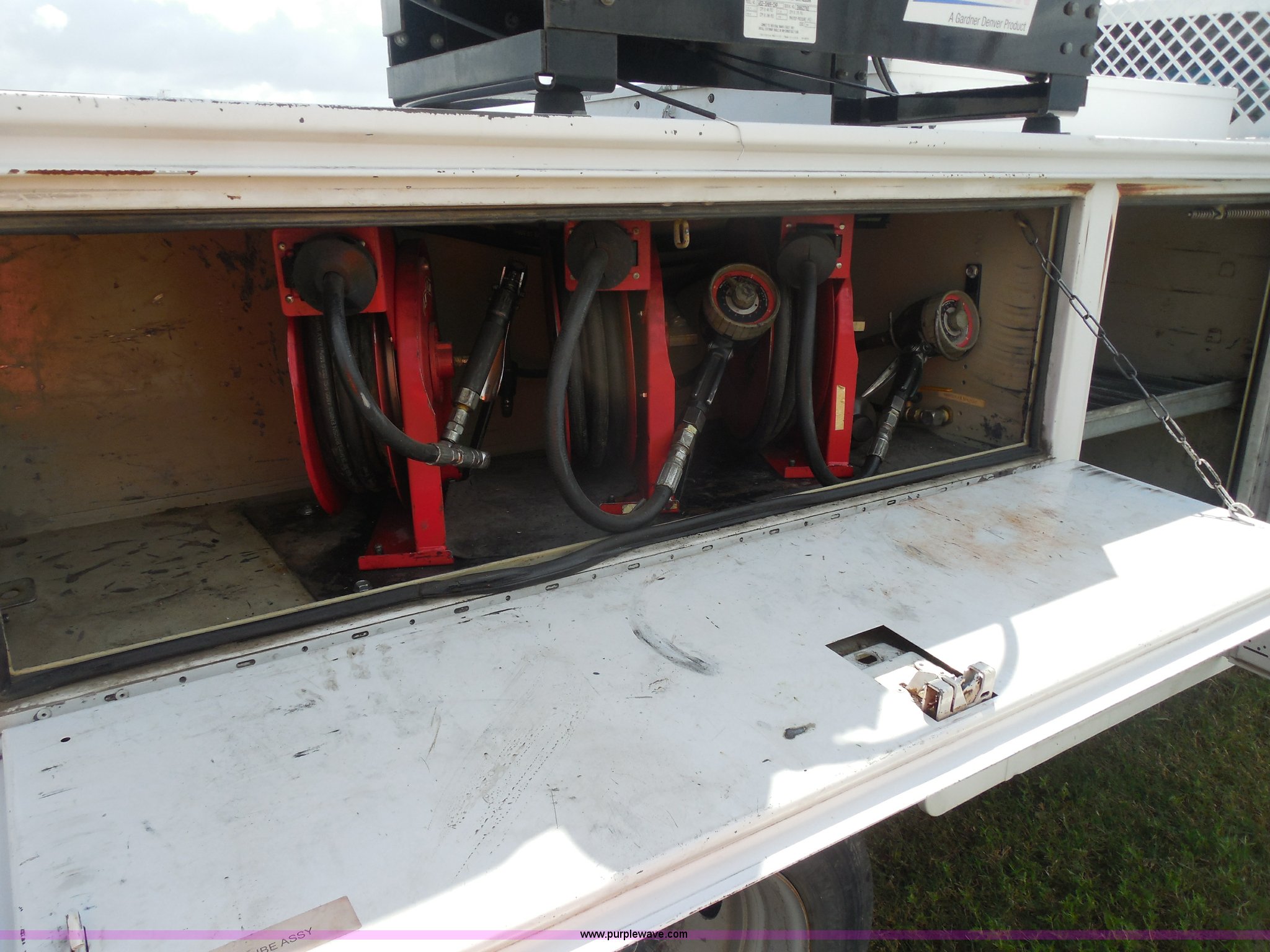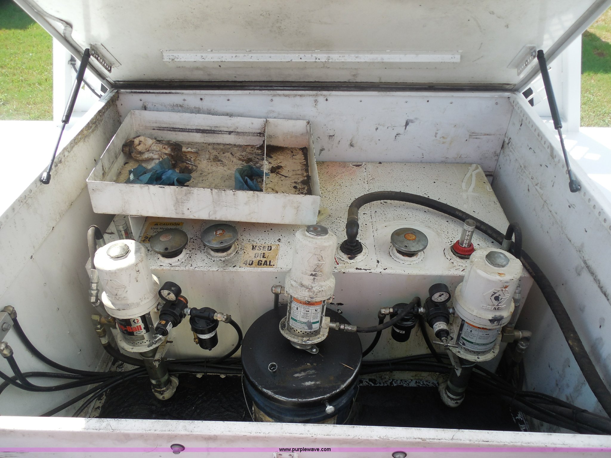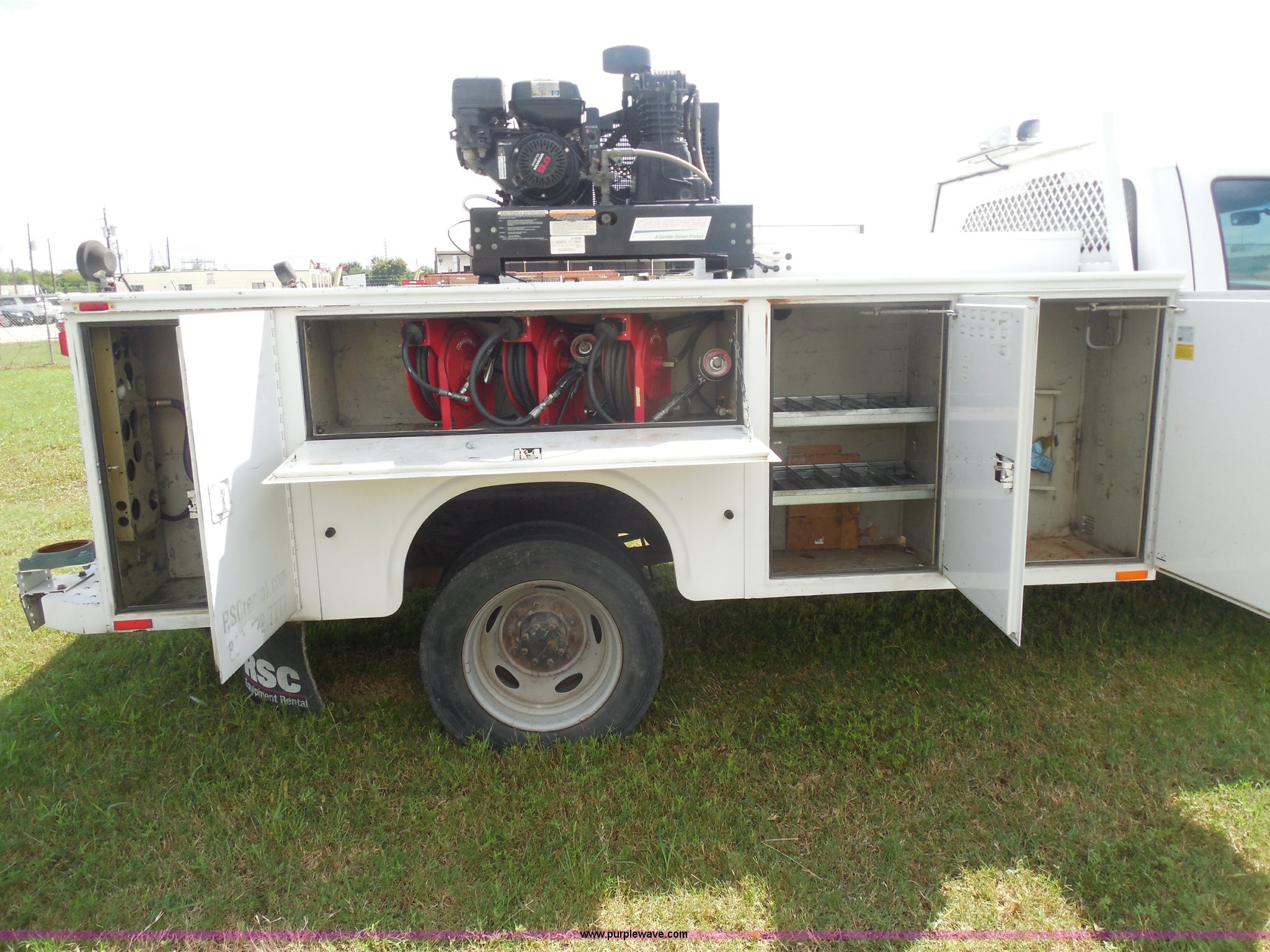 Purple Wave is selling a used Service Truck in Texas. This item is a 2007 Ford F550 service truck with the following: 140,022 actual miles, 6.0L V8 OHV 32V turbo diesel engine, Automatic transmission, AC and heat, Tilt, Cruise, AM/FM/CD, Manual windows and locks, Vinyl interior, Auxiliary control panel, Knapheide utility bed, Model 6132D54J, (3) oil/hydraulic tanks, Graco Fire-Ball air powered pumps, Diaphragm pump for waste oil, Champion air compressor, Model AS2-SH09-CHP, Honda 9 HP gas engine, Dead battery, (3) hose reels, Grease/hydraulic/oil,, Front tow hooks, 225/70R19.5 tires, EIN 671490RA