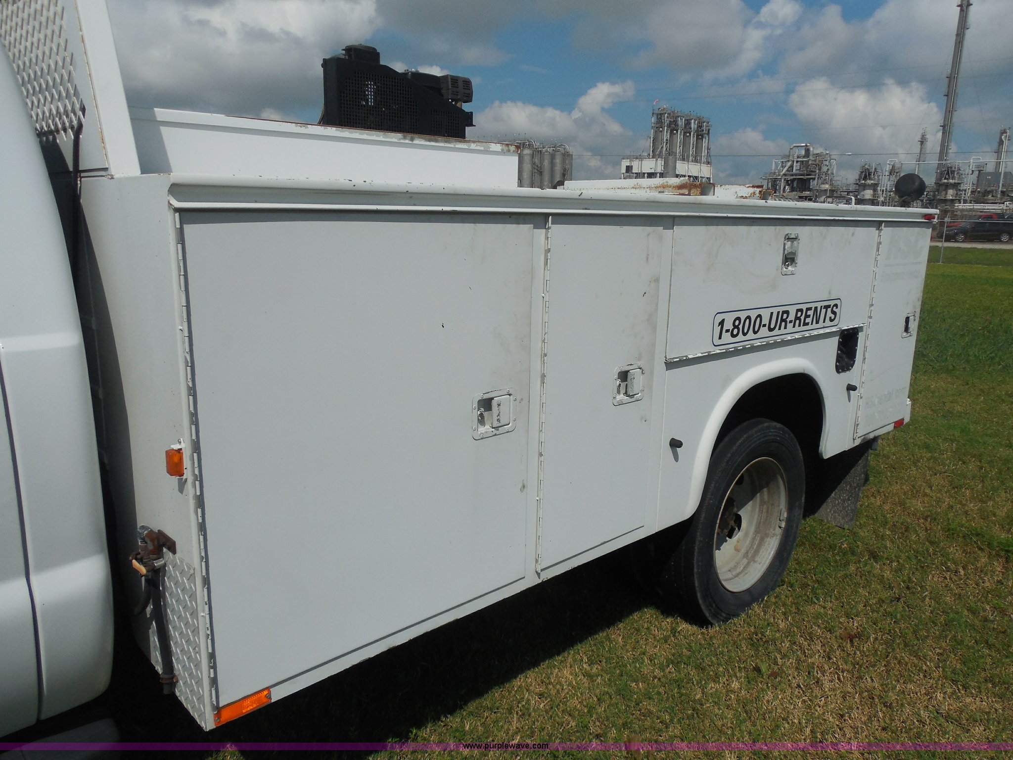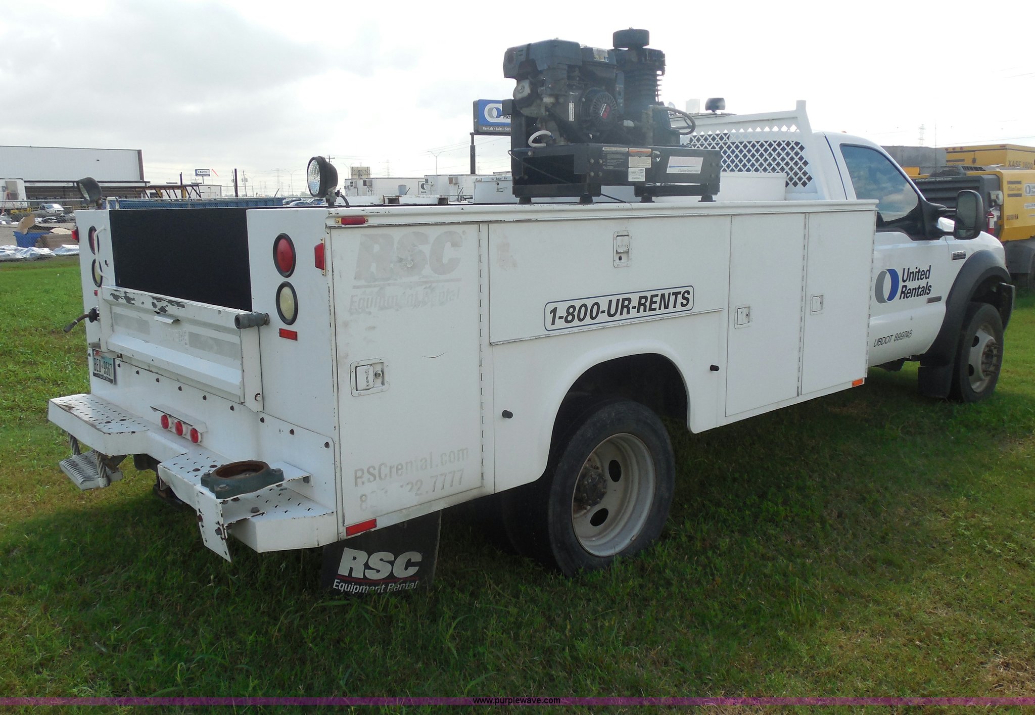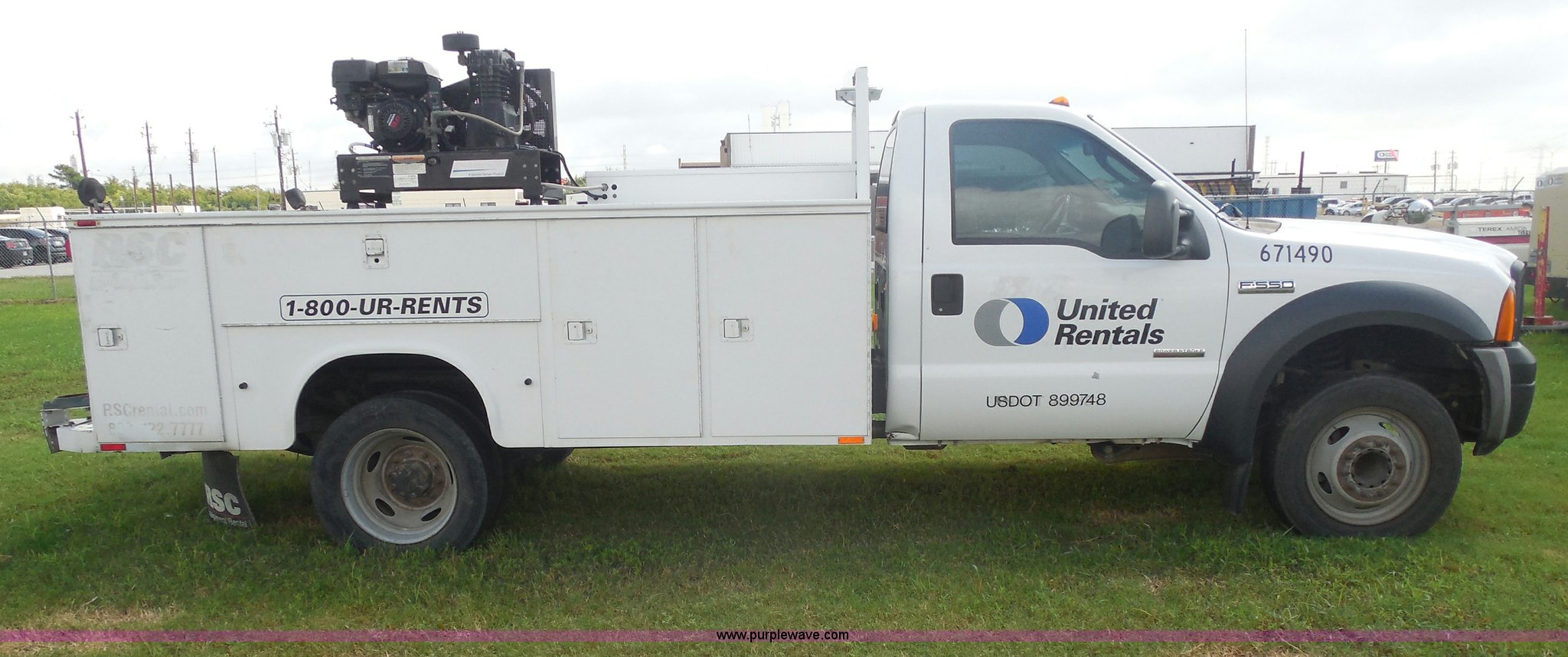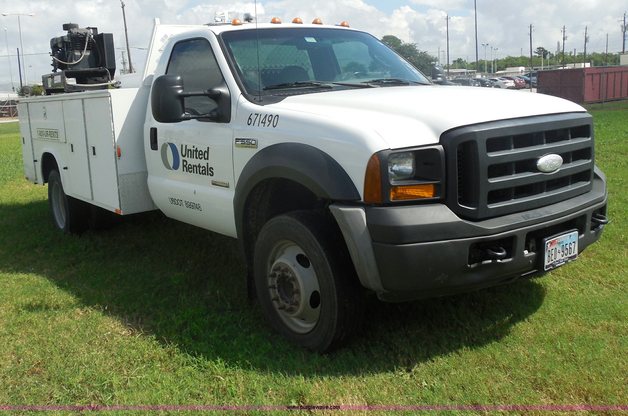 2007 Ford F550 service truck. 140,022 actual miles, 6.0L V8 OHV 32V turbo diesel engine, Automatic transmission, AC and heat, Tilt, Cruise, AM/FM/CD, Manual windows and locks, Vinyl interior, Auxiliary control panel, Knapheide utility bed Model 6132D54J, (3) oil/hydraulic tanks Graco Fire-Ball air powered pumps, Diaphragm pump for waste oil, Champion air compressor Model AS2-SH09-CHP, Honda 9 HP gas engine, Dead battery, (3) hose reels Grease/hydraulic/oil, Front tow hooks, 225/70R19.5 tires, EIN 671490RA. Title distribution may be delayed up to 30 days from verification of funds. 1FDAF56P37EB22512. United Rentals - Laporte. 4807 Hwy 225. Laporte, TX 77571