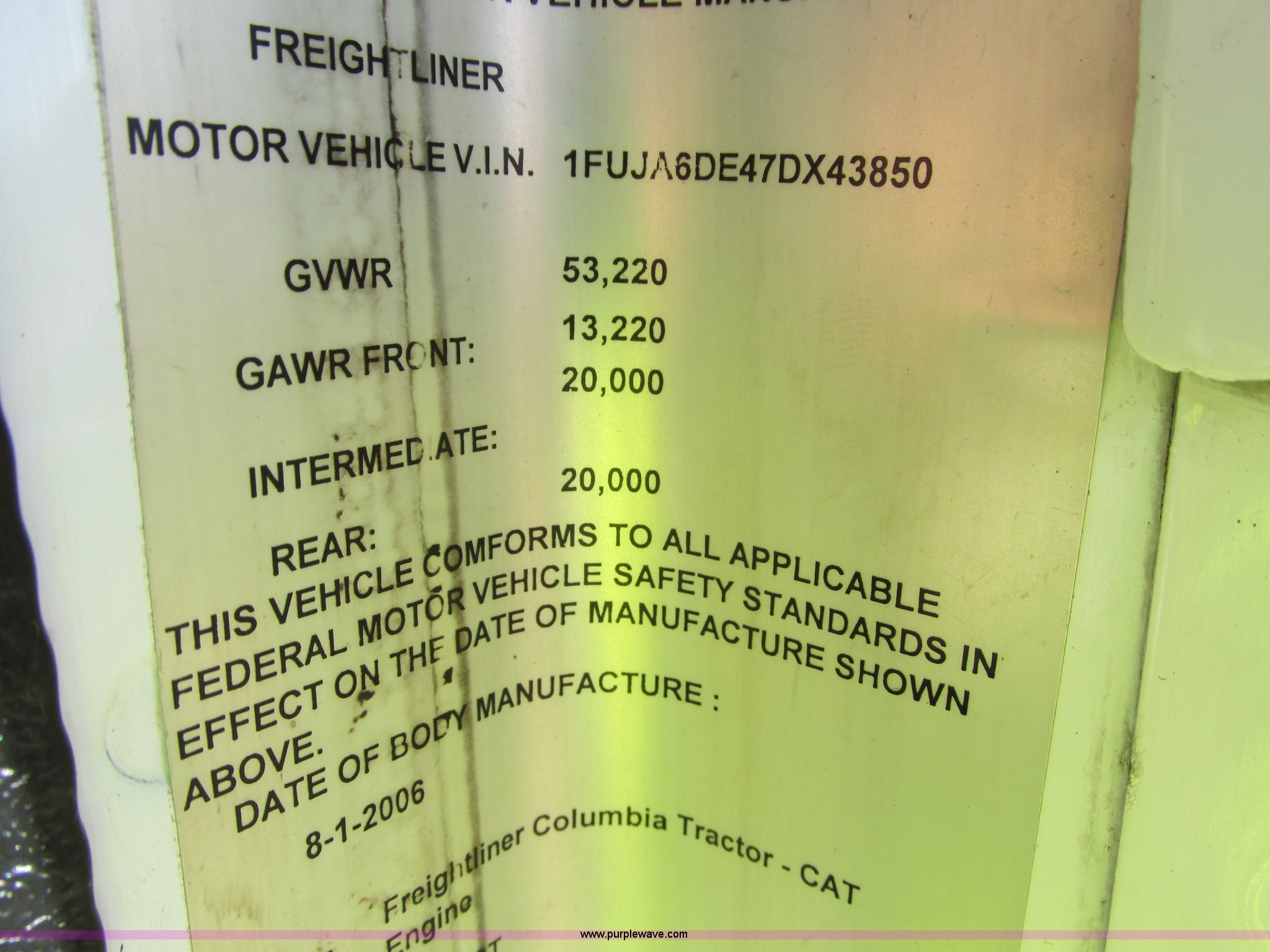 Purple Wave is selling a used Truck Tractor in Iowa. This item is a 2007 Freightliner Columbia CL120ST semi truck with the following: 278,495 miles on odometer, Caterpillar C13 Acert 12.5L L6 diesel engine, Eaton Fuller 10 speed manual transmission, Twin screw, AC and heat, Tilt, Cruise, AM/FM/CD, Passenger daylight door, Telescoping steering wheel, Spring suspension seat, Air suspension seat, Power windows, Heated mirrors, Air ride cab, Visor, Chrome bumper, Block heater, Air slide fifth wheel, Dual 90 gallon fuel tanks, Dual rear exhaust stacks, Aluminum deck plate, Headache rack, Window, Storage, Chain hanger, Stainless steel quarter fender, Light bar, PTO, Wet kit, Dump valves, Air suspension, Nut wheel covers, Air brakes, Jake brake, Front aluminum wheels, 11R24.5 tires, GVWR 53,220 lbs, FAWR 13,220 lbs, IAWR 20,000 lbs, RAWR 20,000 lbs, CB not included, Chains and binders not included, Driver's side mirror damage, EIN 652617RA