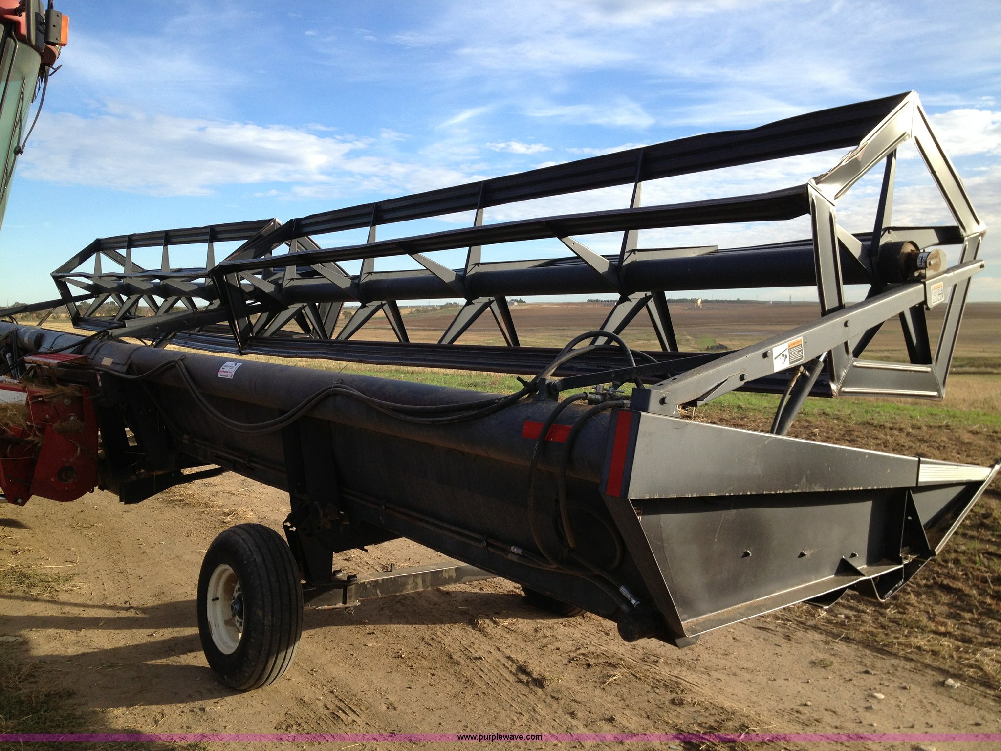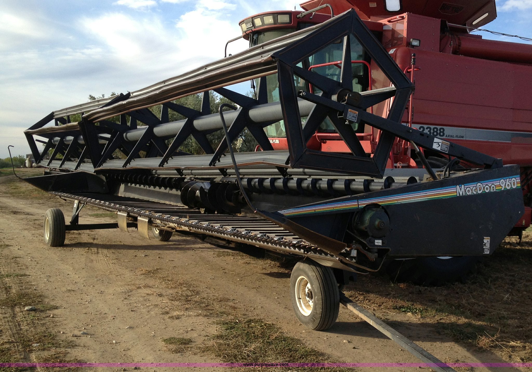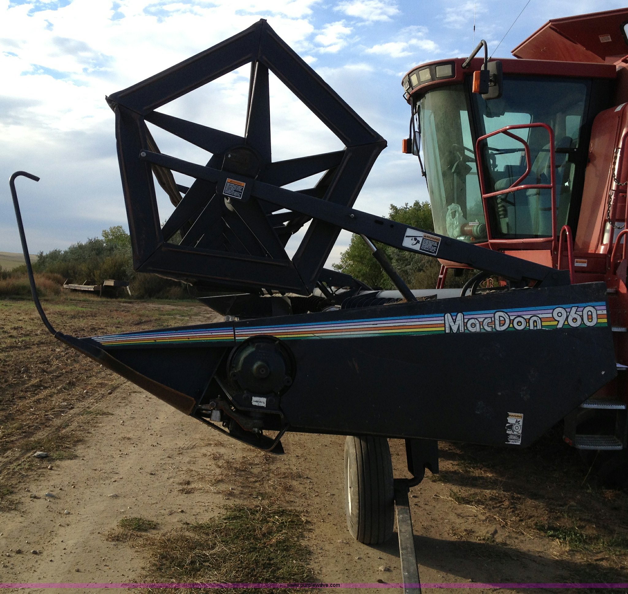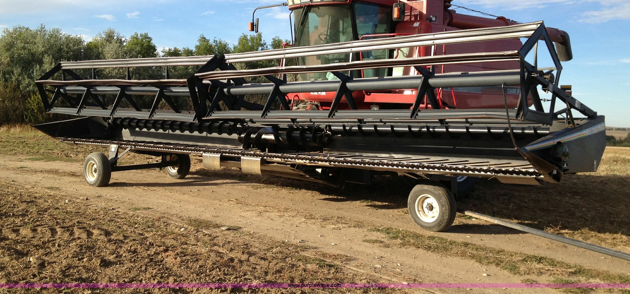 Purple Wave is selling a used Platform or Stripper Head in North Dakota. This item is a 1997 MacDon 960 36' draper head with the following: Crary cutting knives and guards, Case IH adapter plate, Firestone 9.5L-14 tires, Serial 102960