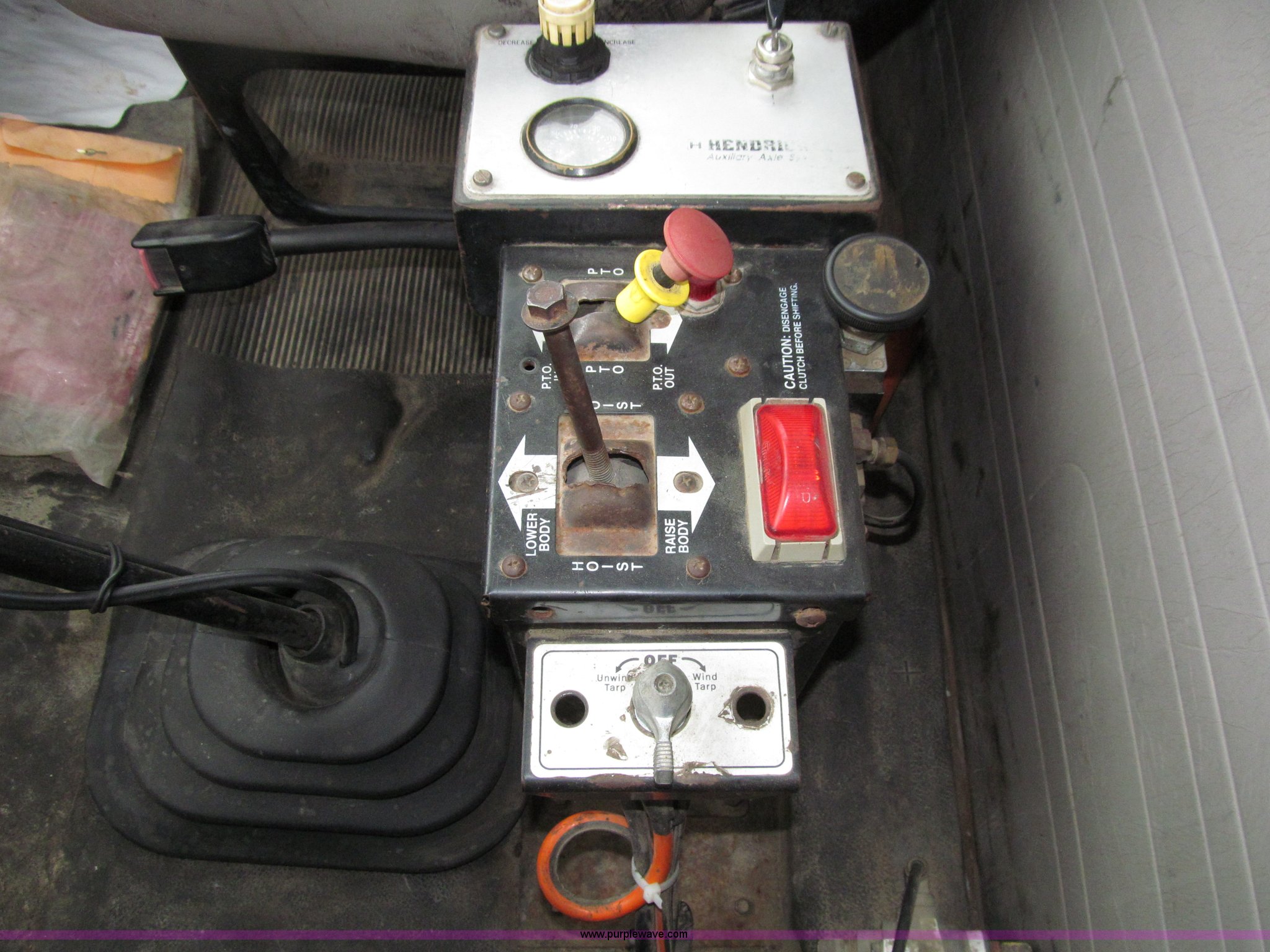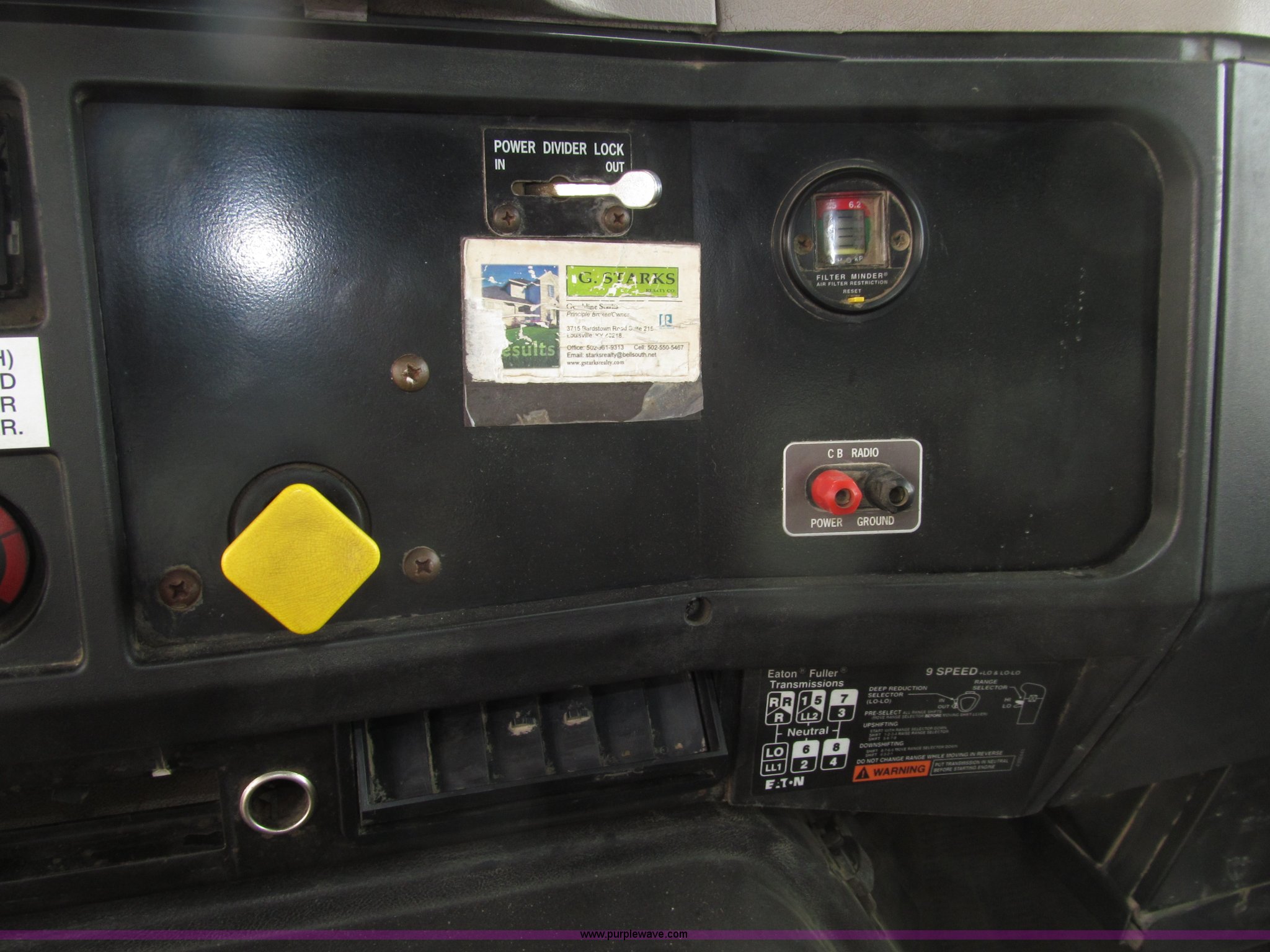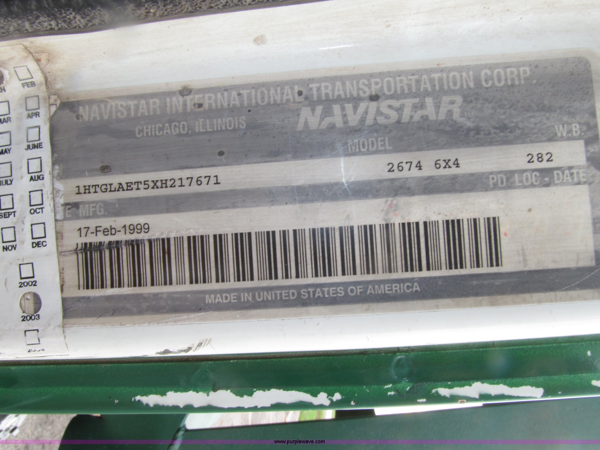 1999 International 2674 triple axle dump truck. 357,520 miles on odometer, Cummins N14-370E 14.0L L6 turbo diesel engine 370 HP, Eaton Fuller 9LL manual transmission, Power divider lock, AC and heat, Cruise, AM/FM/cassette, Air suspension seat, 16' dump bed Top extensions, Roll rite rollover tarp, Air end gate, Four stage ram, Single rear exhaust stack, Block heater, 99 gallon fuel tank, PTO, Air lift third axle, Hendricksen suspension, Air brakes, Jake brake, Brake controller, 282" wheelbase, 11R22.5 tires, 385/65R22.5 pusher tires, GVWR 66,000 lbs, FAWR 20,000 lbs, IAWR 23,000 lbs, RAWR 23,000 lbs, Front grill damage, Passenger side mirror broken. 1HTGLAET5XH217671. 3900 Vandalia Rd. Des Moines, IA 50302