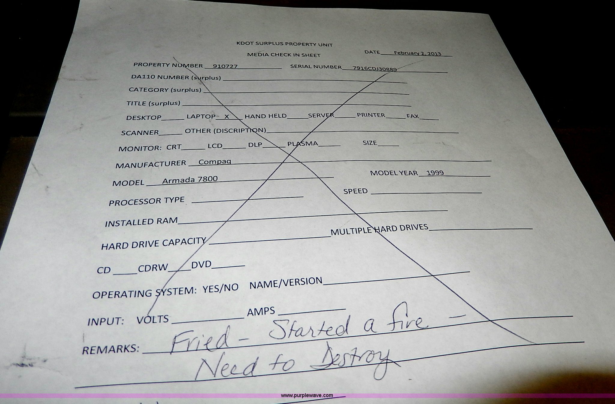 Purple Wave is selling a used Computers in Kansas. This item is a 1999 Compaq Armada 7800 laptop computer with the following: Power supply, Unit caught on fire, Serial 7916CDJ30889, KDOT ID 910727