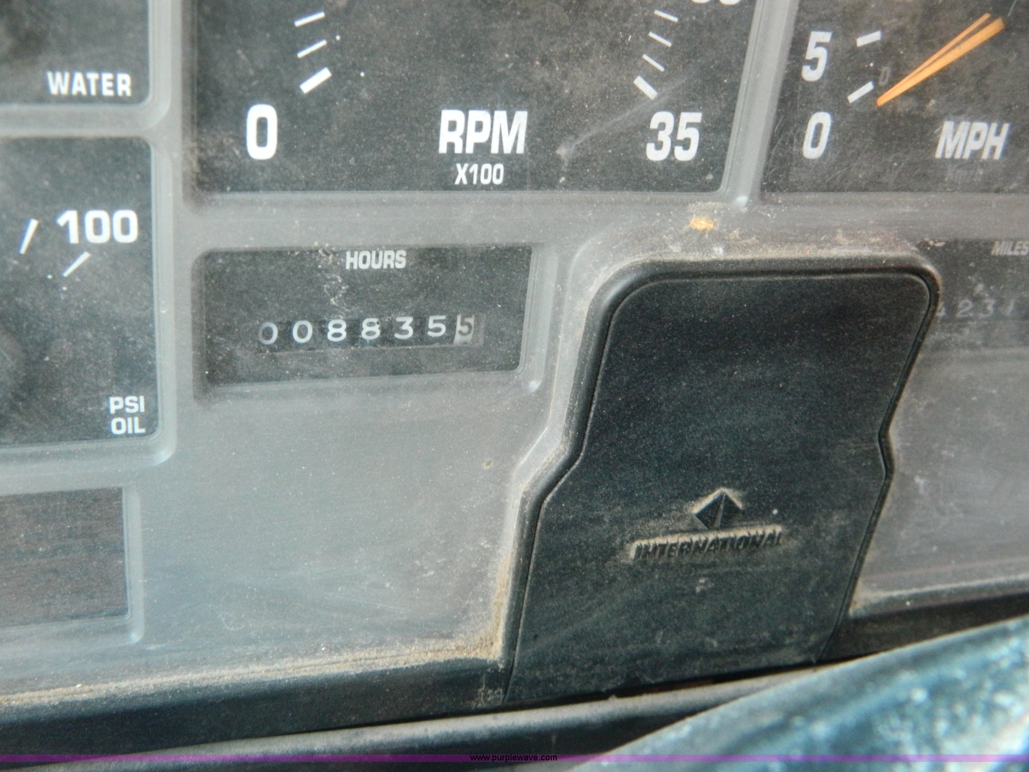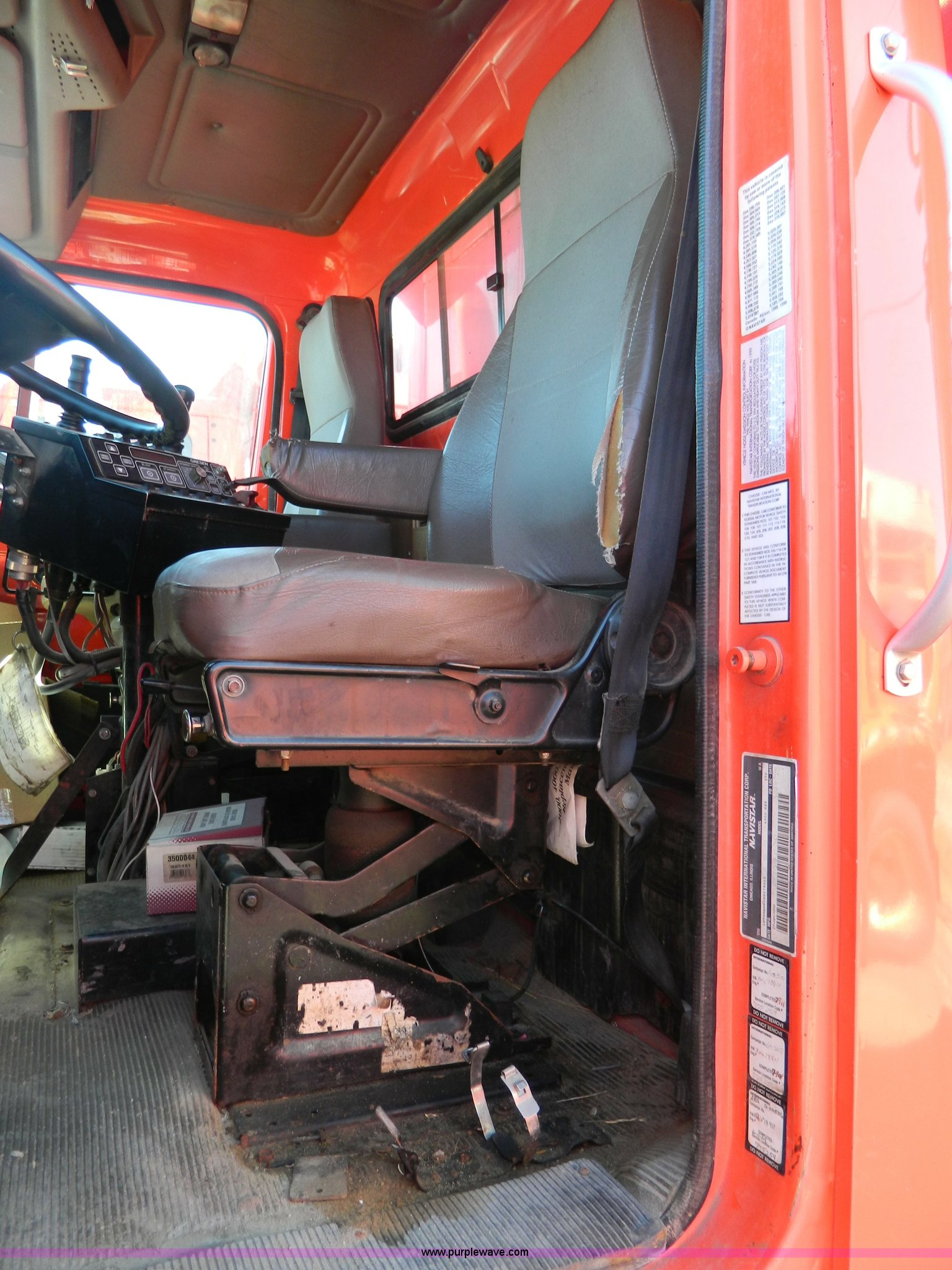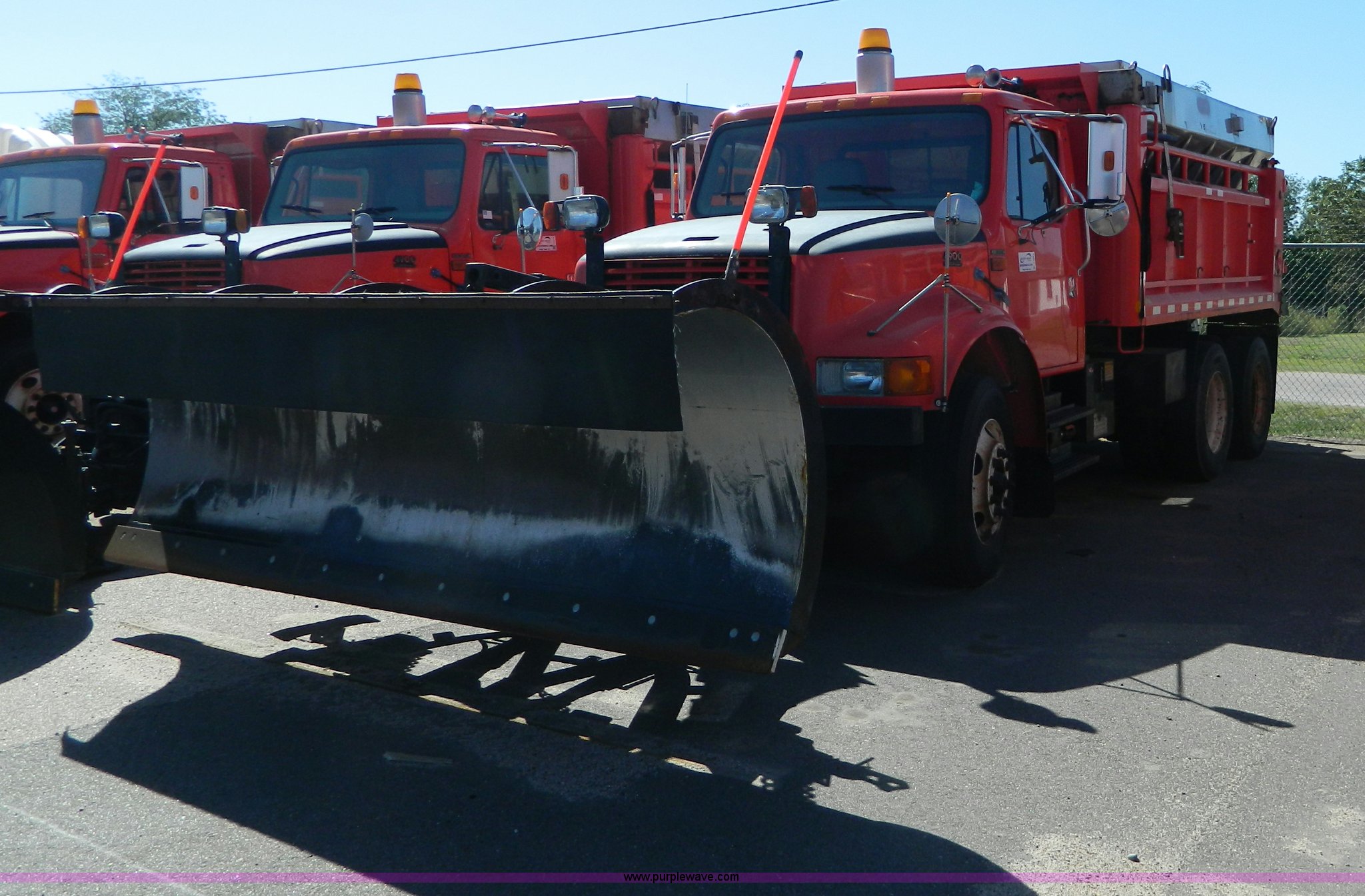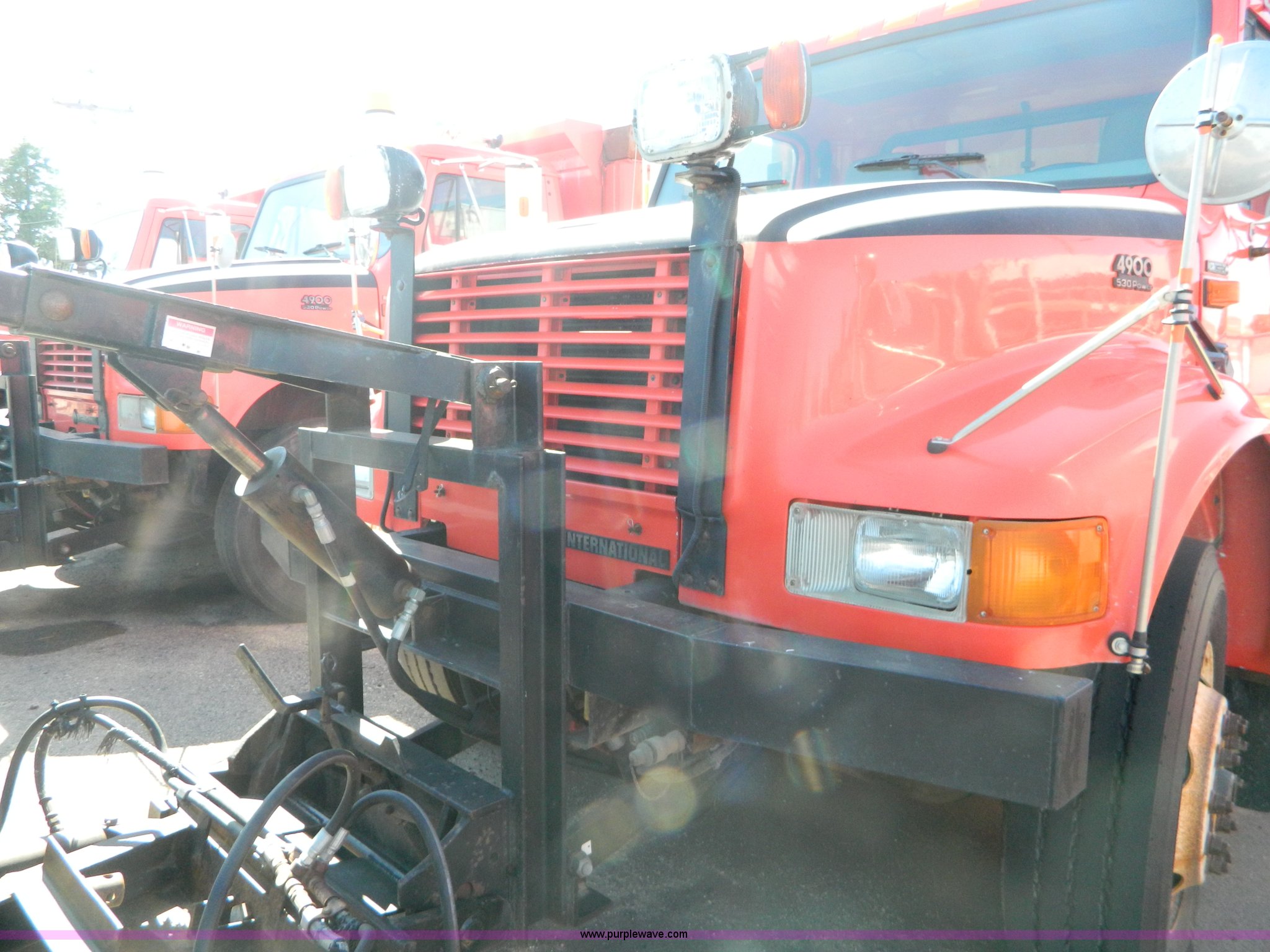 Purple Wave is selling a used Construction Dump Truck in Kansas. This item is a 1999 International 4900 dump truck with the following: 195,238 miles on odometer, 8,835 hours on meter, International DT530 8.7L L6 diesel engine, Allison MD3060-CR transmission, Weatherband radio, Nine yard spreader, Monroe 11' plow, Serial 99-01-2083, 275/80R22.5 front tires, 295/75R22.5 rear tires, Transmission light on, Will not drive forward, will only move in reverse, Paint faded and scratched, Rust, No turn signals, Exhaust rusted out, Tarp bent, Spinner assembly bent, Left front hub leaks, KDOT ID 264-3108