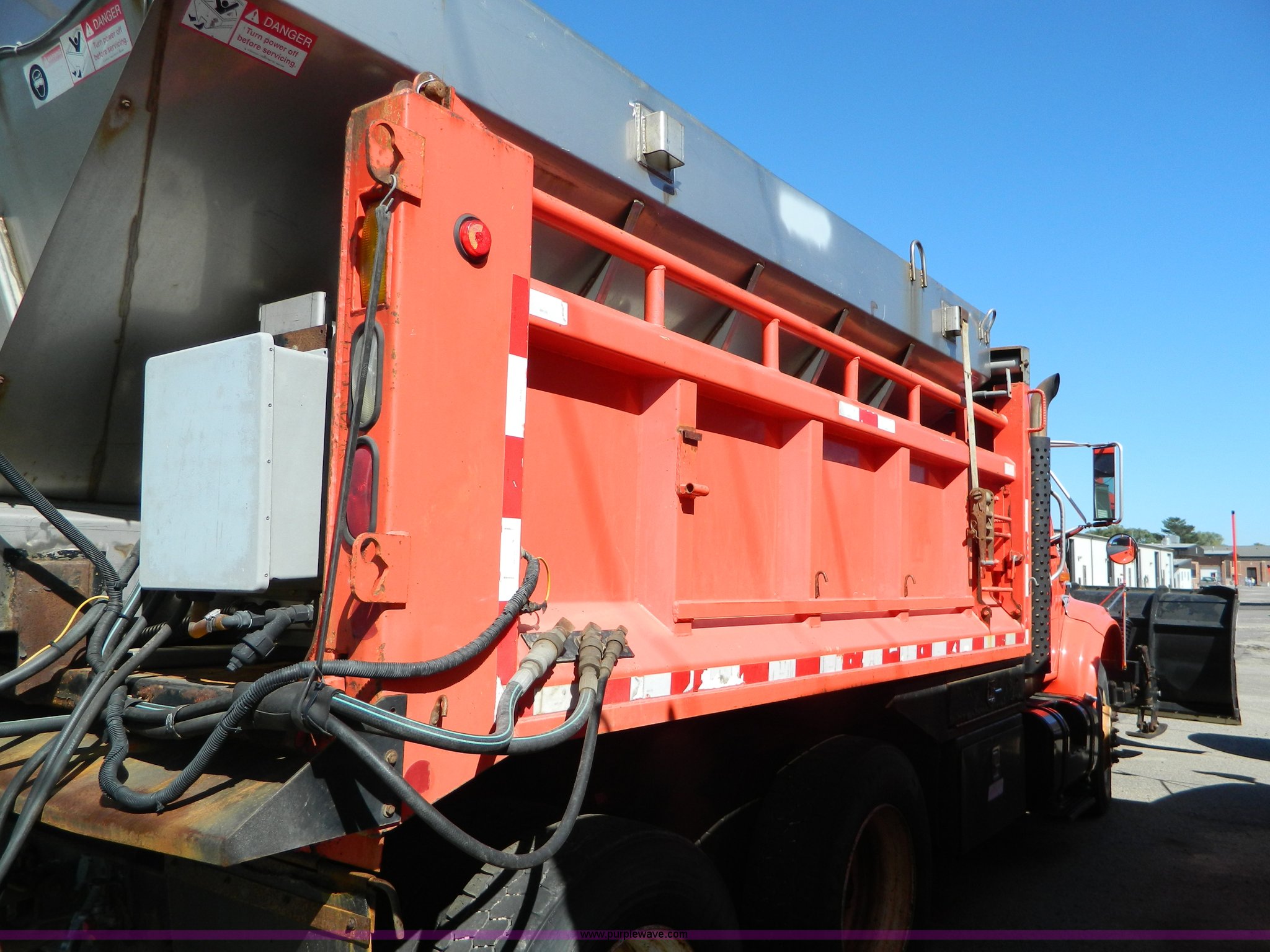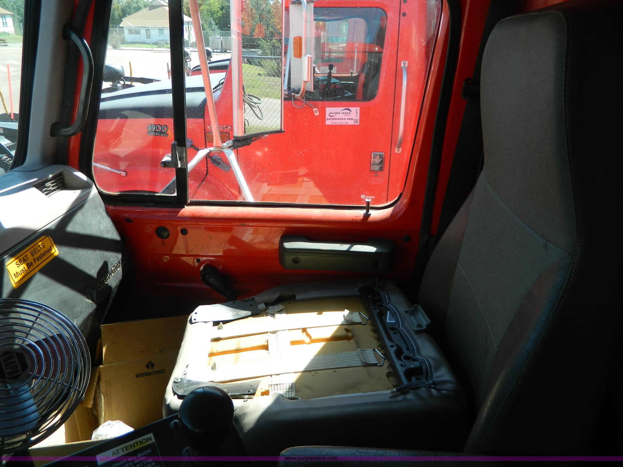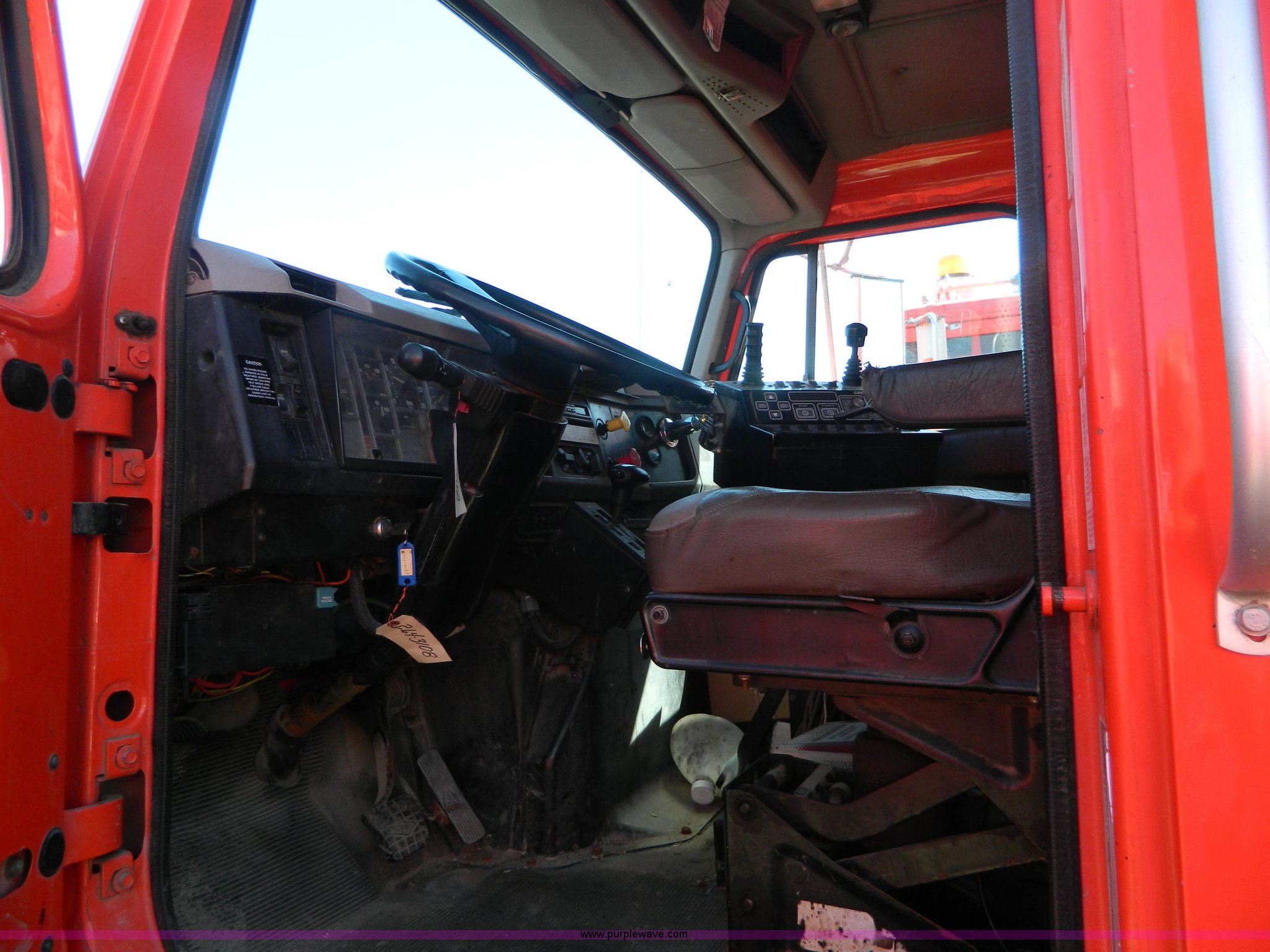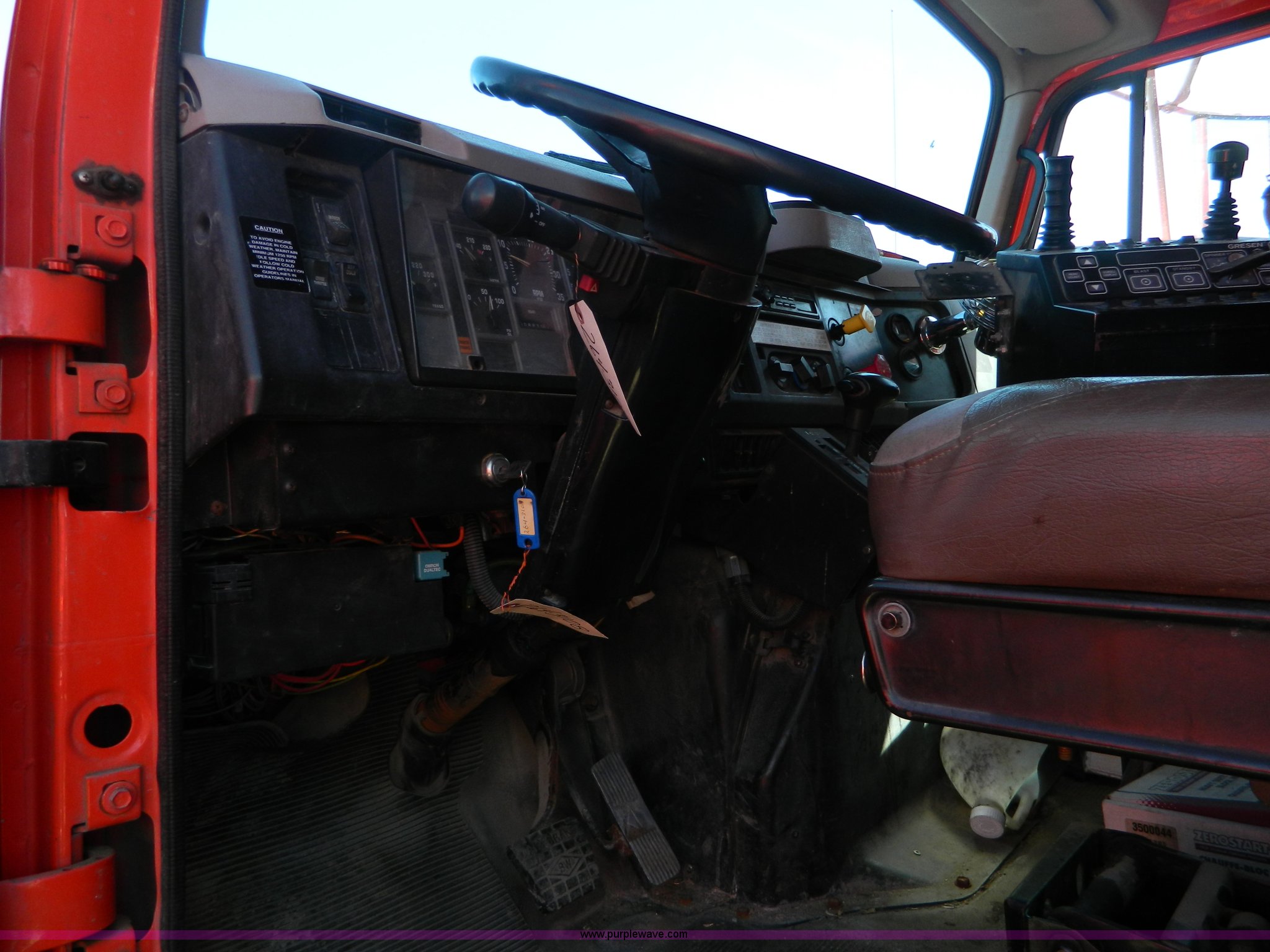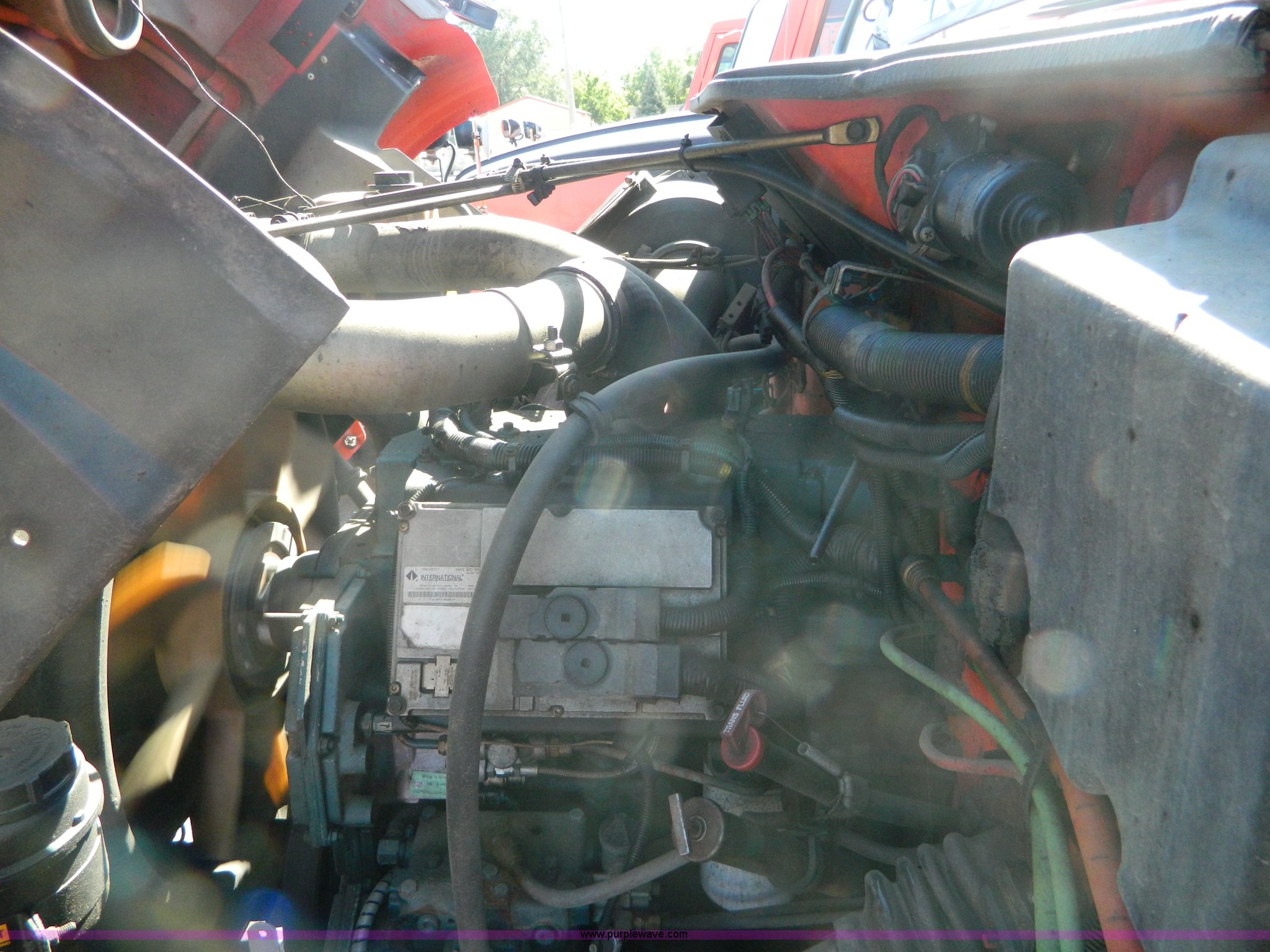 Purple Wave is selling a used Construction Dump Truck in Kansas. This item is a 1999 International 4900 dump truck with the following: 195,238 miles on odometer, 8,835 hours on meter, International DT530 8.7L L6 diesel engine, Allison MD3060-CR transmission, Weatherband radio, Nine yard spreader, Monroe 11' plow, Serial 99-01-2083, 275/80R22.5 front tires, 295/75R22.5 rear tires, Transmission light on, Will not drive forward, will only move in reverse, Paint faded and scratched, Rust, No turn signals, Exhaust rusted out, Tarp bent, Spinner assembly bent, Left front hub leaks, KDOT ID 264-3108