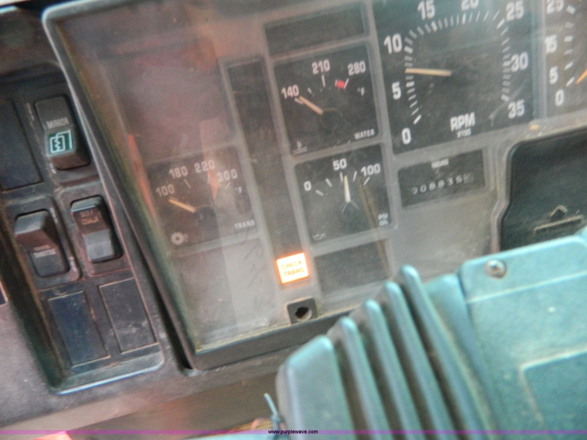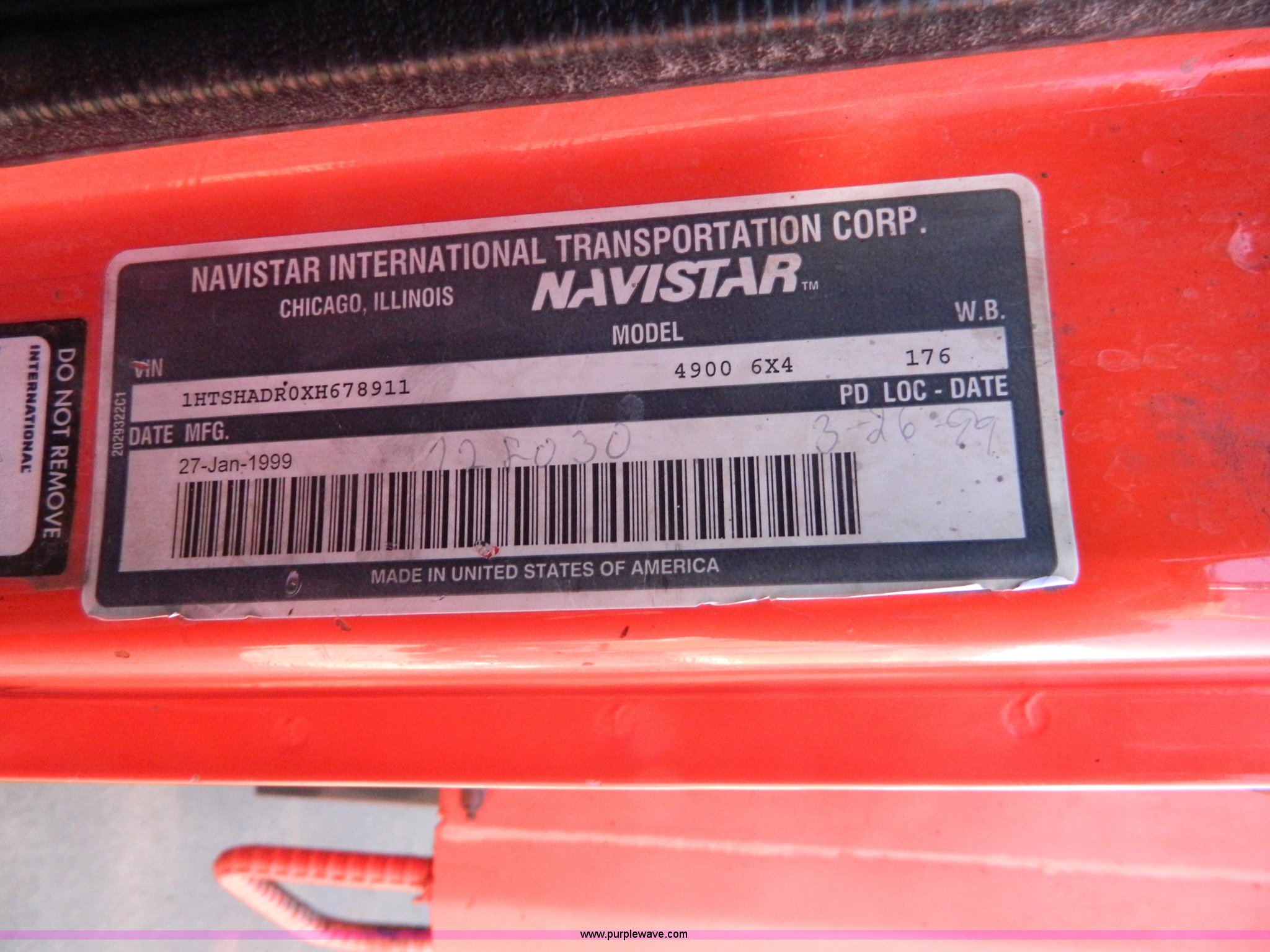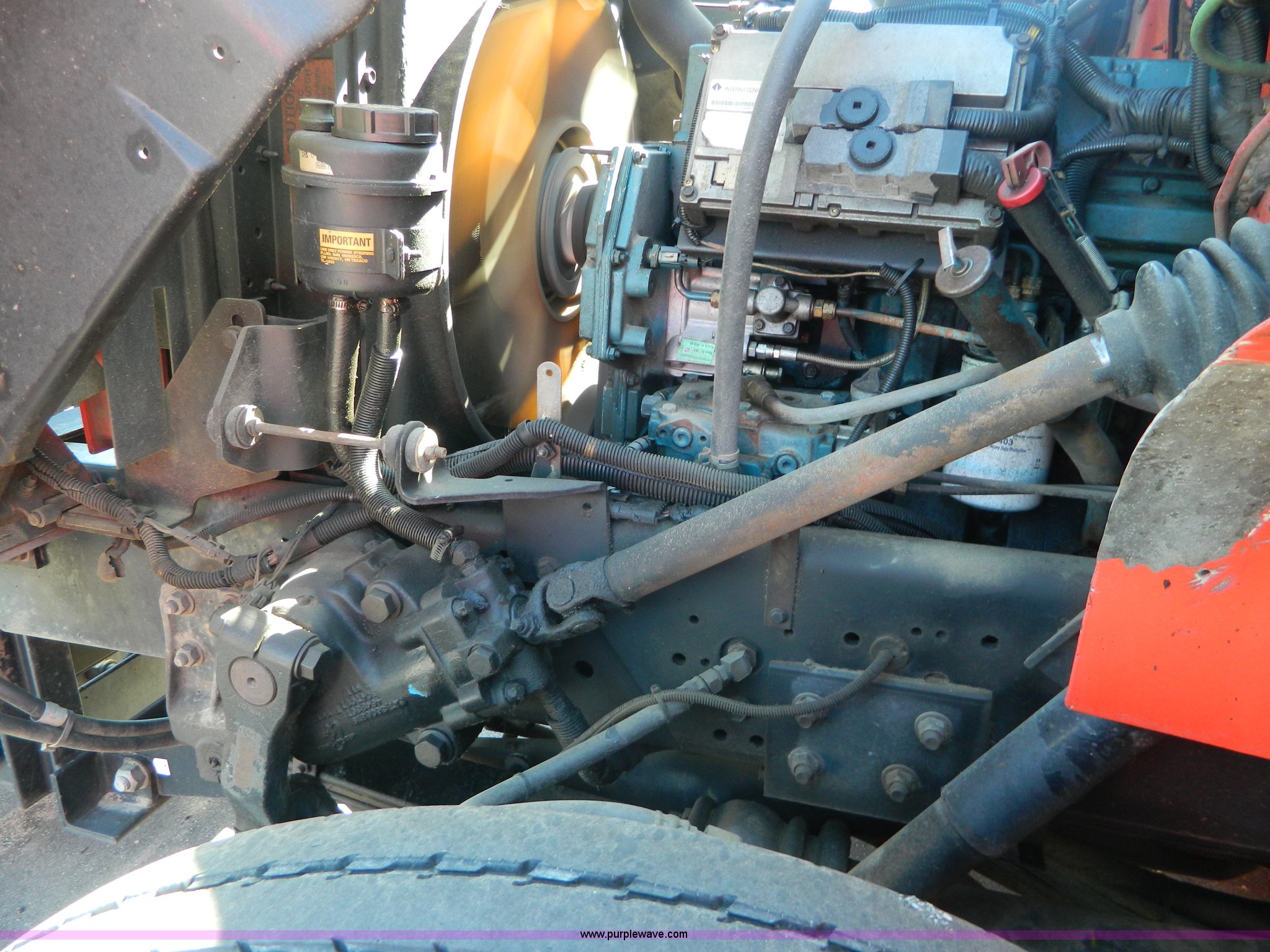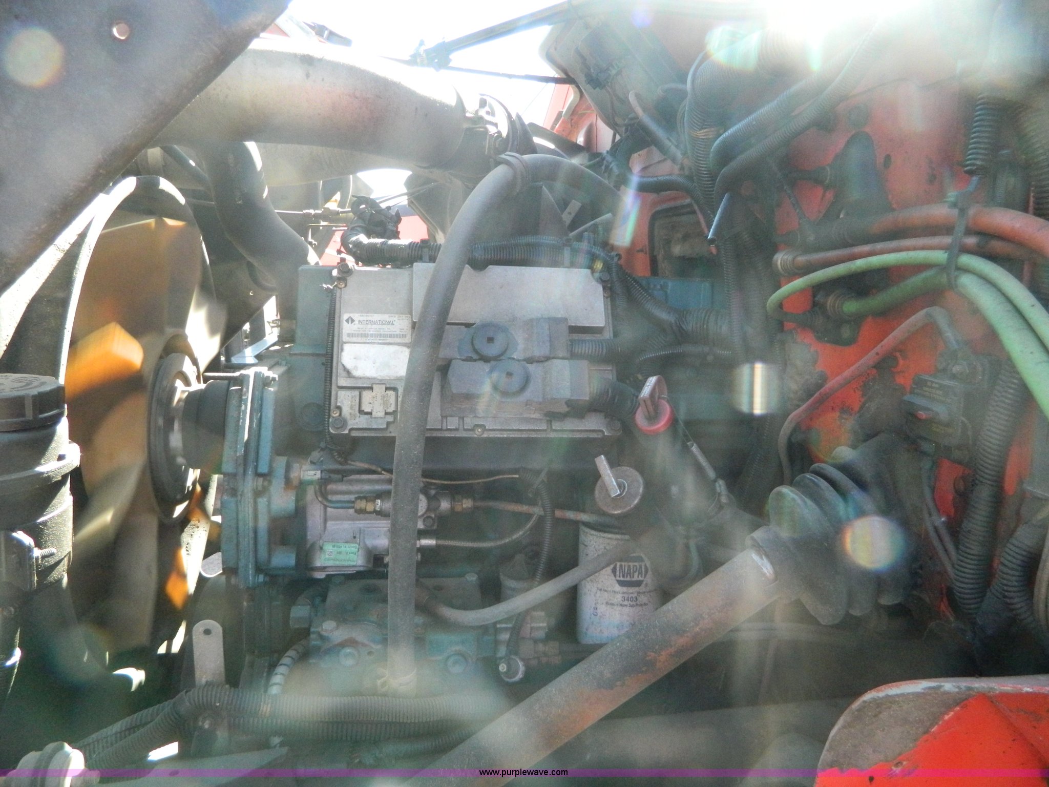 Purple Wave is selling a used Construction Dump Truck in Kansas. This item is a 1999 International 4900 dump truck with the following: 195,238 miles on odometer, 8,835 hours on meter, International DT530 8.7L L6 diesel engine, Allison MD3060-CR transmission, Weatherband radio, Nine yard spreader, Monroe 11' plow, Serial 99-01-2083, 275/80R22.5 front tires, 295/75R22.5 rear tires, Transmission light on, Will not drive forward, will only move in reverse, Paint faded and scratched, Rust, No turn signals, Exhaust rusted out, Tarp bent, Spinner assembly bent, Left front hub leaks, KDOT ID 264-3108