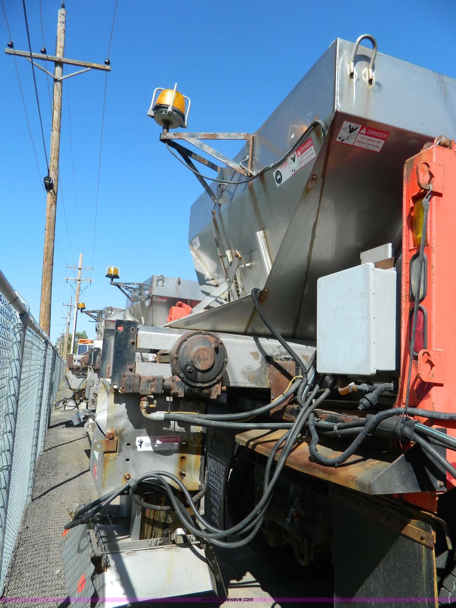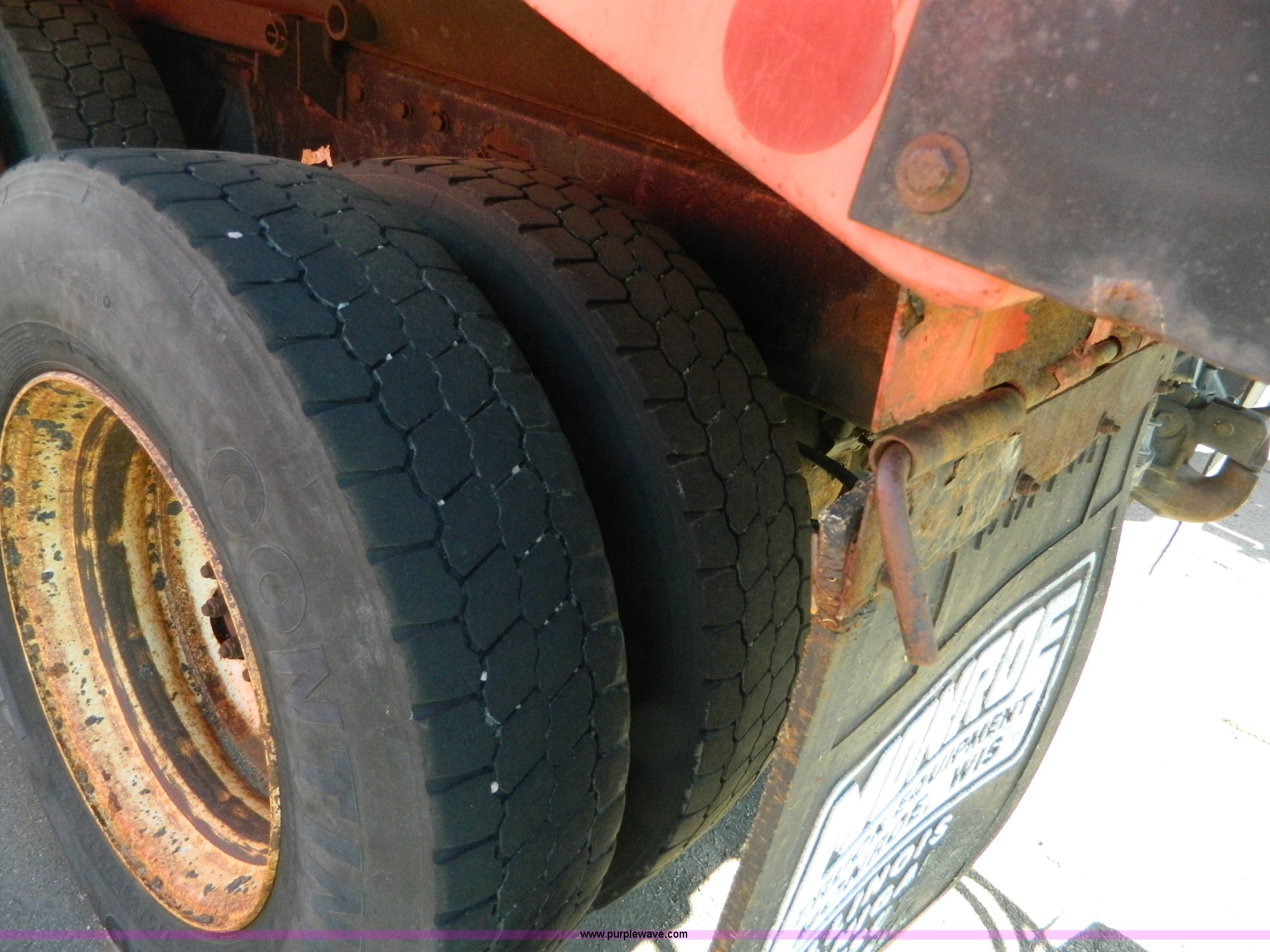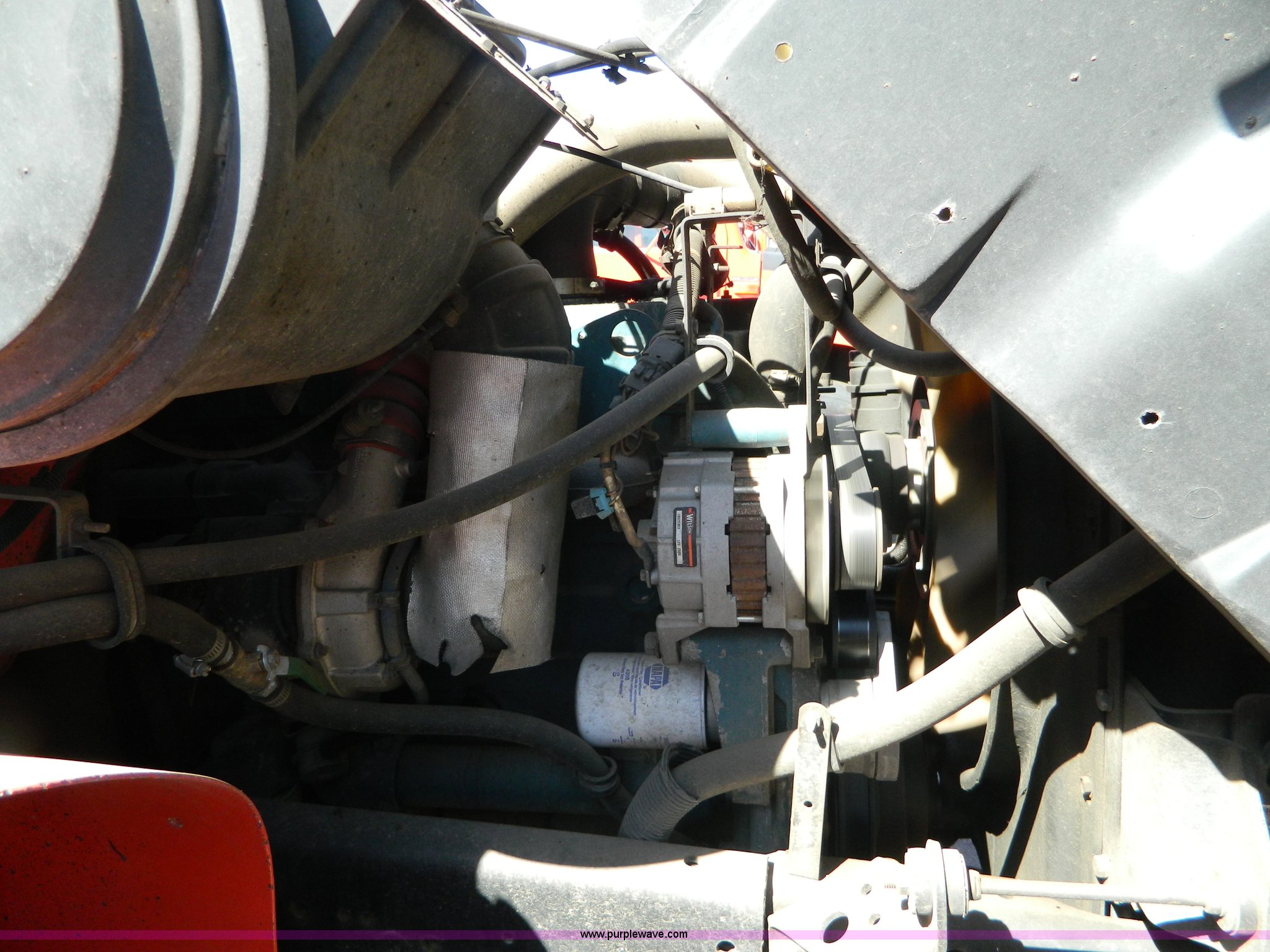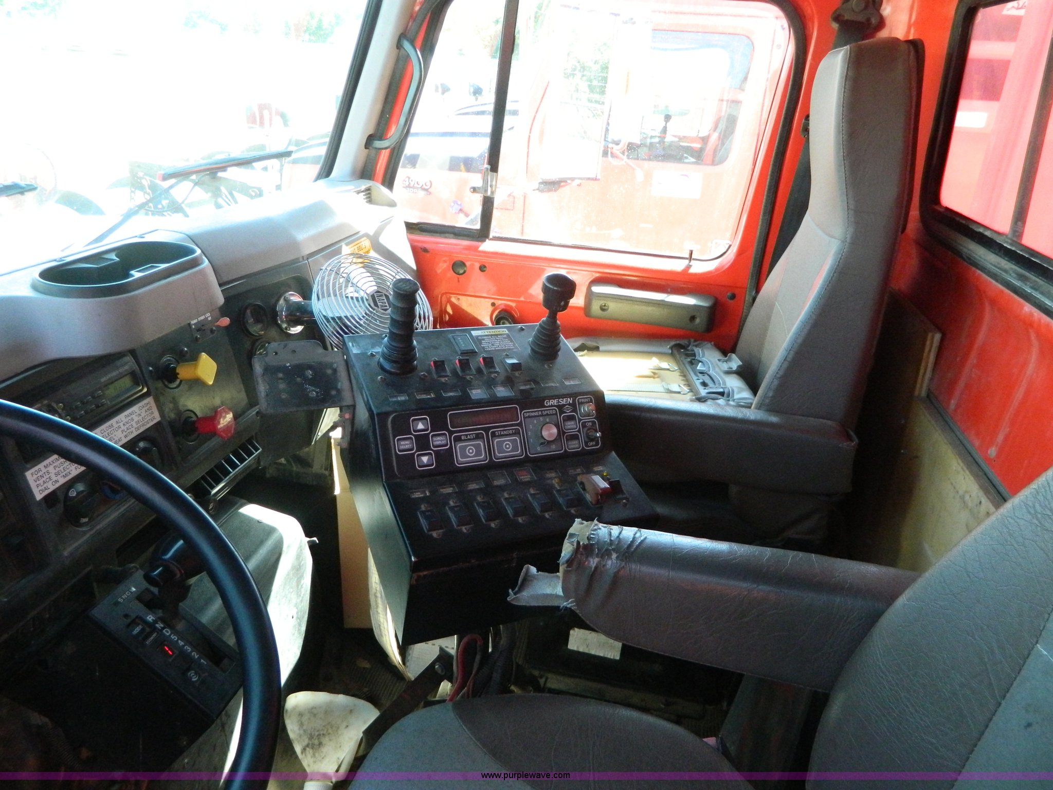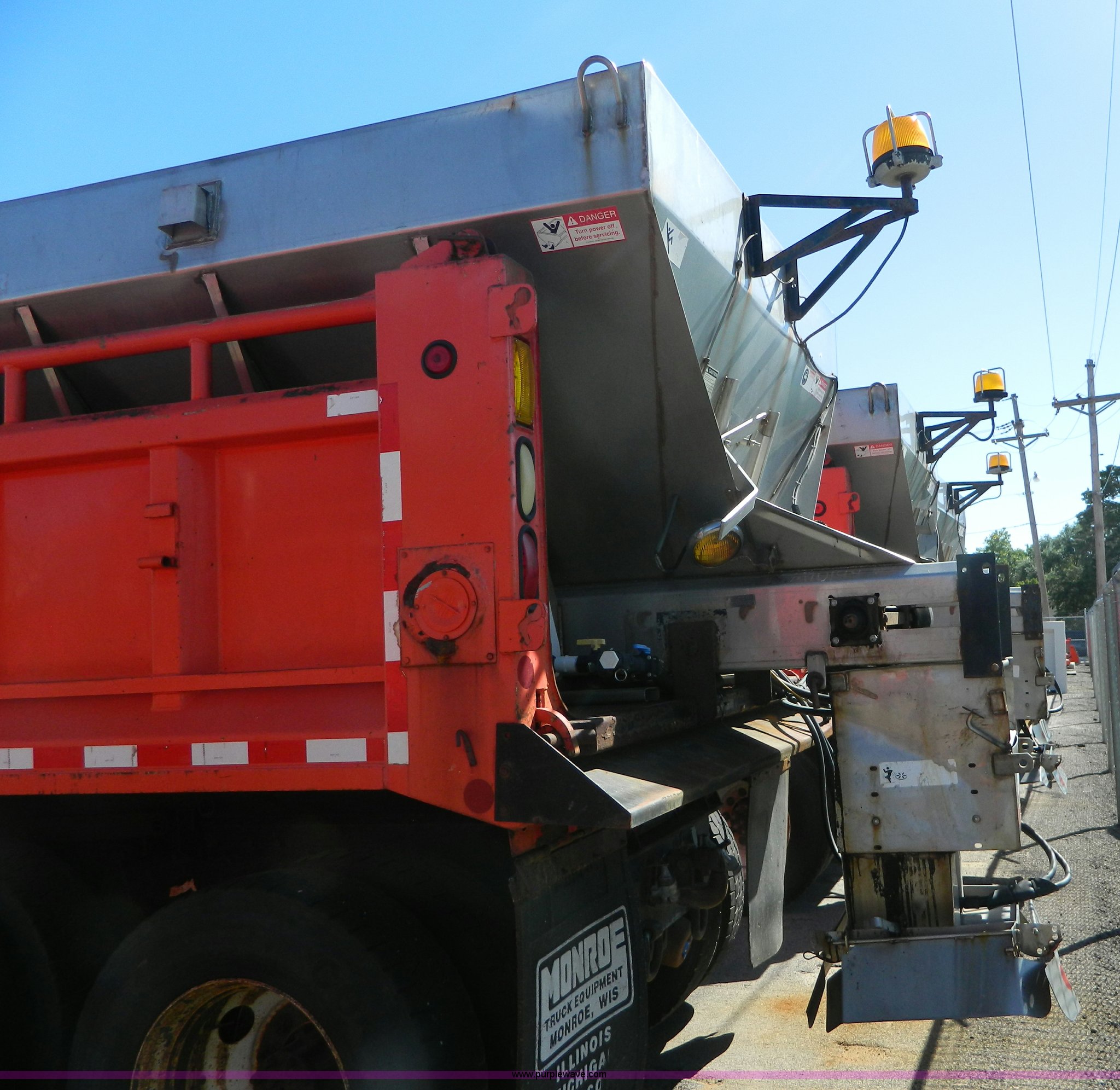 Purple Wave is selling a used Construction Dump Truck in Kansas. This item is a 1999 International 4900 dump truck with the following: 195,238 miles on odometer, 8,835 hours on meter, International DT530 8.7L L6 diesel engine, Allison MD3060-CR transmission, Weatherband radio, Nine yard spreader, Monroe 11' plow, Serial 99-01-2083, 275/80R22.5 front tires, 295/75R22.5 rear tires, Transmission light on, Will not drive forward, will only move in reverse, Paint faded and scratched, Rust, No turn signals, Exhaust rusted out, Tarp bent, Spinner assembly bent, Left front hub leaks, KDOT ID 264-3108