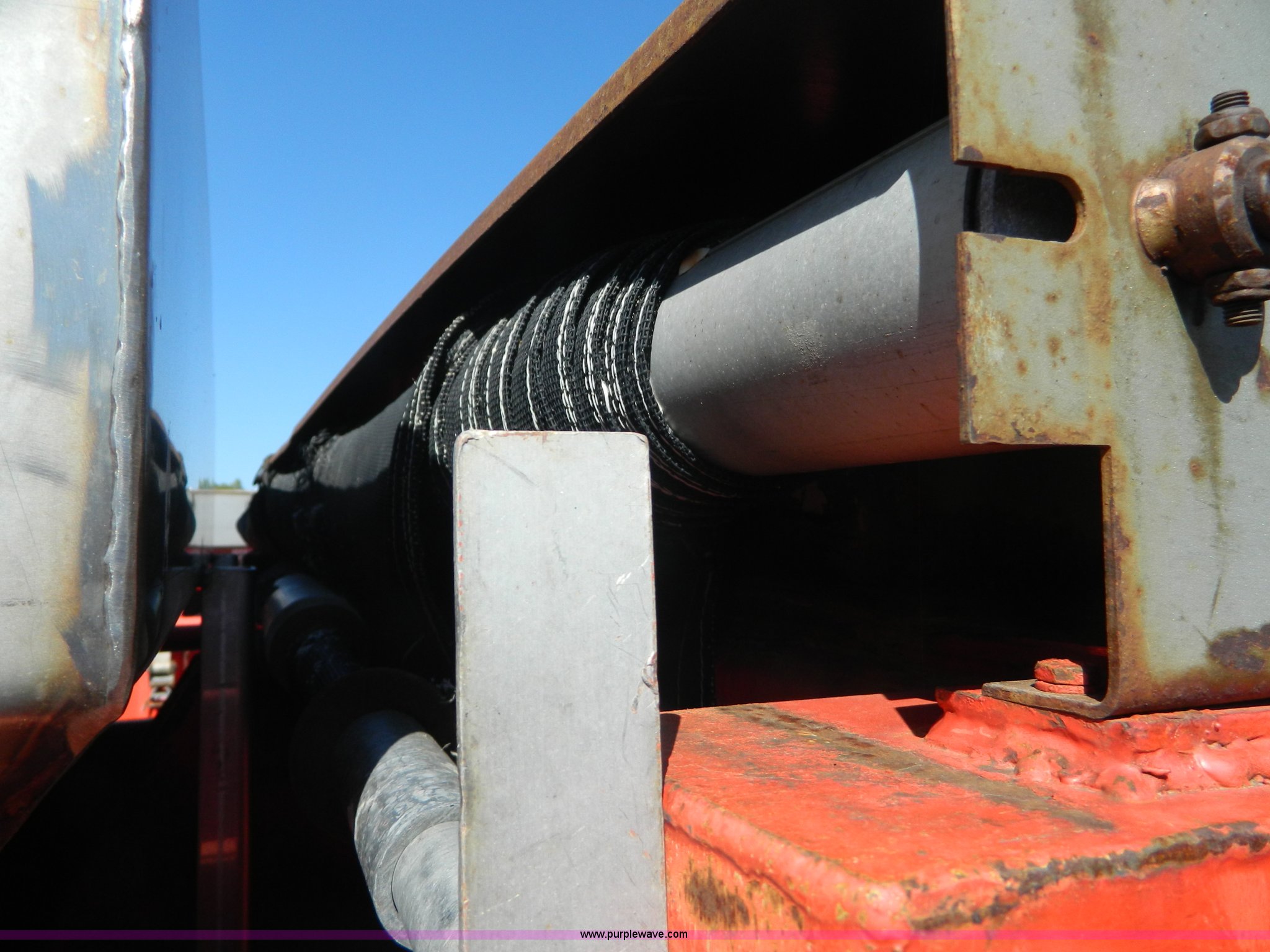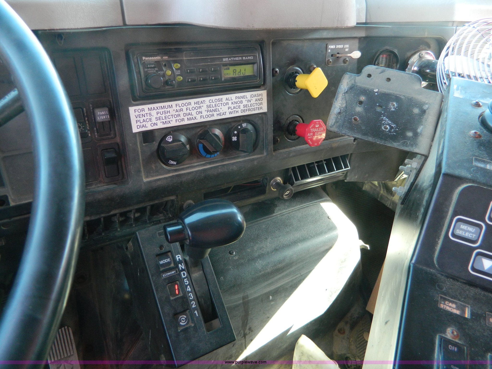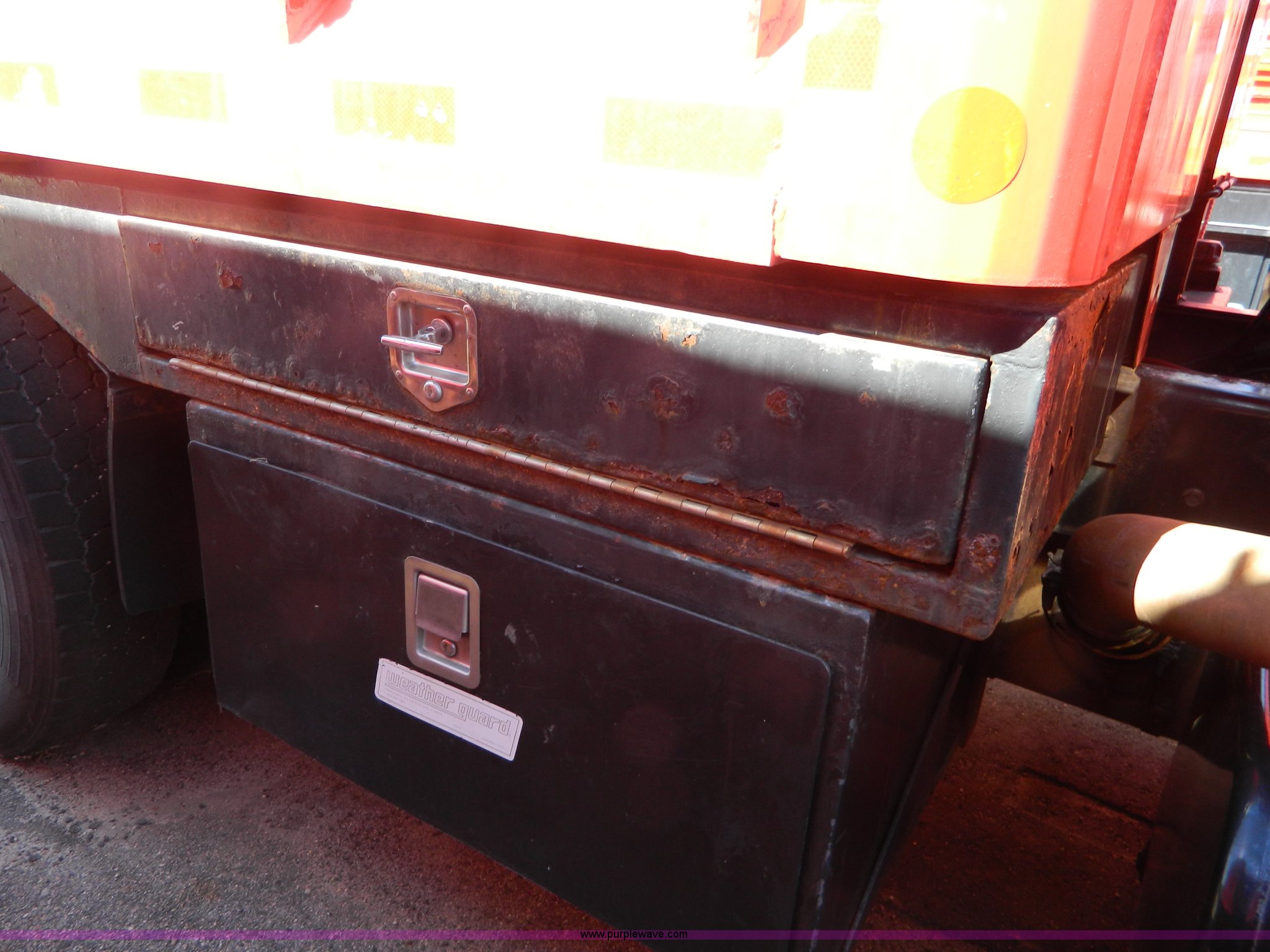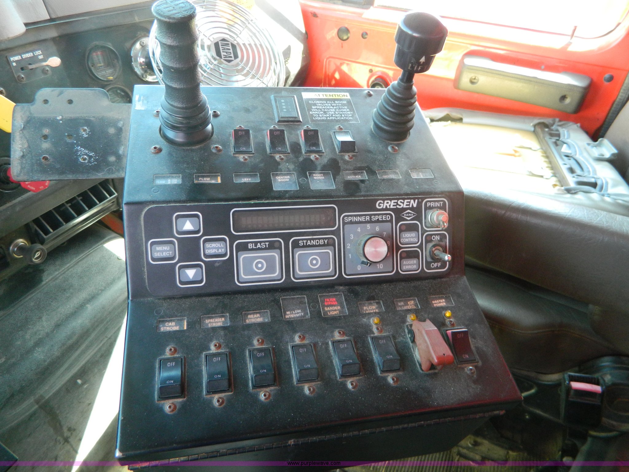 Purple Wave is selling a used Construction Dump Truck in Kansas. This item is a 1999 International 4900 dump truck with the following: 195,238 miles on odometer, 8,835 hours on meter, International DT530 8.7L L6 diesel engine, Allison MD3060-CR transmission, Weatherband radio, Nine yard spreader, Monroe 11' plow, Serial 99-01-2083, 275/80R22.5 front tires, 295/75R22.5 rear tires, Transmission light on, Will not drive forward, will only move in reverse, Paint faded and scratched, Rust, No turn signals, Exhaust rusted out, Tarp bent, Spinner assembly bent, Left front hub leaks, KDOT ID 264-3108
