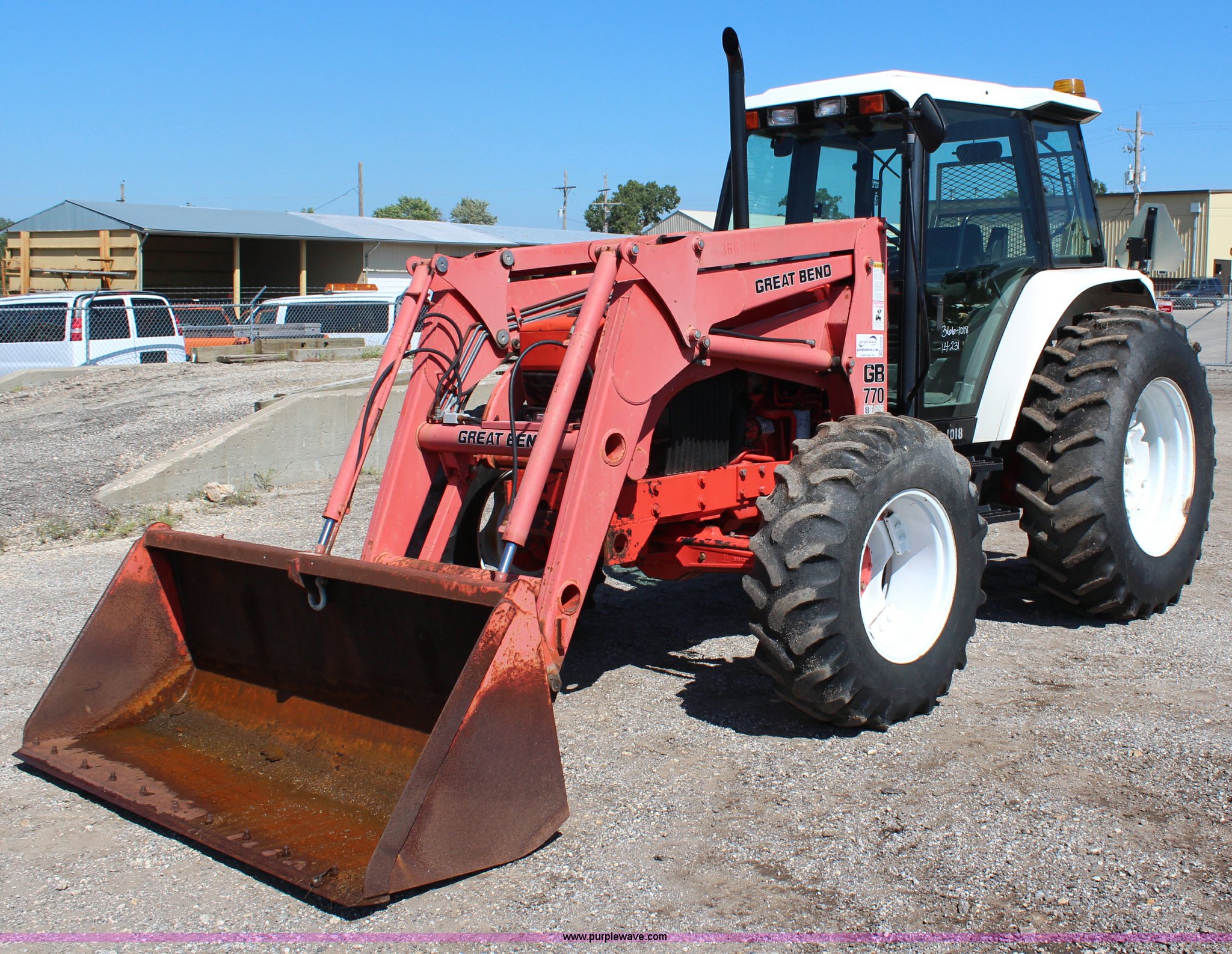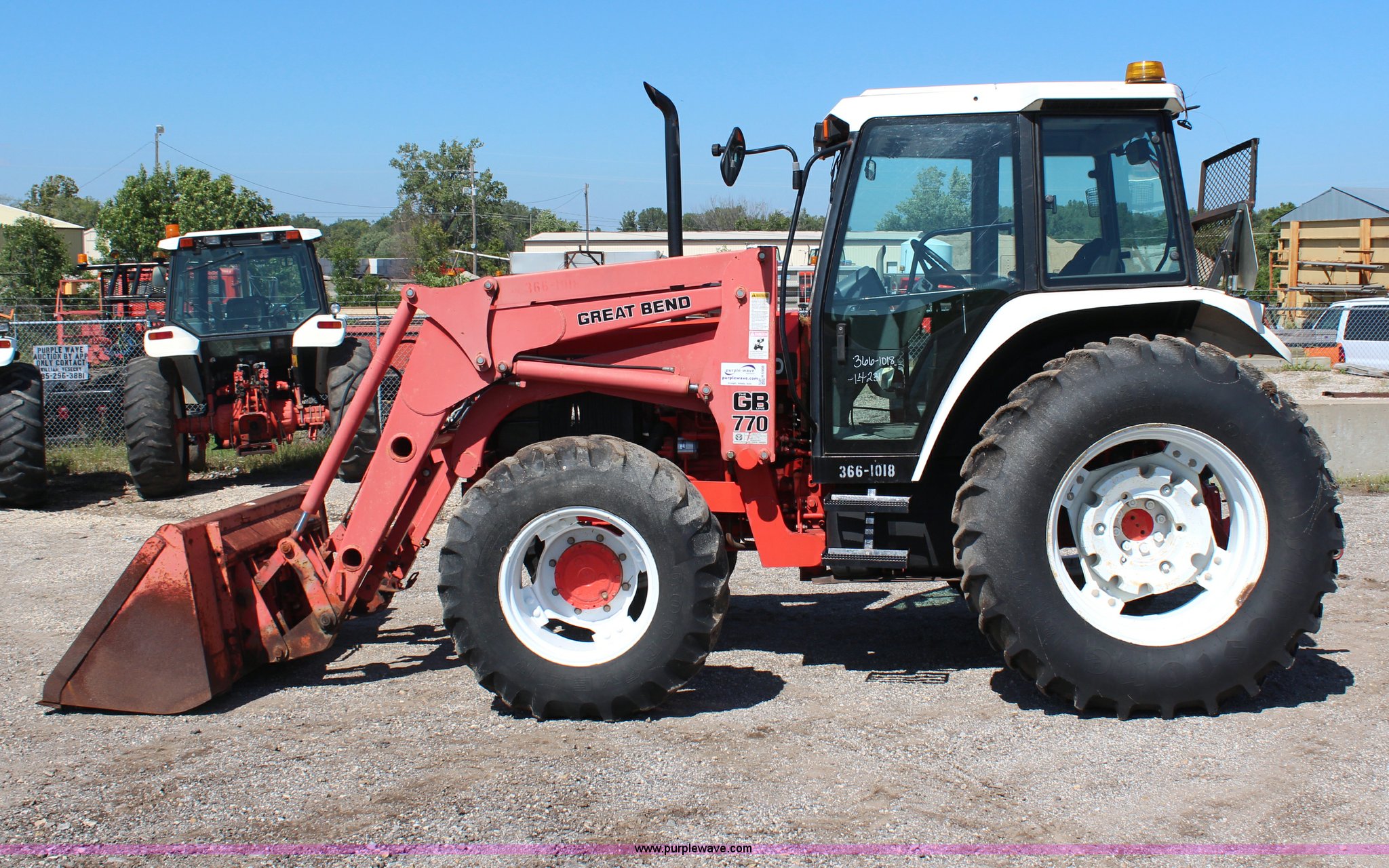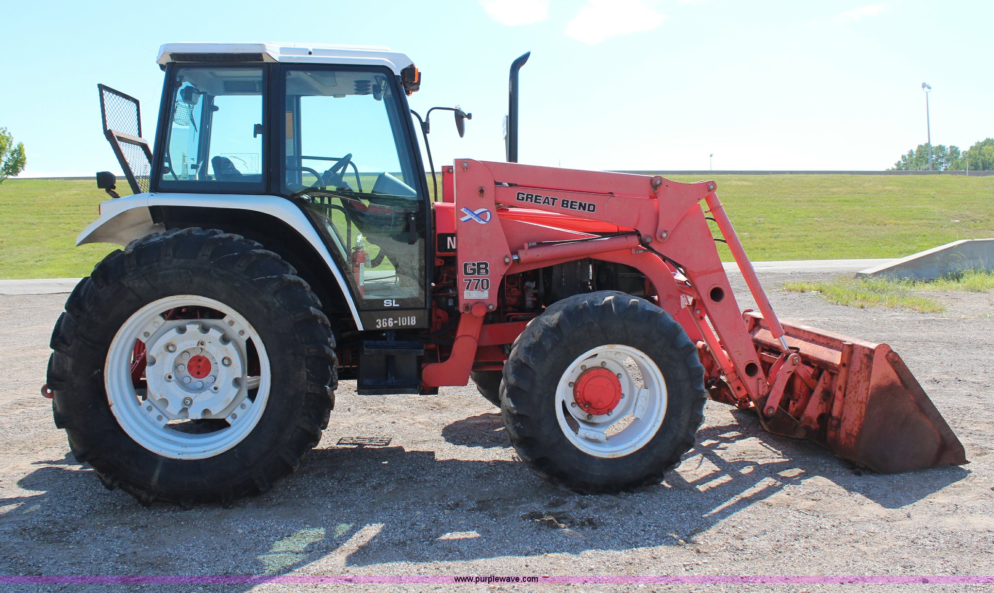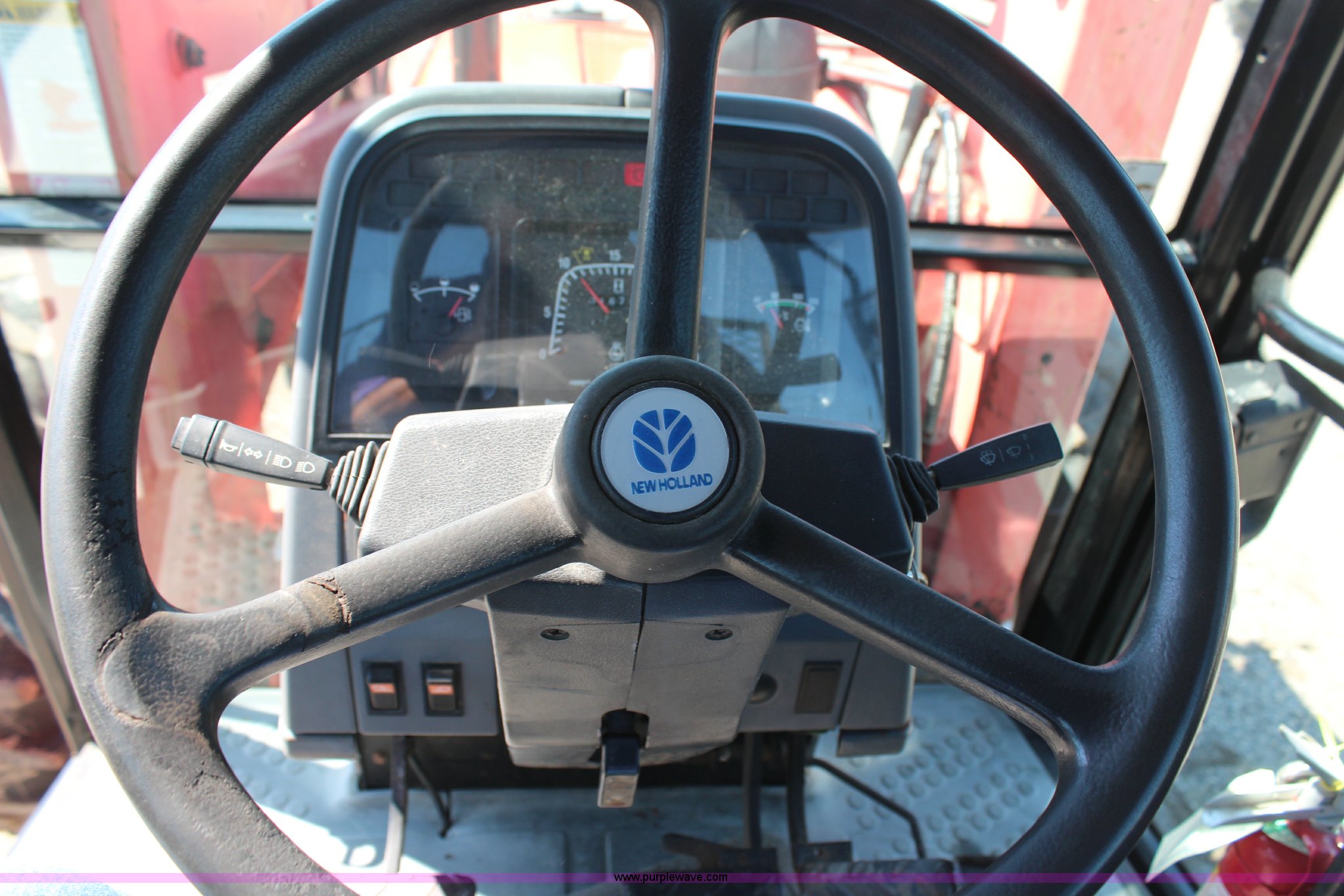 Purple Wave is selling a used Tractor in Kansas. This item is a 1997 New Holland 7740SL MFWD tractor with the following: 4,586 hours on meter, Ford 5.0L four cylinder diesel engine, Synchroshift transmission, 12F-12R gears, Differential lock, AC and heat, AM/FM/cassette, Spring suspension seat, Tilt steering wheel, Great Bend 770 loader, 7' bucket, Bolt-on cutting edge, Quick attach, Two-lever control, Serial 1694, Three point, Auxiliary outlet, 540/1000 PTO, 86 PTO HP, (4) rear hydraulic remotes, Wheel weights, 94" wheelbase, 14.9-24 front tires, 18.4-34 rear tires, Paint faded and scratched, Hydraulics weak, Poor condition of forward and reverse, Synchronizer bad, PTO clutch is out, Damaged steering cylinder, Dead batteries, Serial 087692B, KDOT ID 366-1018