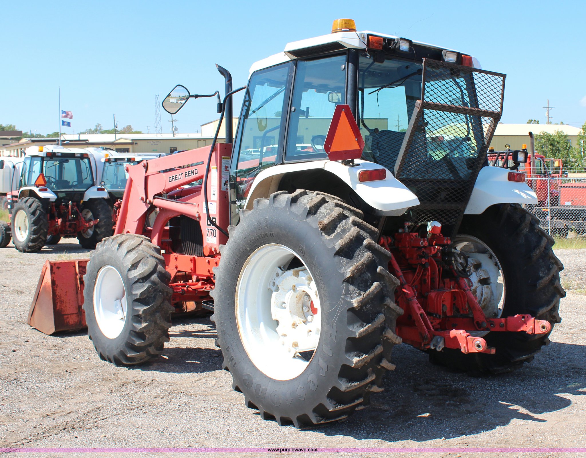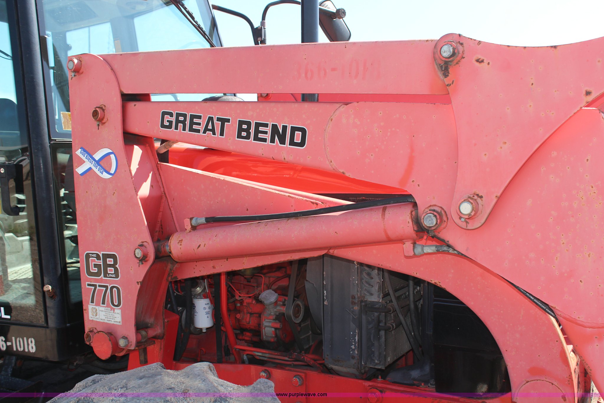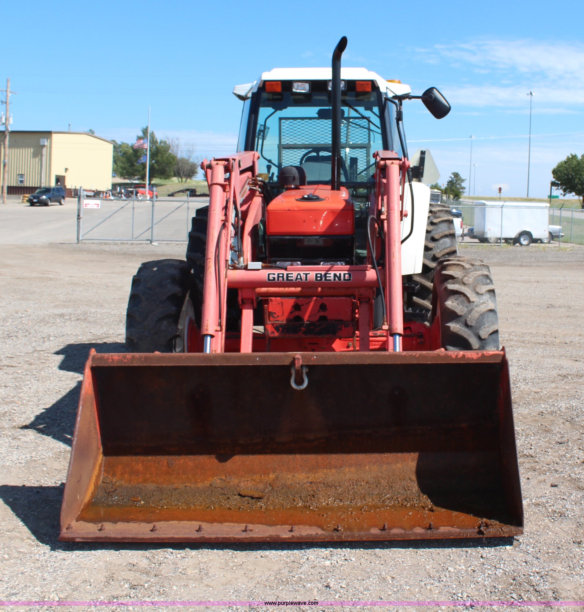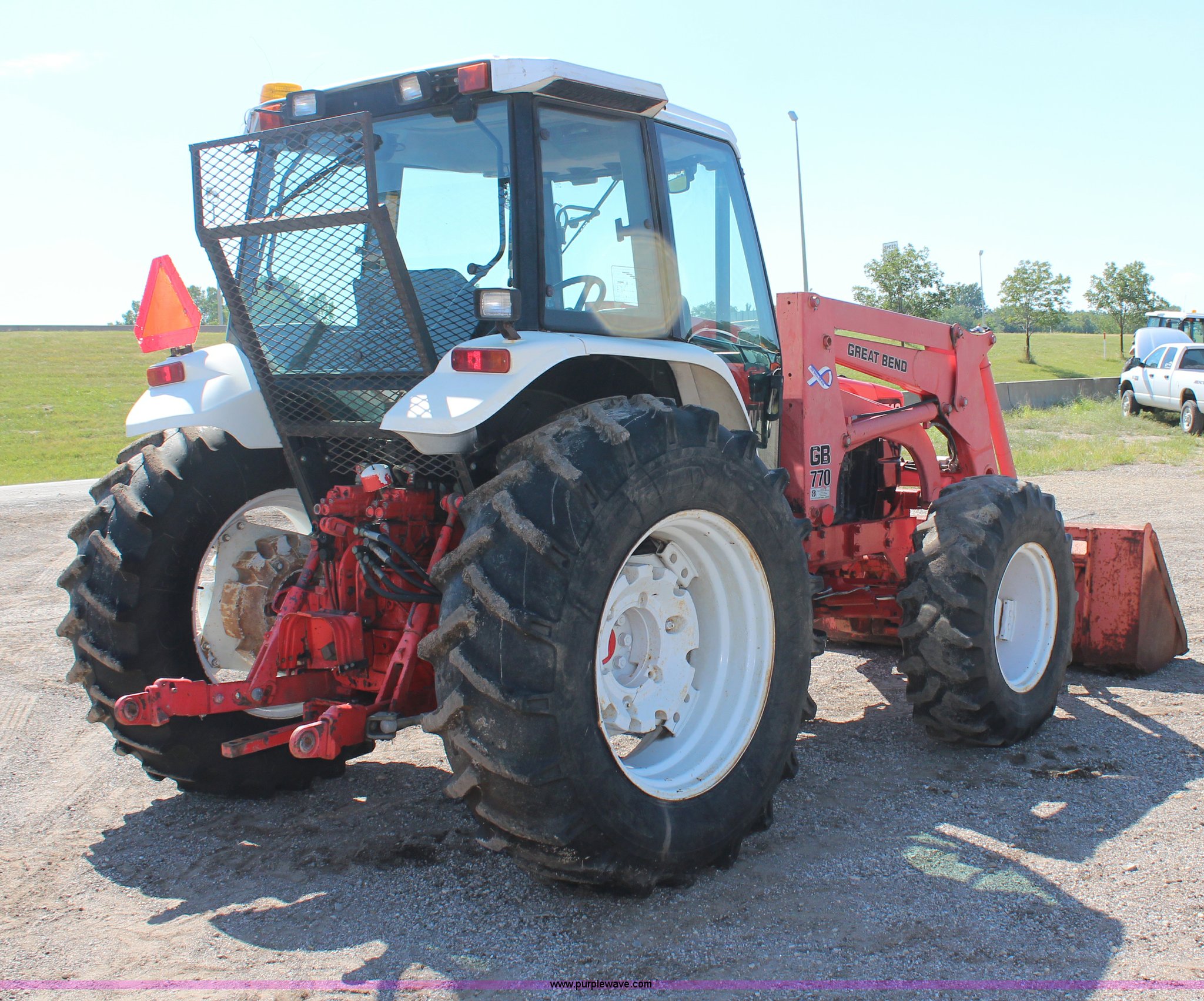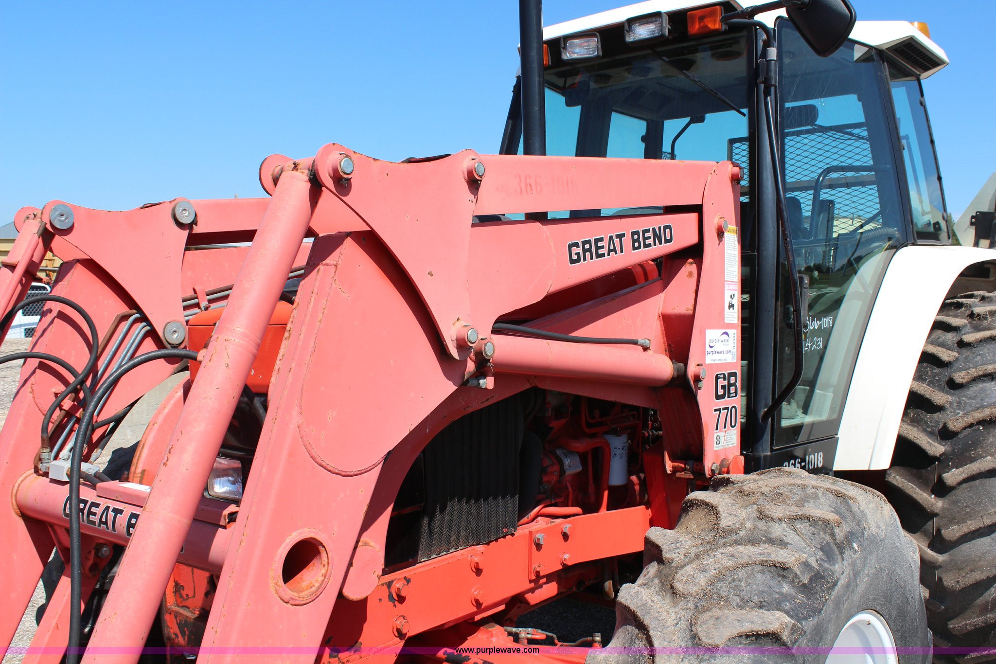 Purple Wave is selling a used Tractor in Kansas. This item is a 1997 New Holland 7740SL MFWD tractor with the following: 4,586 hours on meter, Ford 5.0L four cylinder diesel engine, Synchroshift transmission, 12F-12R gears, Differential lock, AC and heat, AM/FM/cassette, Spring suspension seat, Tilt steering wheel, Great Bend 770 loader, 7' bucket, Bolt-on cutting edge, Quick attach, Two-lever control, Serial 1694, Three point, Auxiliary outlet, 540/1000 PTO, 86 PTO HP, (4) rear hydraulic remotes, Wheel weights, 94" wheelbase, 14.9-24 front tires, 18.4-34 rear tires, Paint faded and scratched, Hydraulics weak, Poor condition of forward and reverse, Synchronizer bad, PTO clutch is out, Damaged steering cylinder, Dead batteries, Serial 087692B, KDOT ID 366-1018